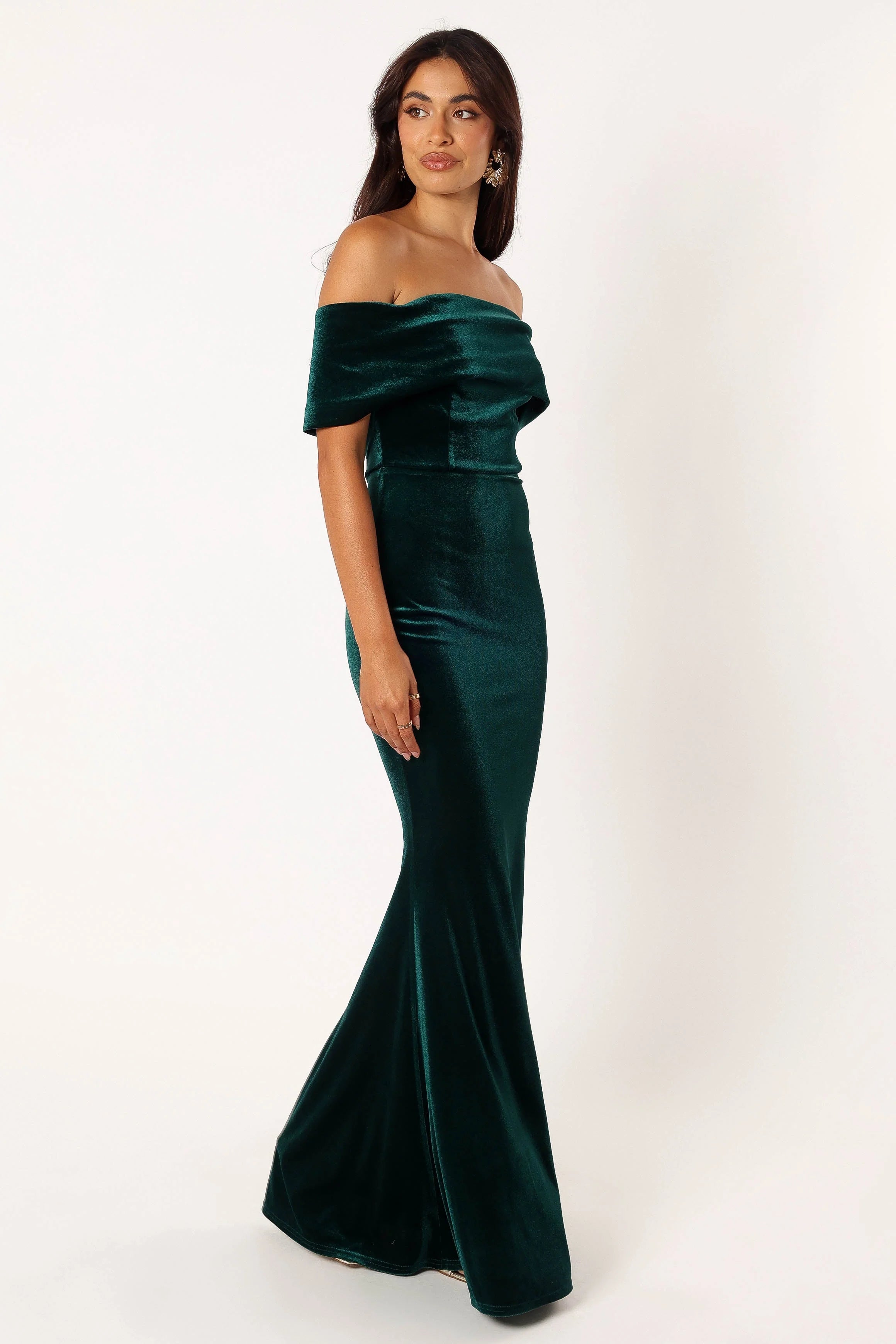DETAILS This off the shoulder style dress features an straight neckline, giving you an elegant yet modern look. Made from soft velvet stretch material in a rich green color, this dress is designed for comfort while still being stylish and chic this holiday season.