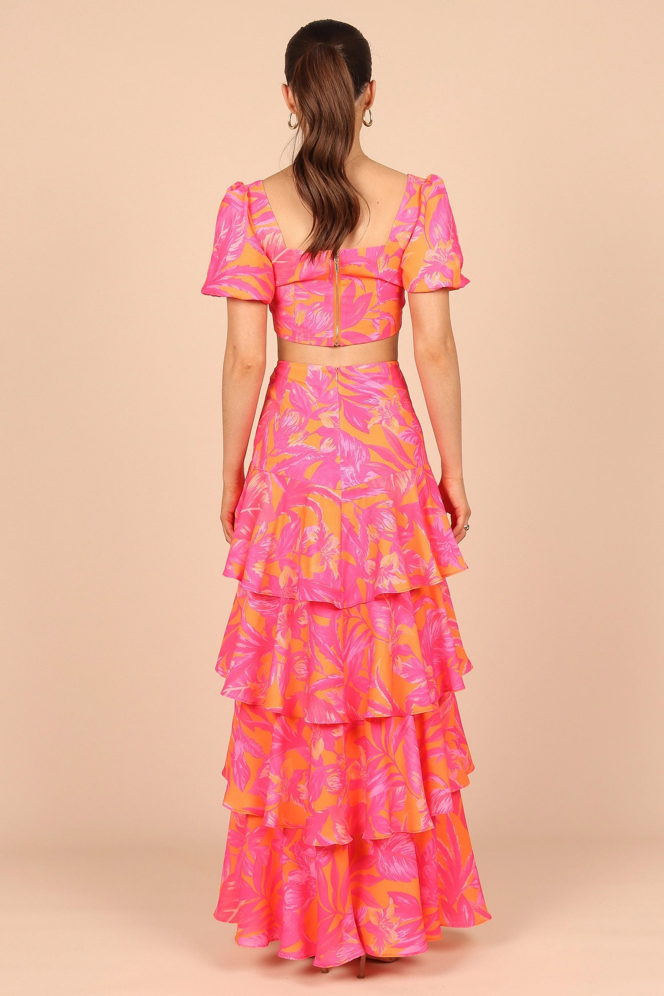 | DETAILS Are you looking for a skirt that can turn heads? Look no further than this stunning high waisted maxi skirt! The bright pink floral print is sure to make a statement, while the drop tiered ruffle detail adds a flirty and feminine touch.