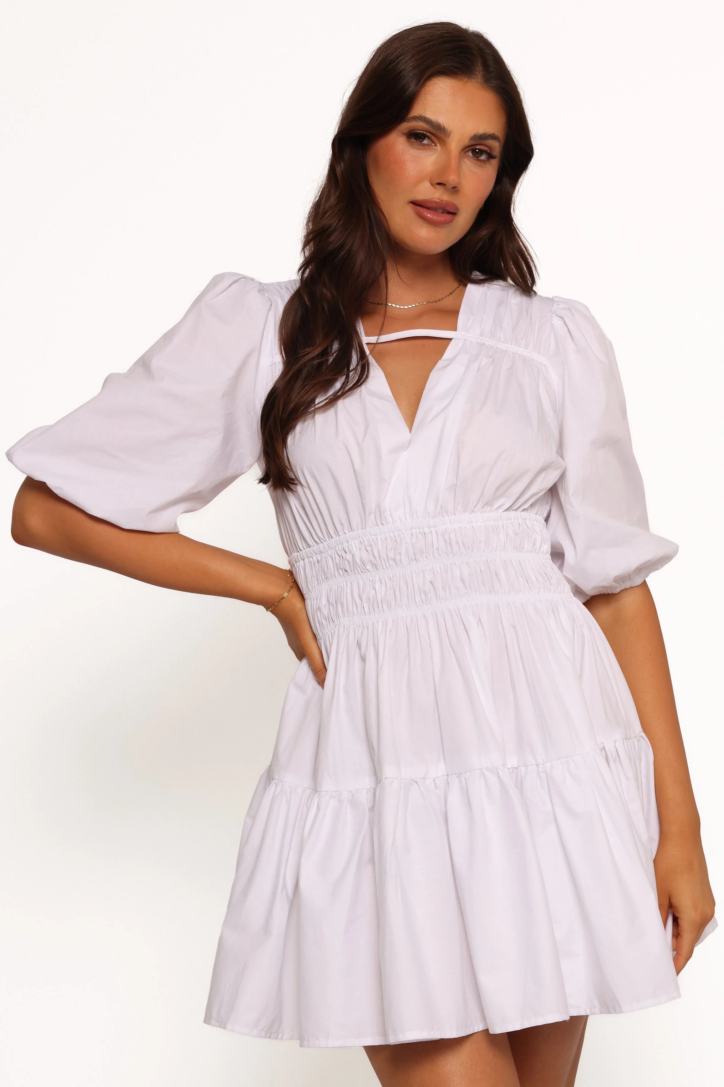 DETAILS Step into the spotlight with the Alessia Mini Dress in White - a perfect blend of elegance and playful charm. The mini length showcases your legs, while the v neckline adds a touch of sophistication and the short sleeves with elasticised cuffs give a relaxed yet polished look.
