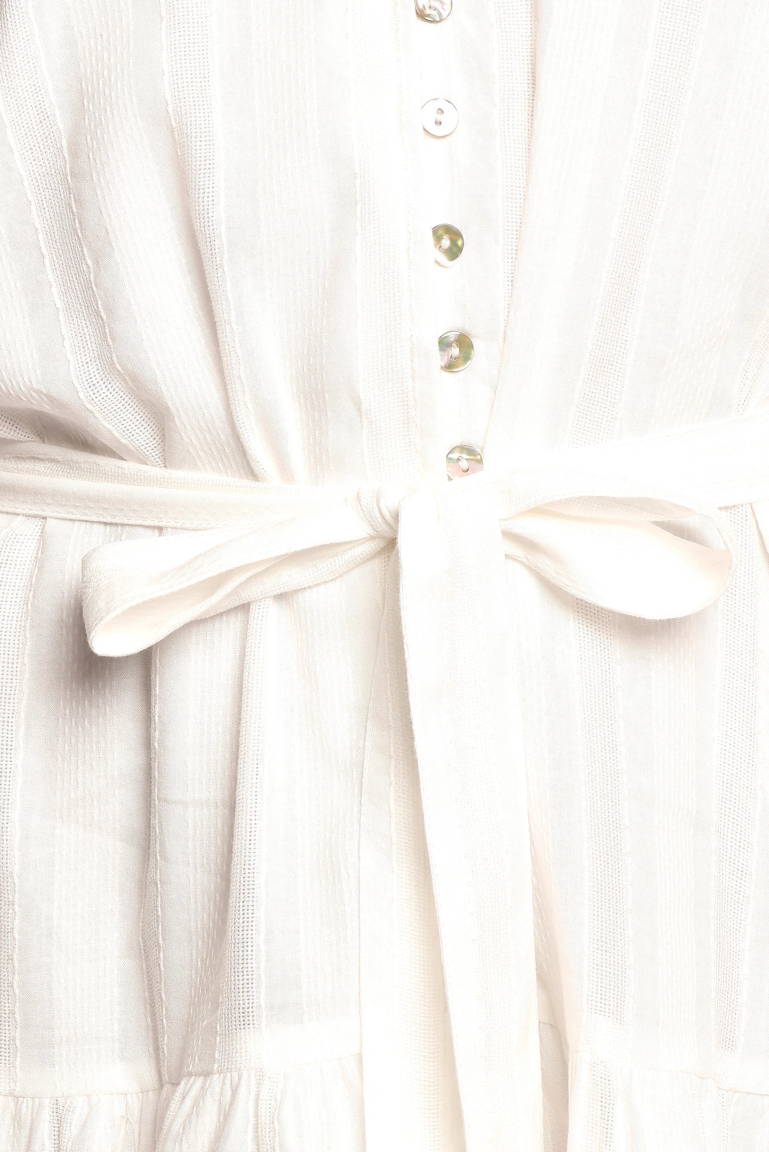 DETAILS The Alex Mini Dress in White is your new go-to for effortless chic. With its flattering mini length and timeless v-neckline, the functional buttons down the front and a detachable belt allow you to personalize your fit, while the delicate lace trim detail elevates the look with a hint of elegance.