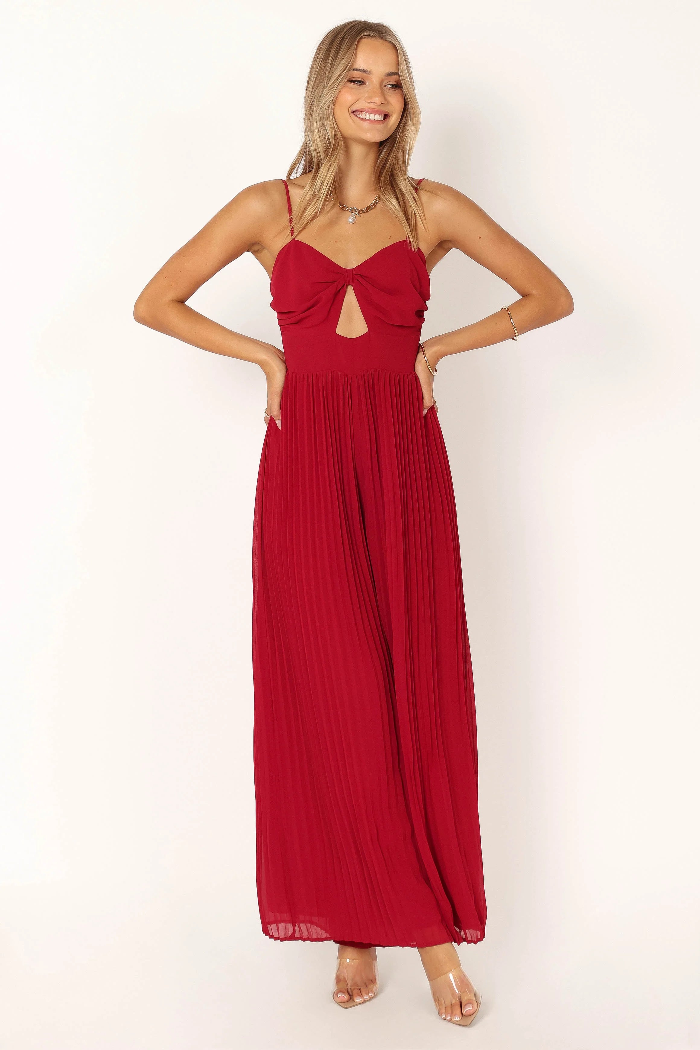 DETAILS Meet your all-in-one red jumpsuit! This wide leg jumpsuit is the perfect combination of comfortable and stylish. The sweetheart neckline, thin adjustable straps, and knot bust detail exude a feminine charm while the bodice cut-out adds an edgy element.