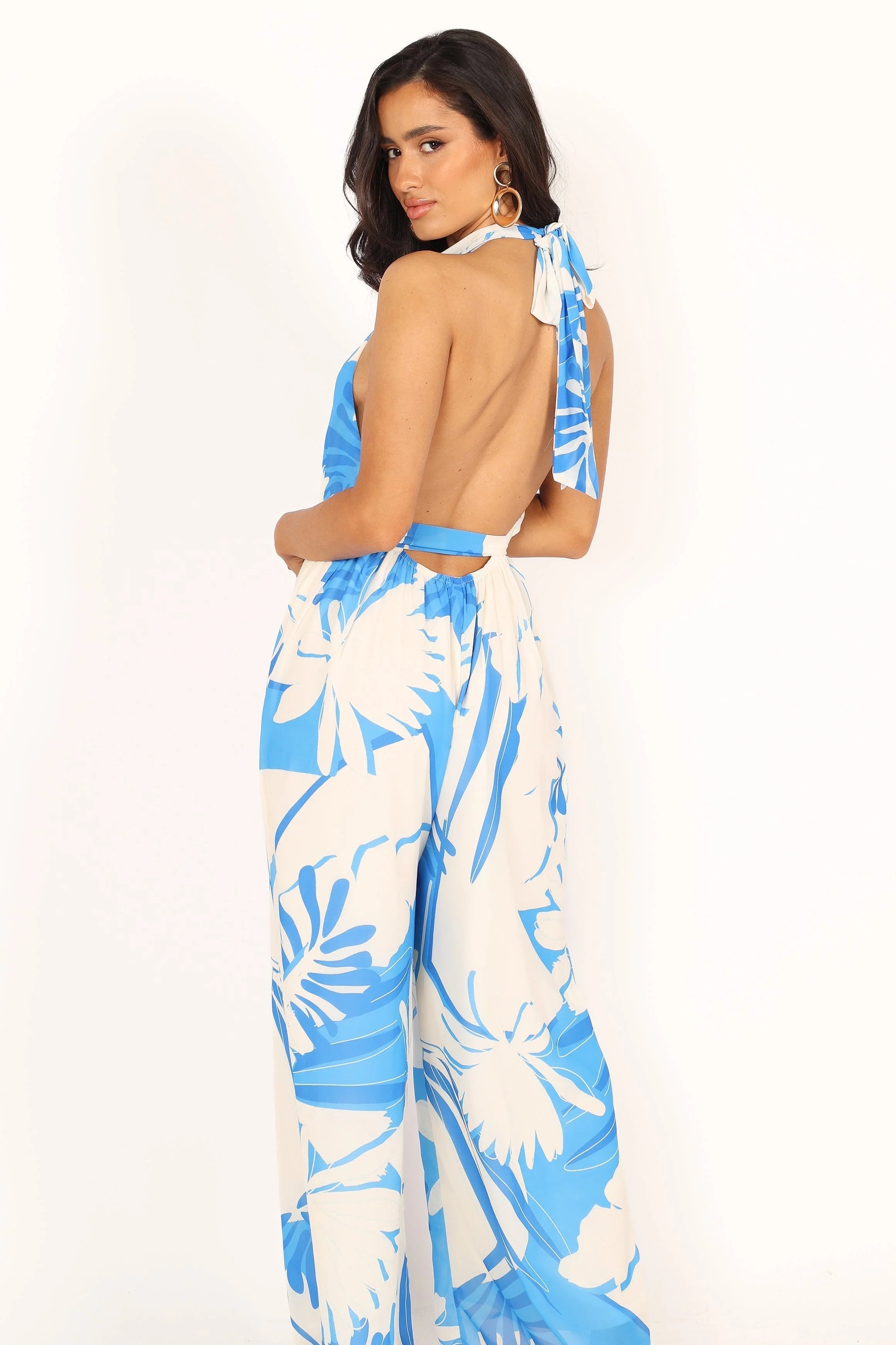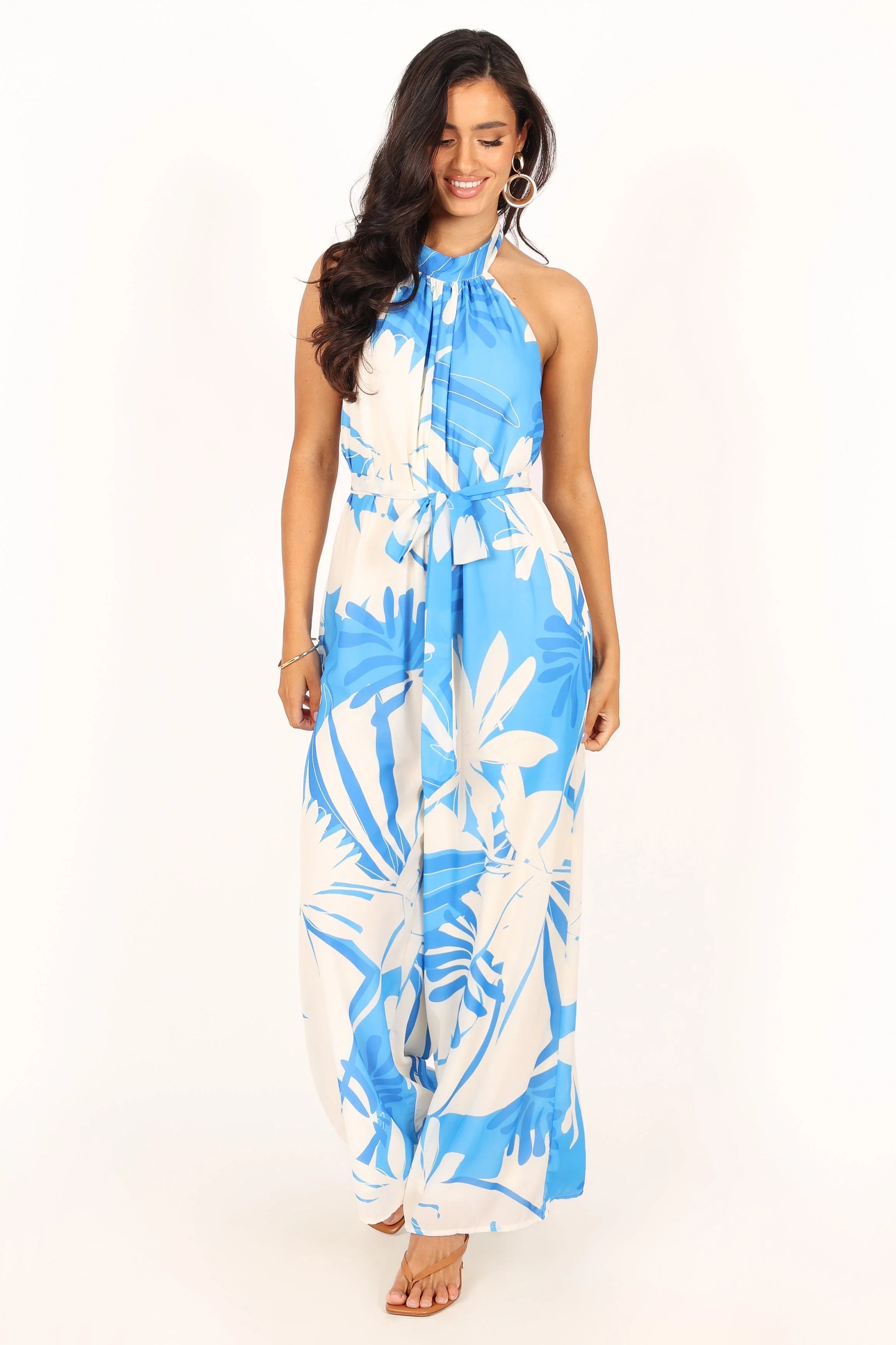 DETAILS Are you looking for a jumpsuit that is stylish and comfortable at the same time? Look no further than this beautiful blue floral jumpsuit! The halterneck neckline with tie close ensures an effortlessly chic look, while the open back feature adds a touch of femininity.