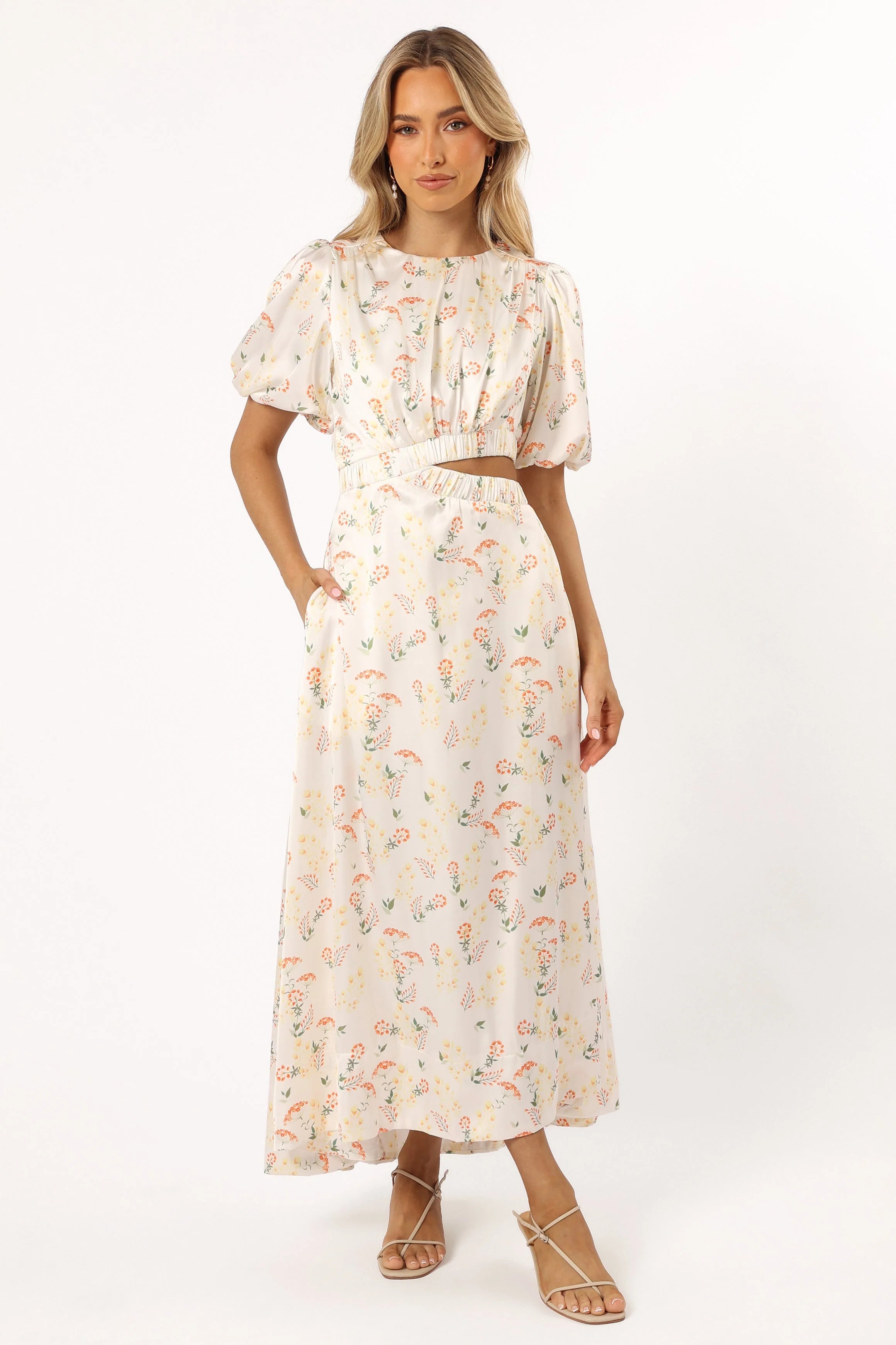 DETAILS Looking for something to wear? Look no further than this maxi dress! With a round neckline, mid sleeves with elasticised cuffs, side cut outs and an elasticised waistband, it will give you a flattering silhouette. Plus it has functional pockets and a high-low hemline, perfect for whatever the day brings!