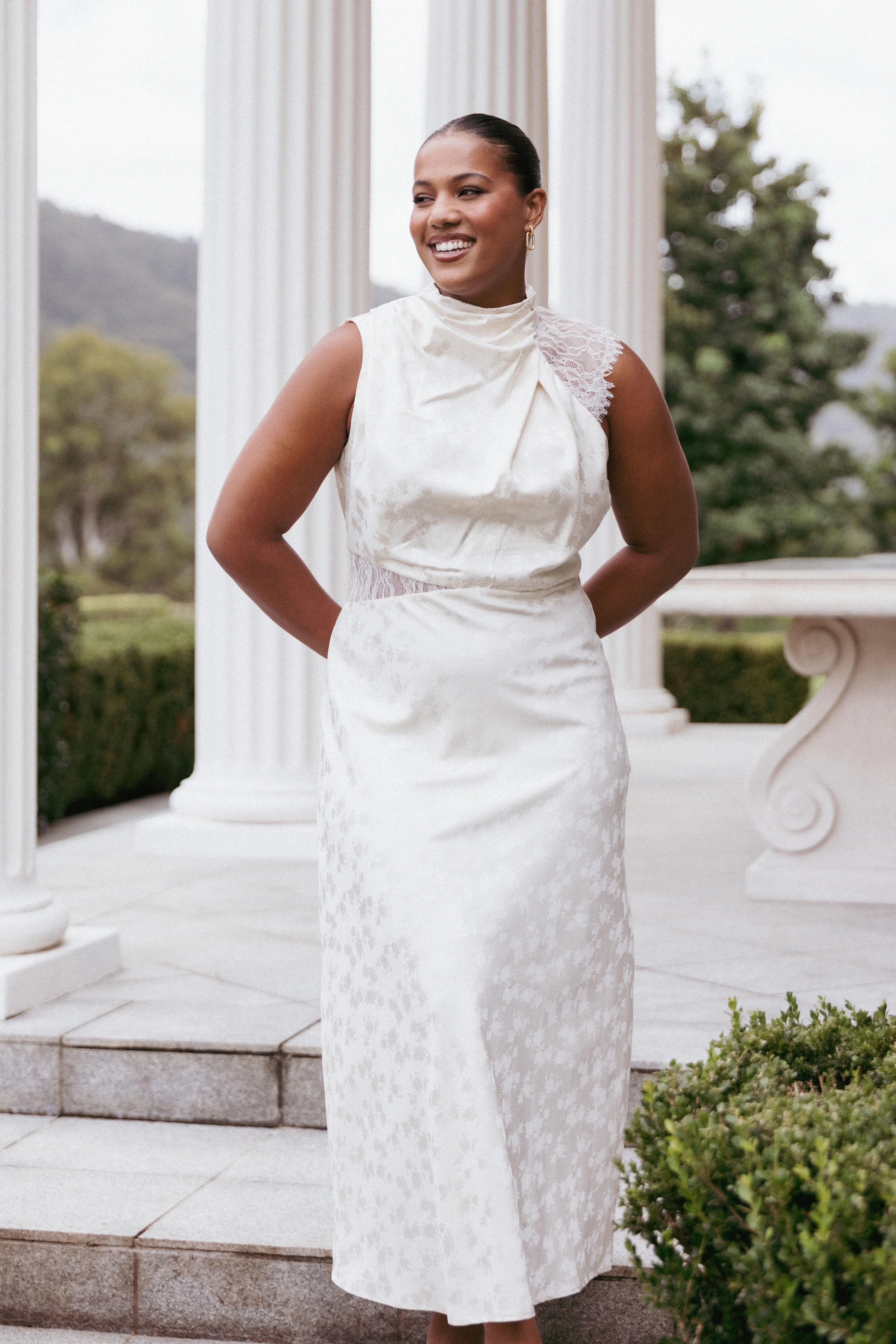 DETAILS Designed with a maxi length for a sleek silhouette, this dress features a sleeveless design and an asymmetric high round neckline that exudes modern elegance. Intricate lace detailing adds a touch of allure, while the oversized floral print ensures a bold, fashion-forward statement.