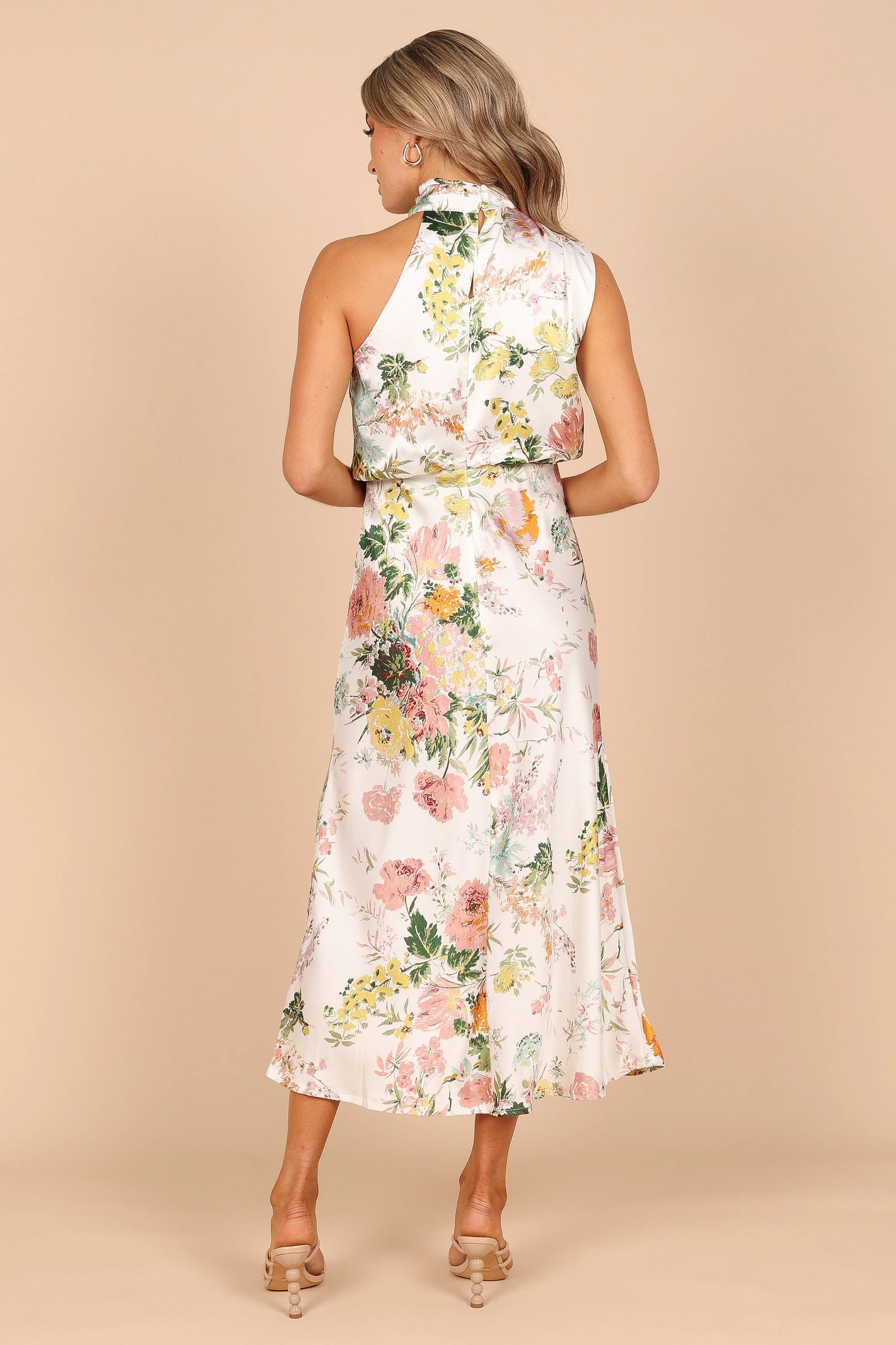 DETAILS Look and feel your best in this stunning event wear dress! Featuring a midi length, an asymmetric high round neckline with gathered pleat detail, plus a back neck opening with button close, it's the perfect party dress for any special occasion. Not only does it look fabulous, but it feels as good as it looks too, crafted from a soft satin feel just for extra comfort.