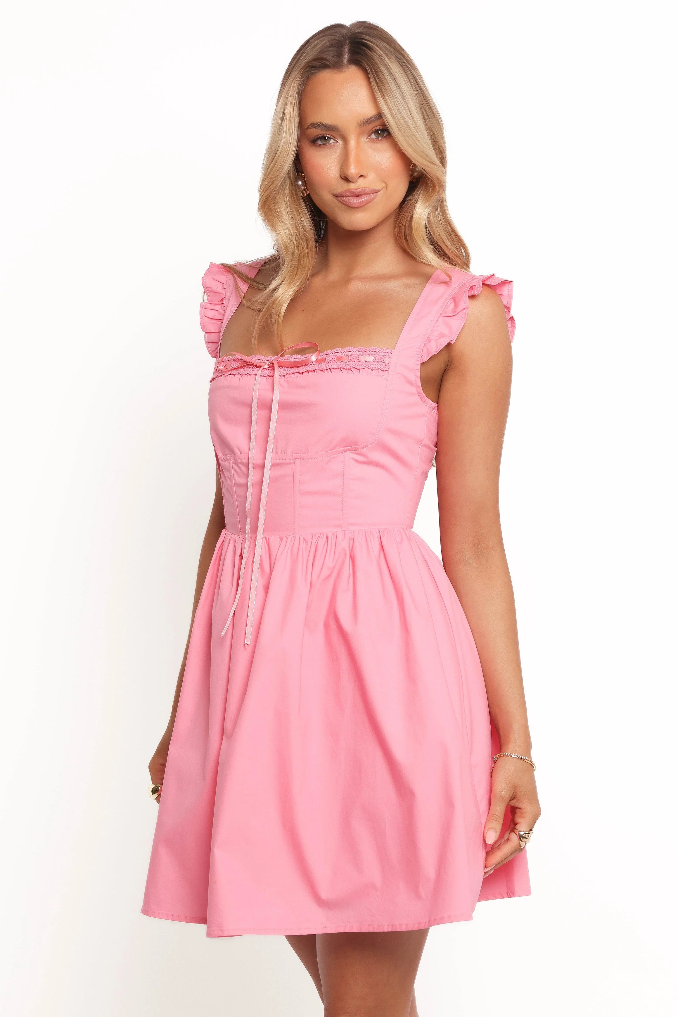 DETAILS Step into the spotlight with the Anastasia Mini Dress in Pink, the perfect addition to your wardrobe for any occasion where making a statement is key. The corset bodice, complete with structured boning, ensures a flattering fit that accentuates your silhouette, flowing into an A-line skirt that allows freedom of movement.