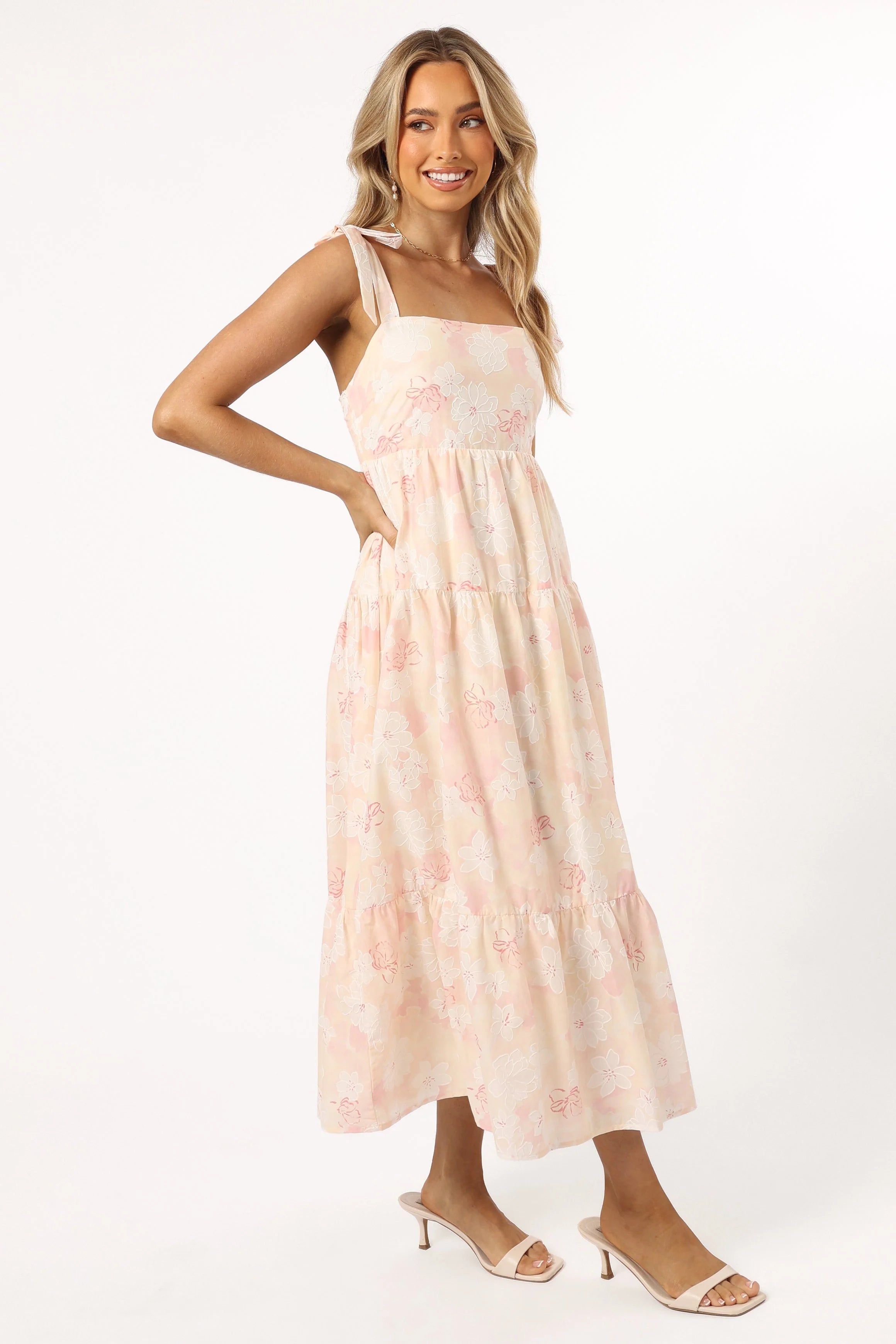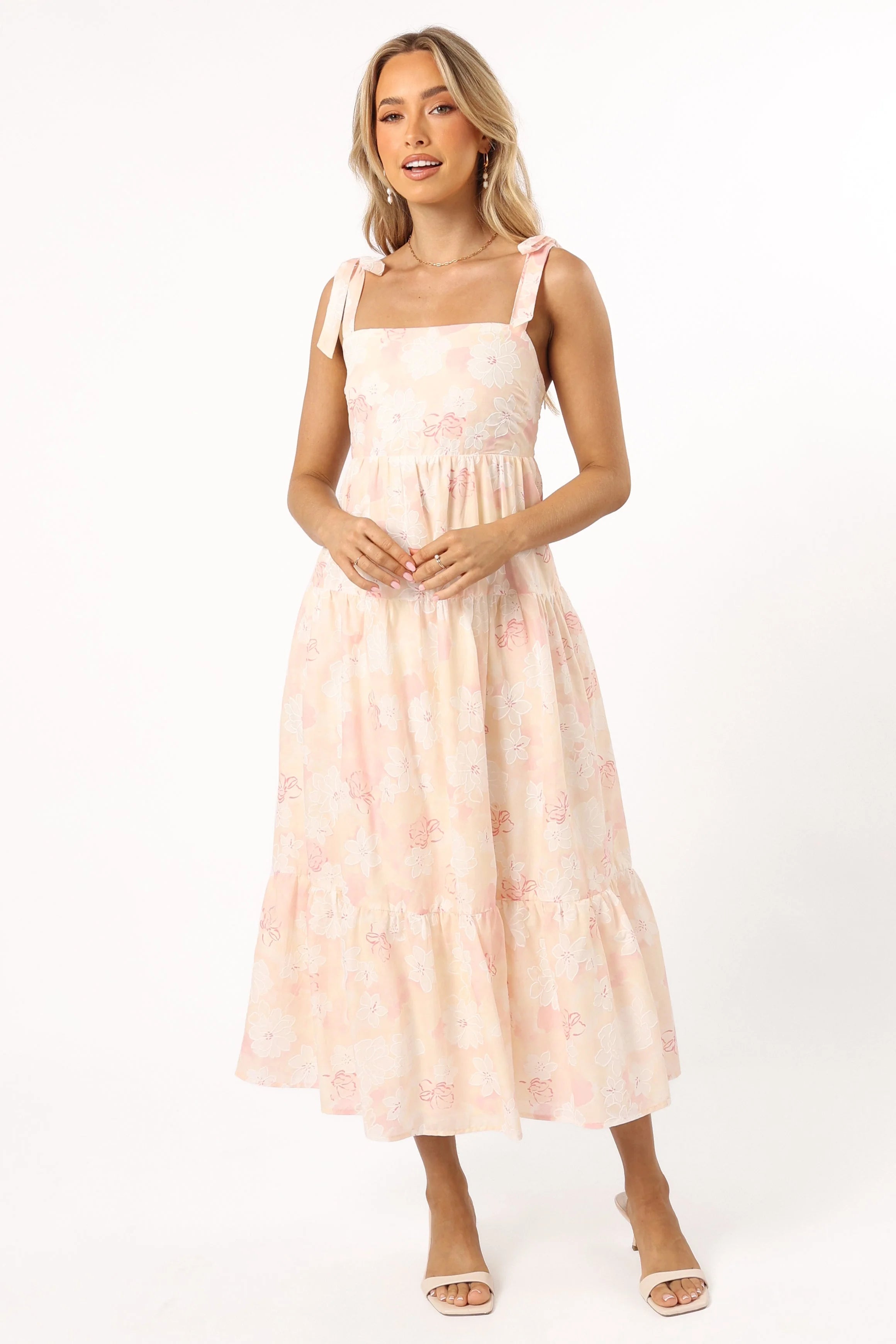 DETAILS Step into spring with style in our sleeveless midi dress featuring a charming square neckline, adjustable tie shoulder straps, and a delightful pink and white floral pattern. Fully lined for comfort. Browse our collection today!