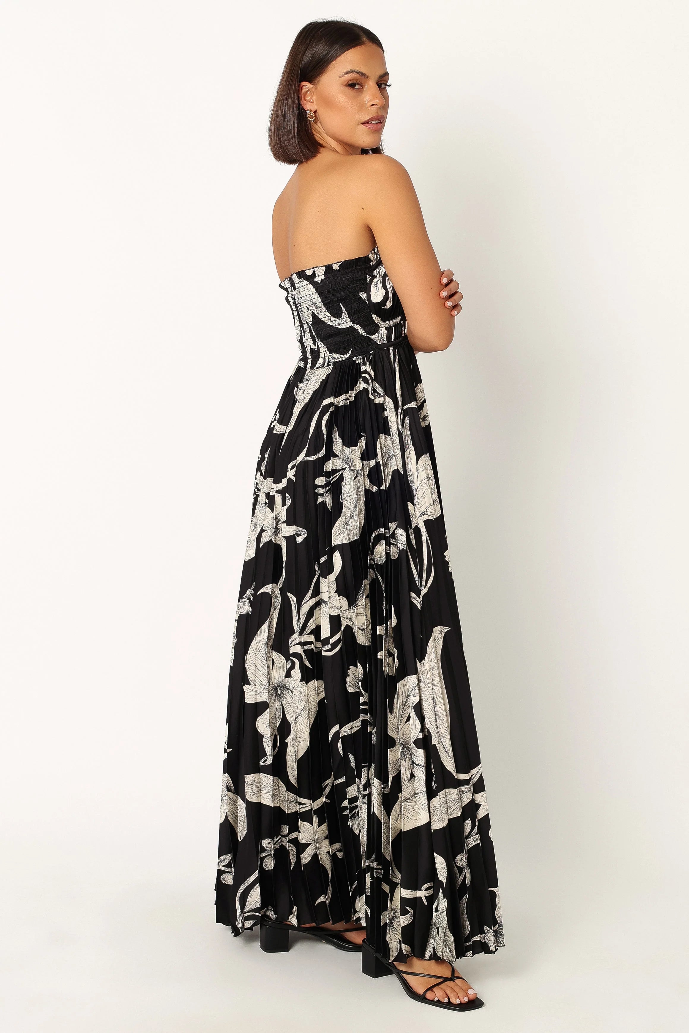 DETAILS Do you want to make a statement this summer? Look no further than the stunning maxi length dress. This strapless style with its straight neckline and shirred back is perfect for any occasion. The invisible back zip with hook and eye clasp makes it easy to slip on and off.