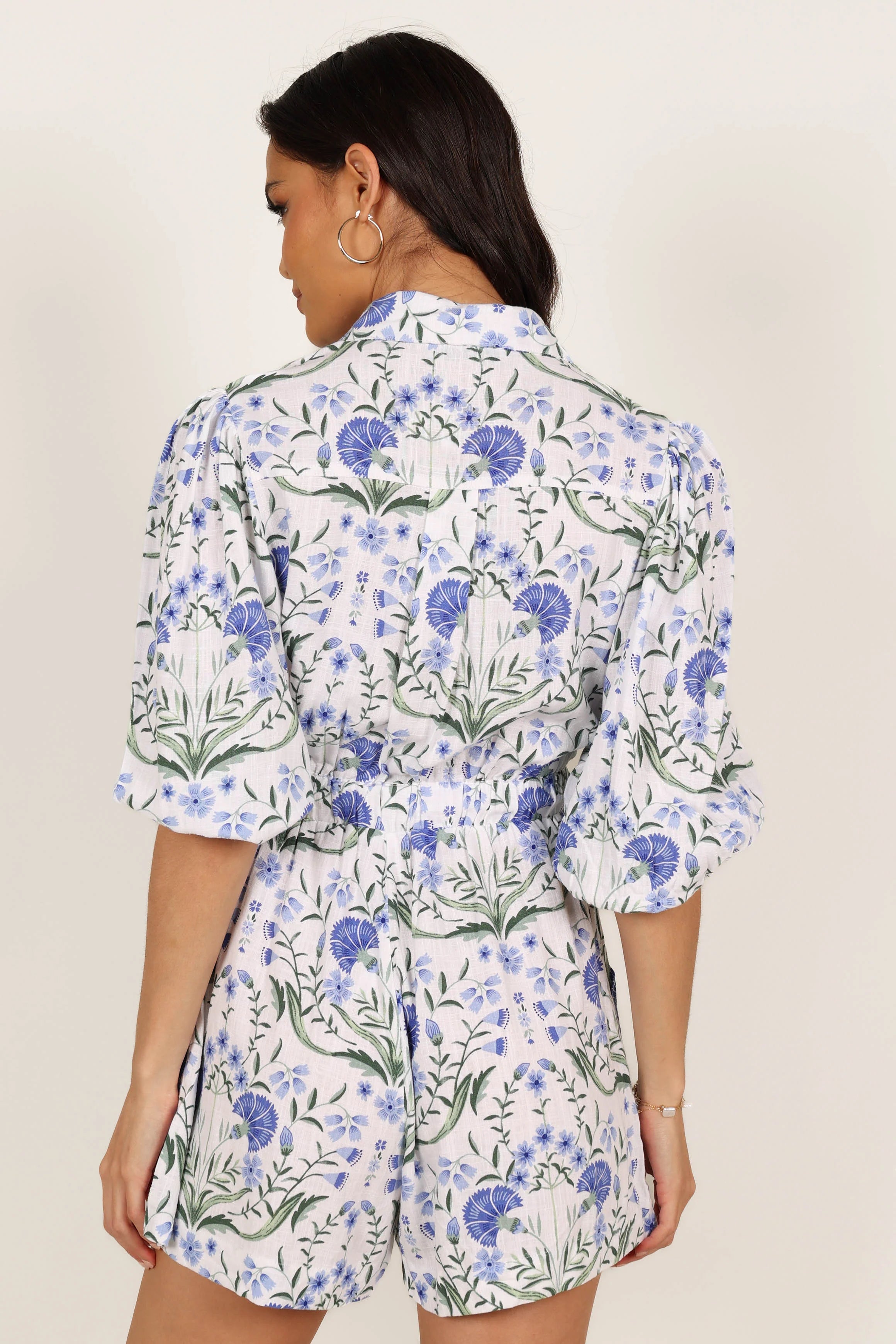 DETAILS Feel like a breath of fresh air in this playsuit! Made from linen blend, it features a beautiful floral print that's perfect for adding a little bit of fun to your look. The spread collar and v neckline flatter the figure, while long sleeves with elasticised cuffs keep you comfortable.