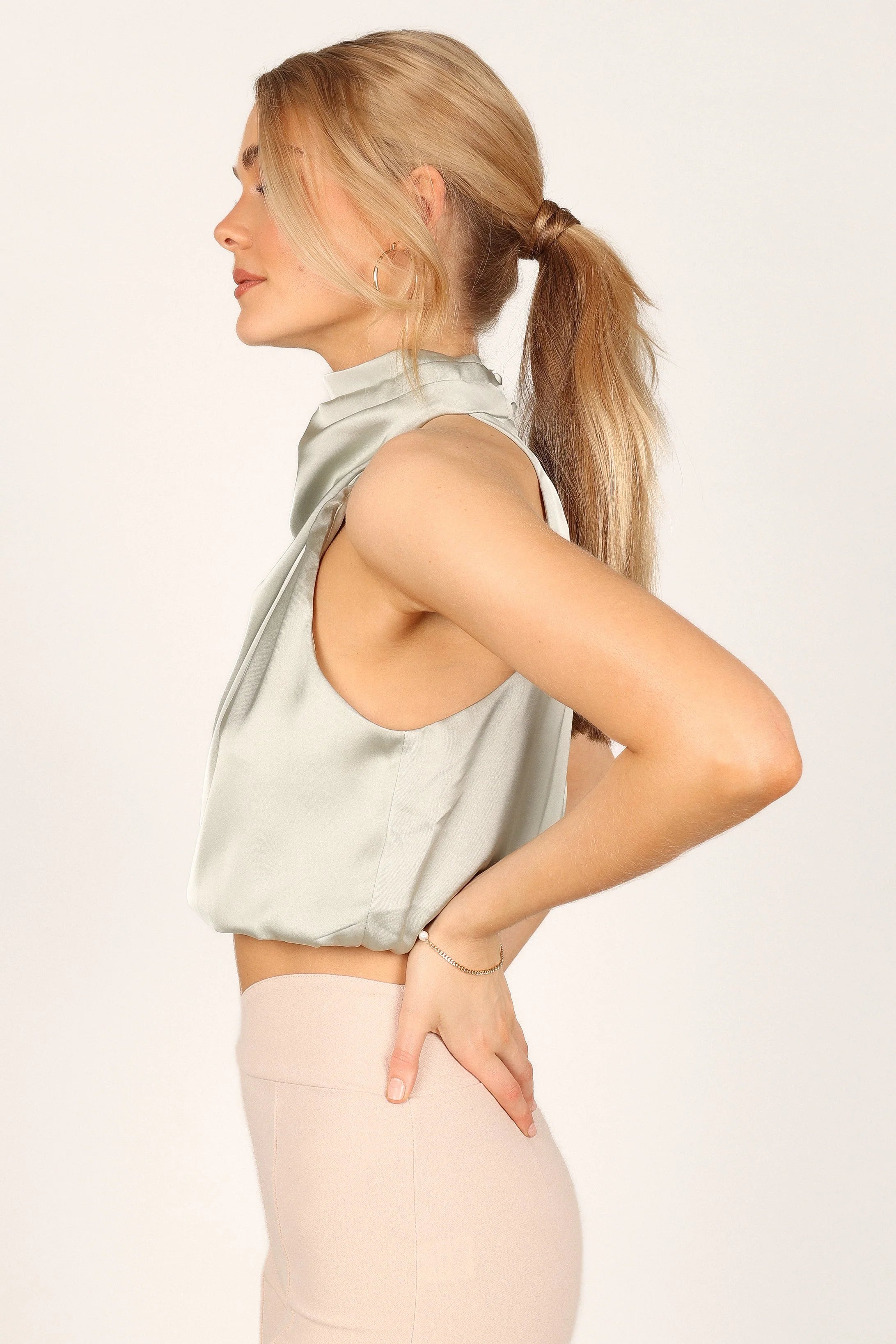 DETAILS This cropped satin top is the perfect outfit pick for any party! Featuring a high neckline with a button-close, back neck opening and an elasticised waistband, this top will keep you looking chic and sophisticated all night long.