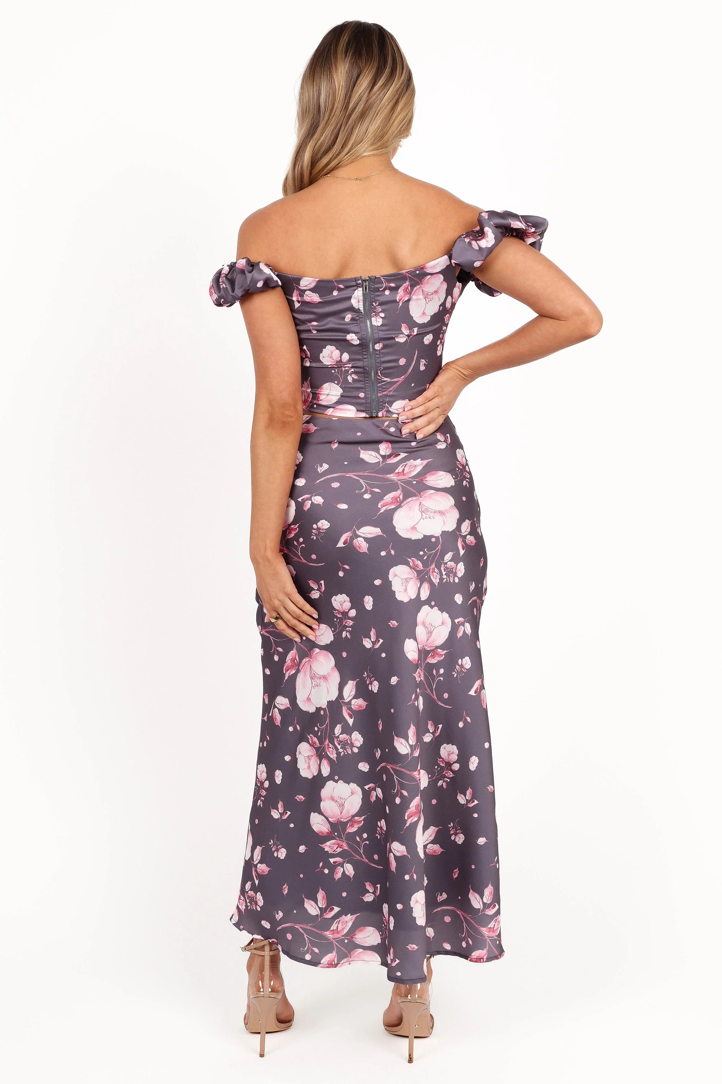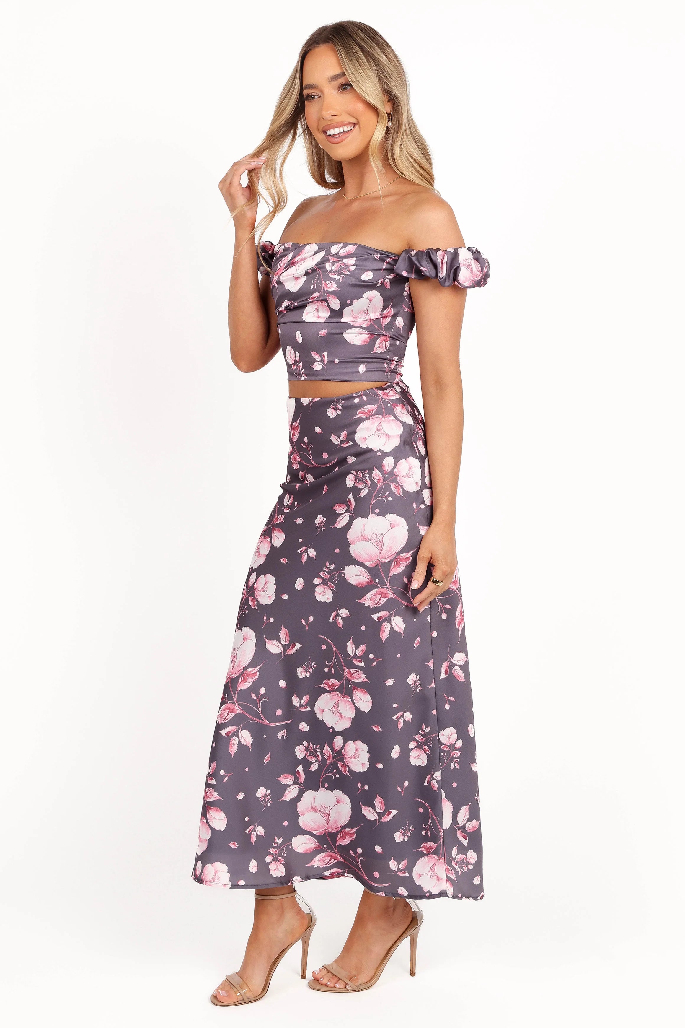 | DETAILS Show off your style in this two piece set! The top features a flattering front asymmetrical pleat design with wide elasticised straps, and a straight neckline to keep you looking chic. With a maxi length skirt and floral print, for an extra fashionable touch.