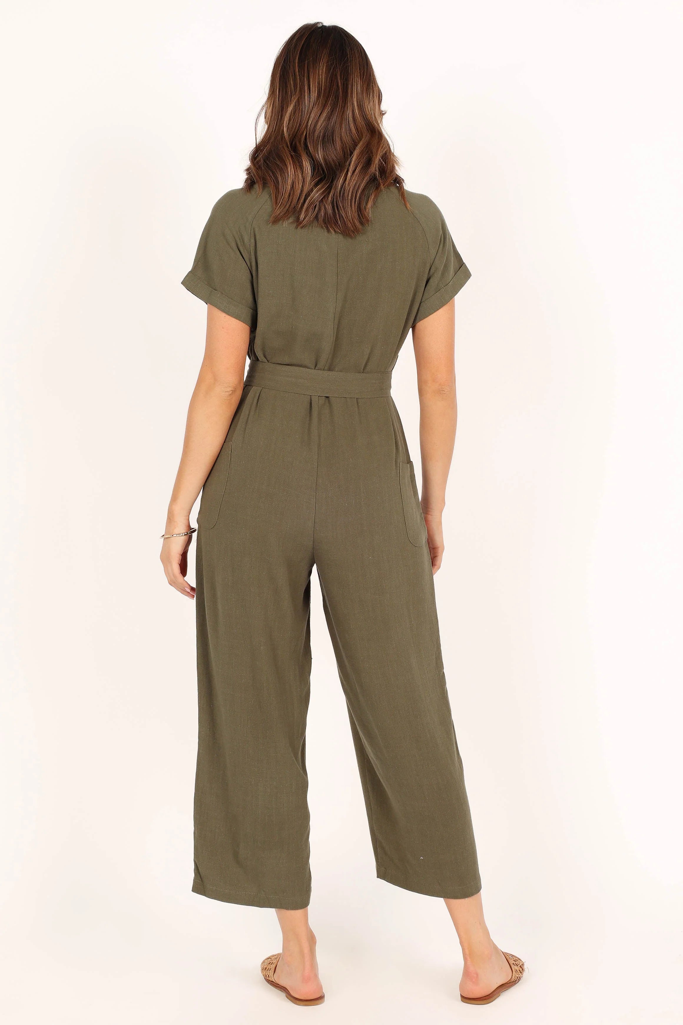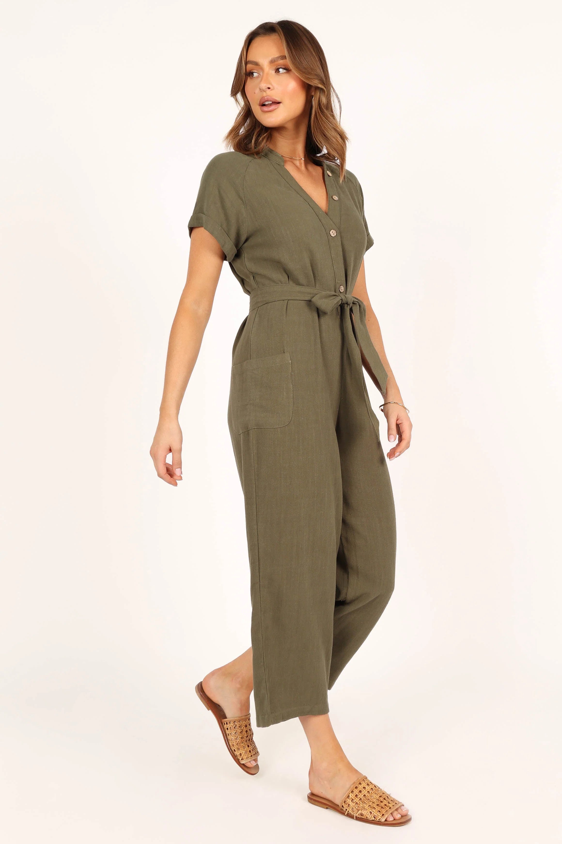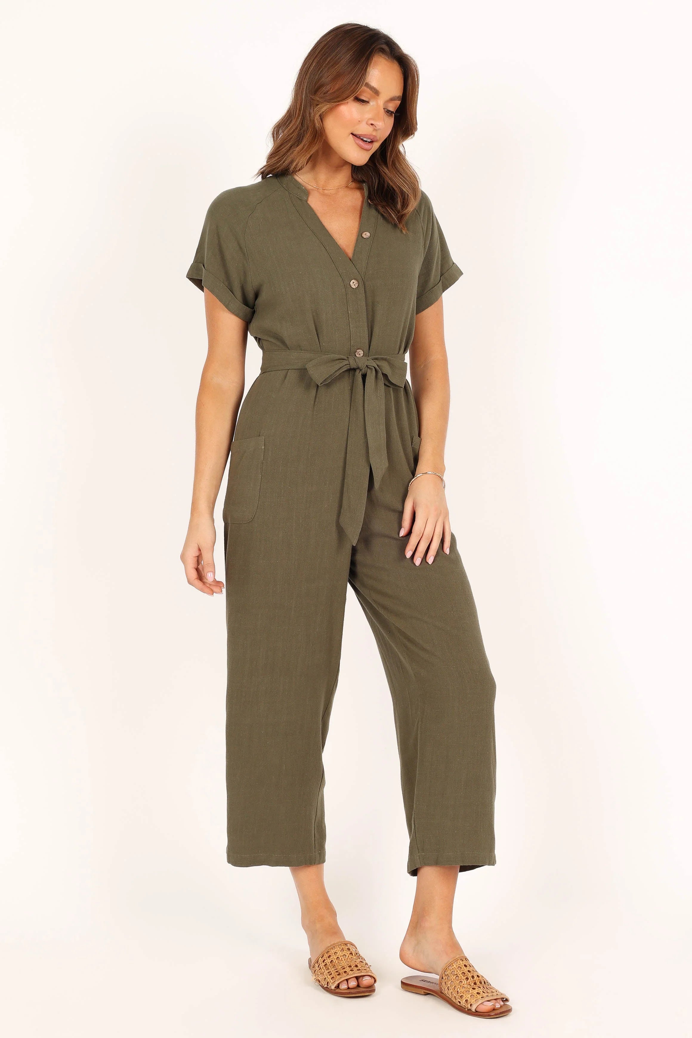DETAILS This jumpsuit is the perfect easy to wear staple for your wardrobe. With a v neckline, short sleeves, front functional button close, front functional pockets and belt loops, you'll be ready for whatever comes your way. The detachable waist tie gives you the option of cinching in your waist for when you want that extra flattering silhouette.