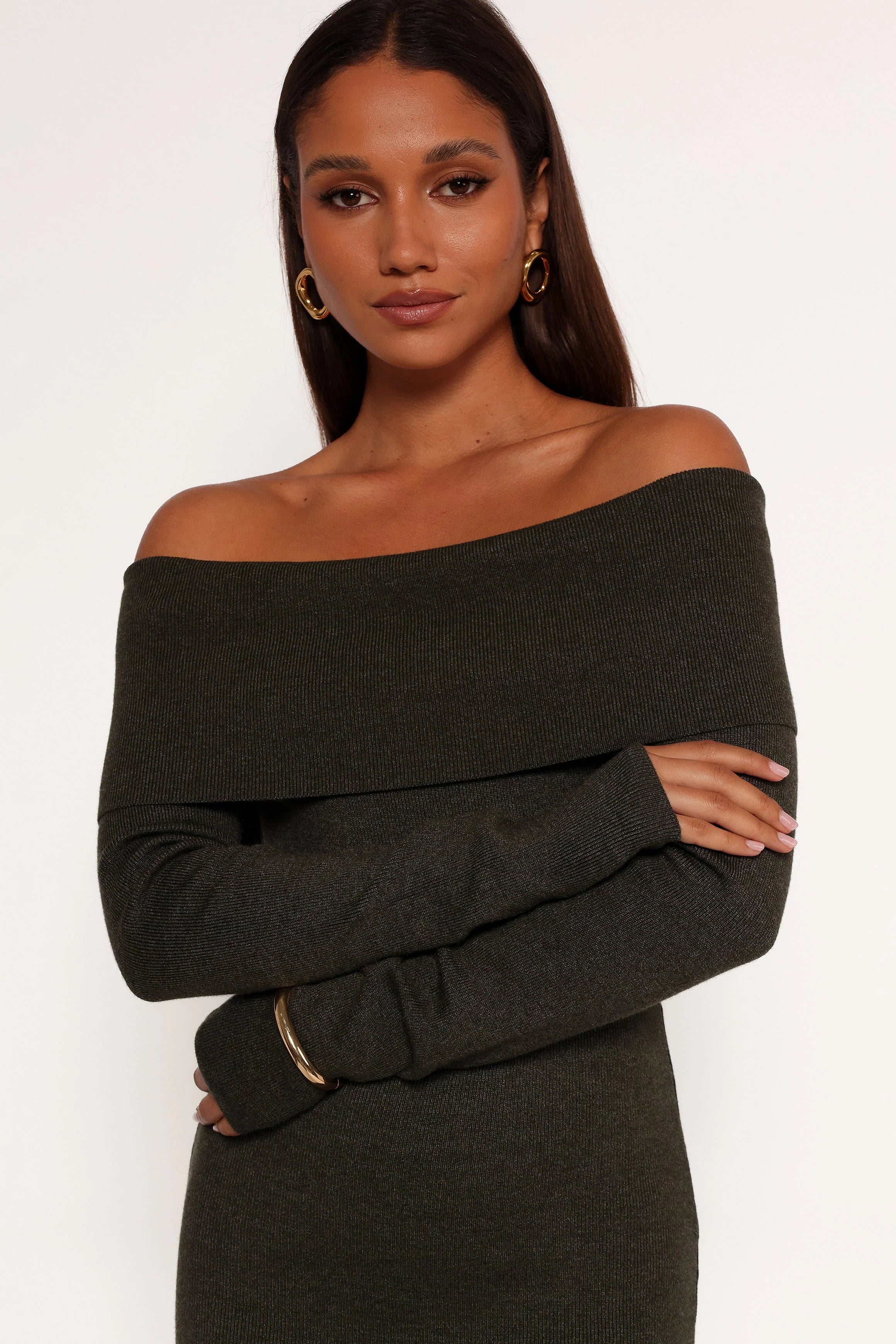 DETAILS Step into the spotlight with the Archie Off The Shoulder Midi Dress, where timeless elegance meets modern chic. Imagine the gentle caress of a midi-length ribbed knit as it hugs your curves in all the right places, a bodycon fit designed to make a statement without saying a word.