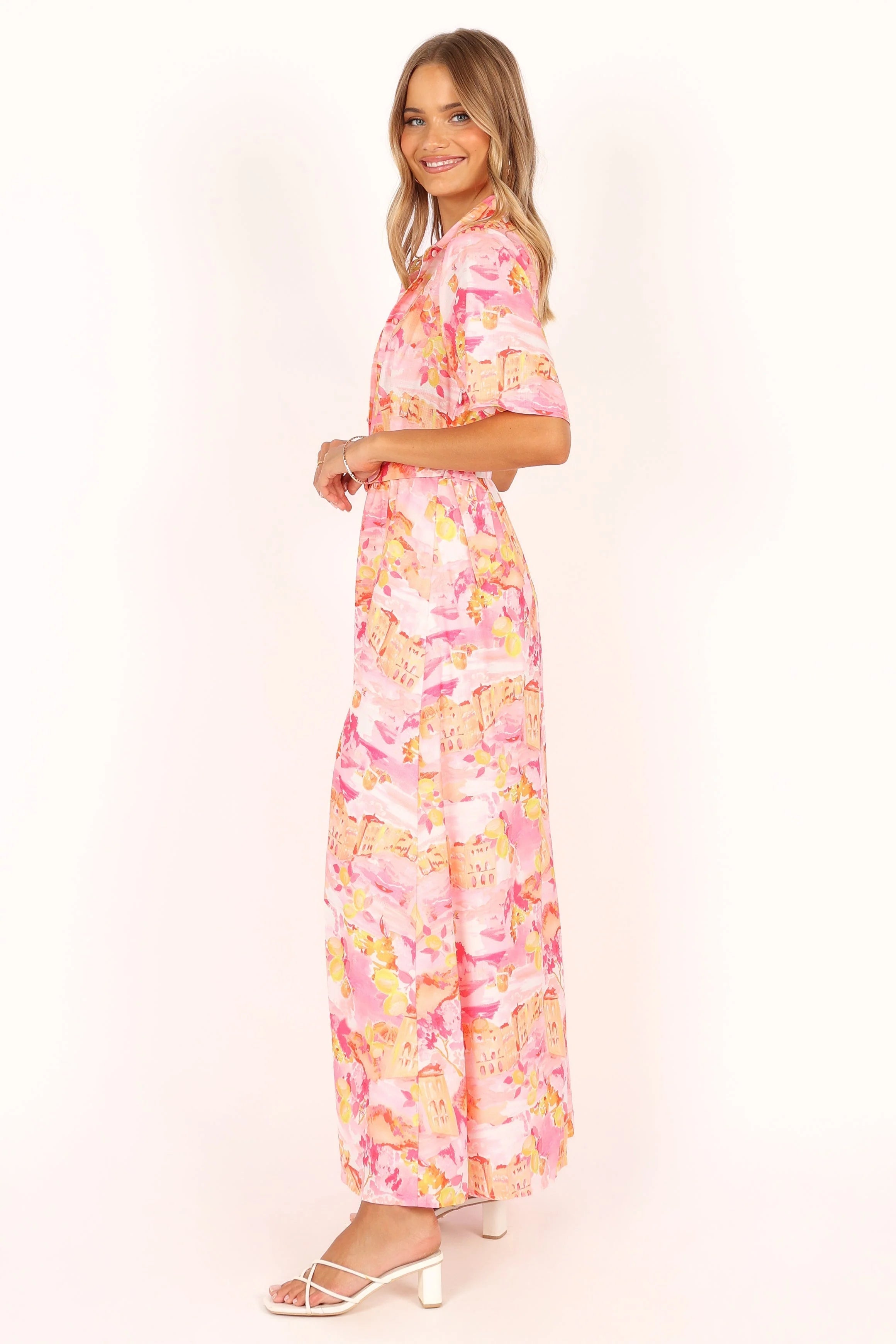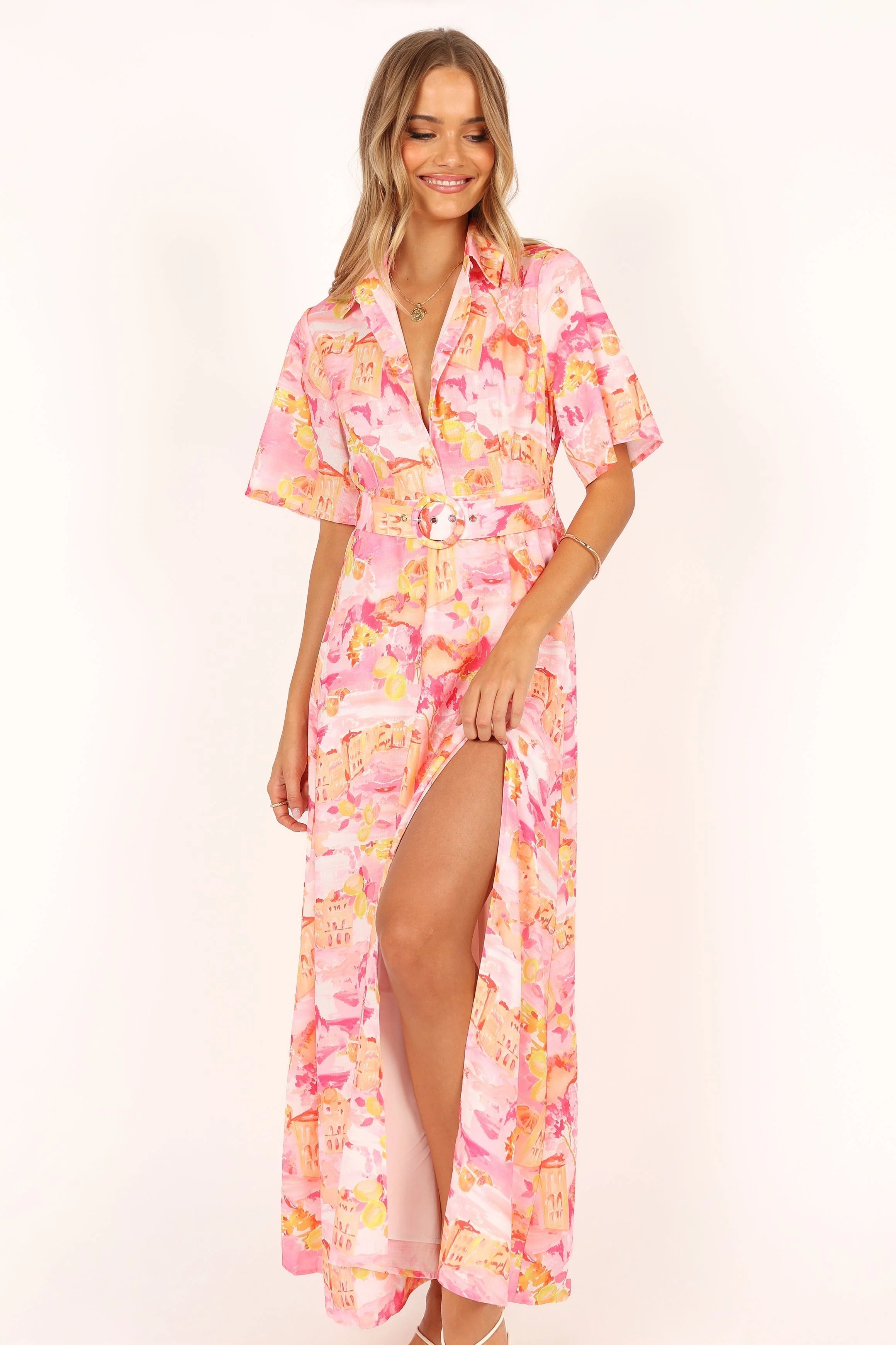 DETAILS This season, make a statement with our stunning maxi length dress. Featuring a collared neckline and partial button down front, this piece is sure to become a go-to in your wardrobe. The short sleeves create an on-trend silhouette that looks great day or night. For even more style points, the removable belt with buckle detail adds a touch of sophistication.