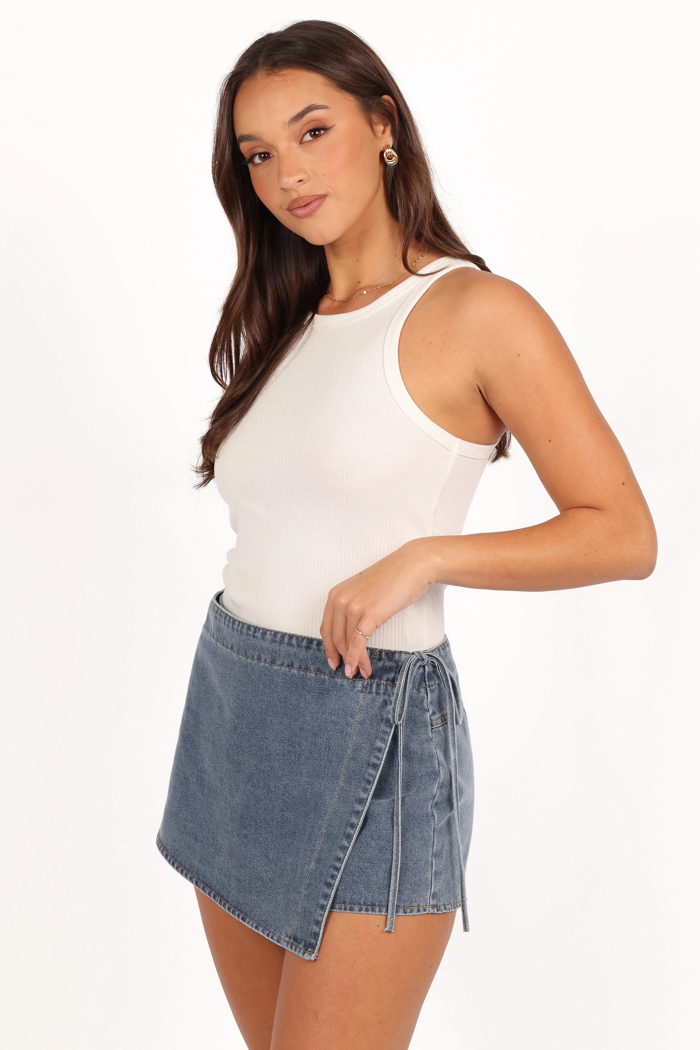 | DETAILS The Ashton Denim Skort in Medium Wash is a versatile addition to any wardrobe, combining the classic look of denim with the playful vibe of a skirt. Its mini length and high-waisted style make it a flattering choice for various body types, while the front faux wrap skirt overlay adds a unique twist to the traditional skort design.