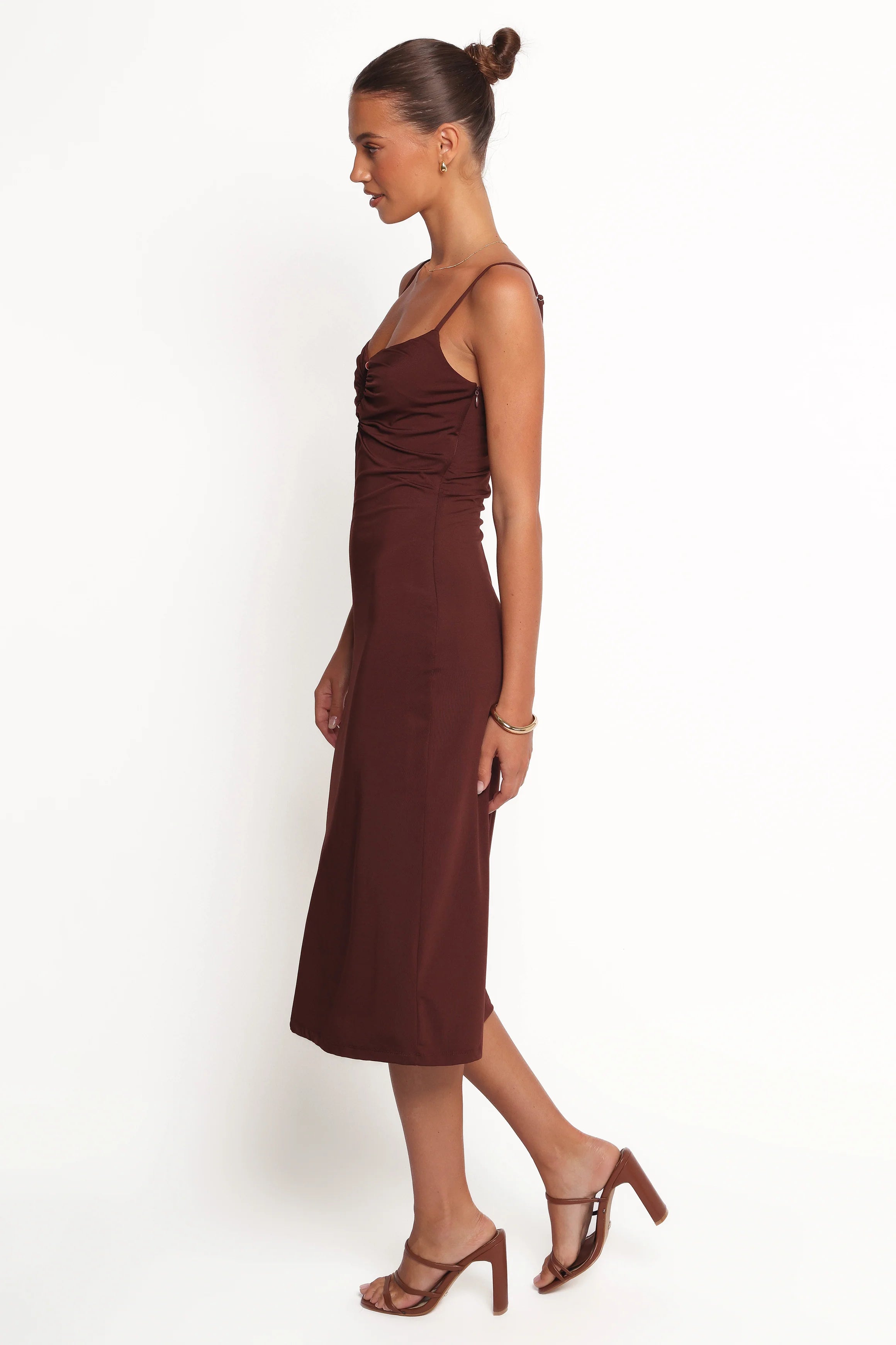 DETAILS Make a bold statement with the Ashy Midi Dress in Brown, a perfect blend of modern elegance and chic detailing. Designed with a flattering bodycon fit, this dress hugs your curves in all the right places, offering a sophisticated yet effortless vibe.