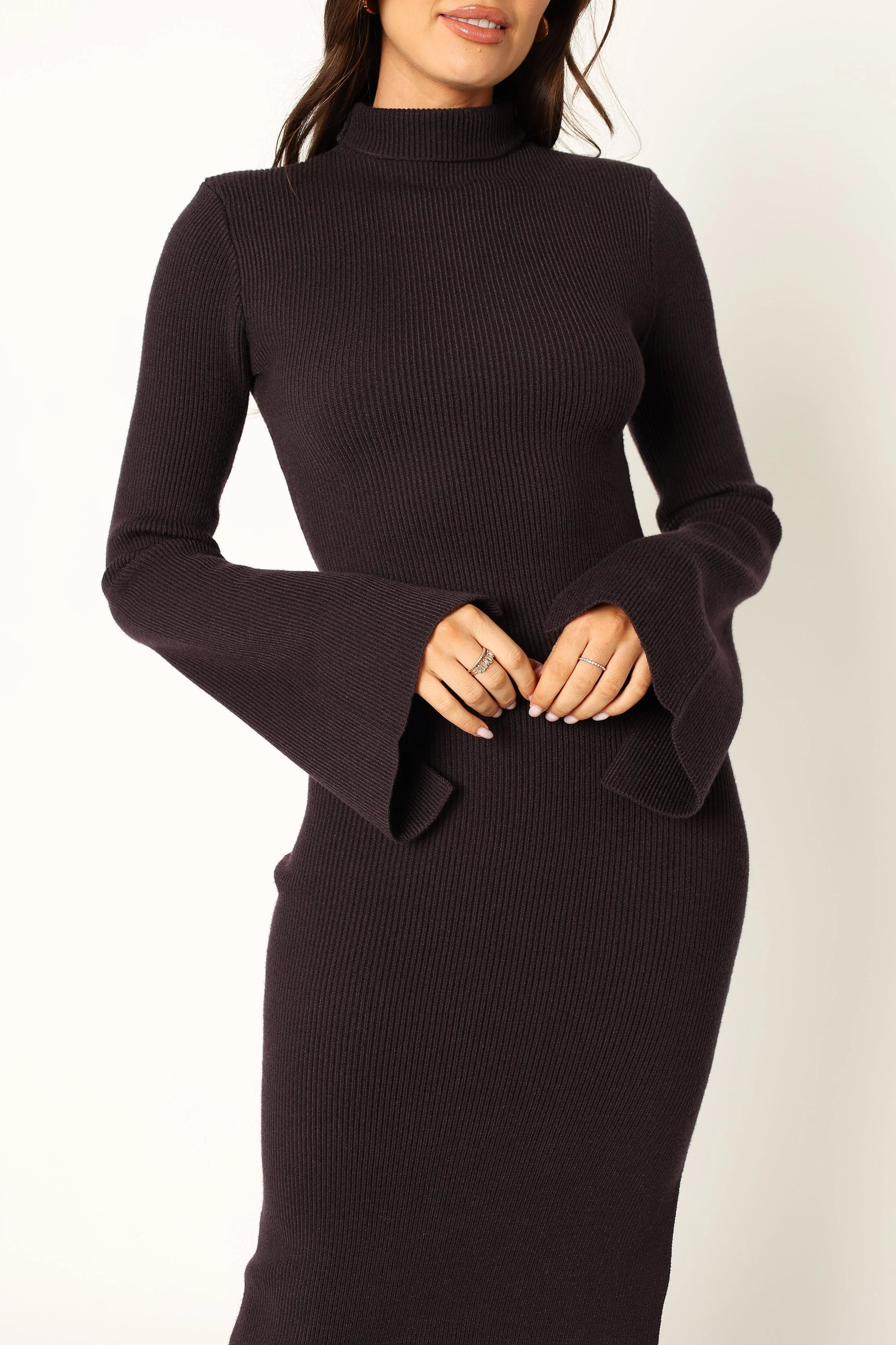 DETAILS This fashion-forward dress features a high rolled neckline and long bell sleeves, adding a playful twist to your wardrobe. Crafted in stretch ribbed knit, this midi dress offers a cozy wear without sacrificing style.