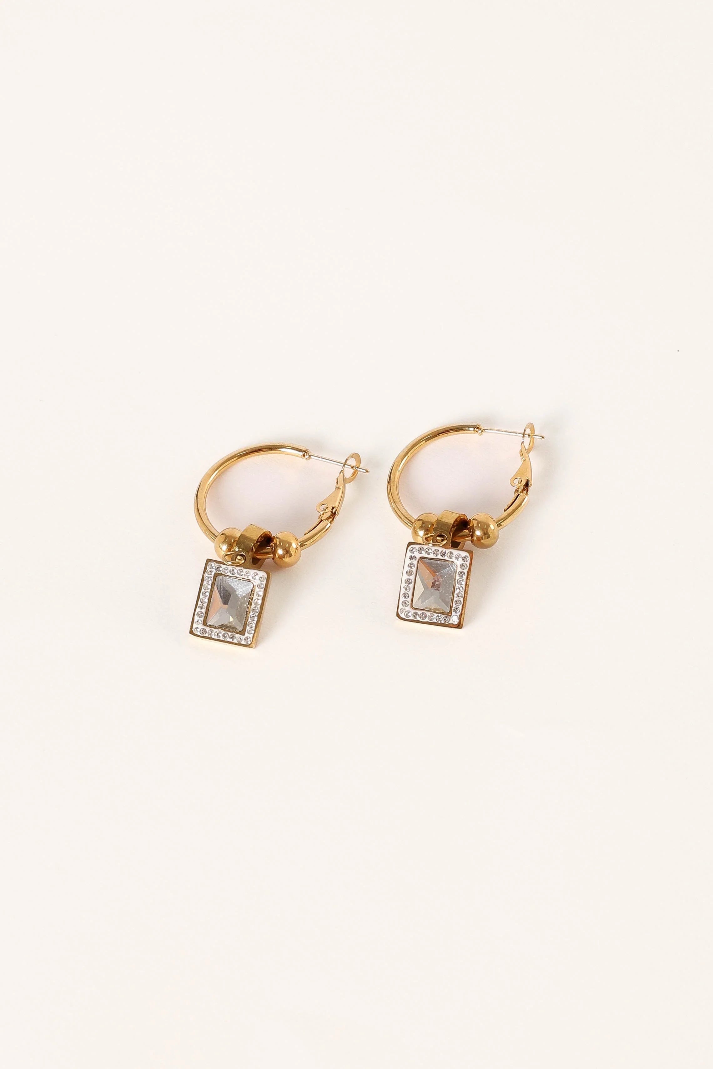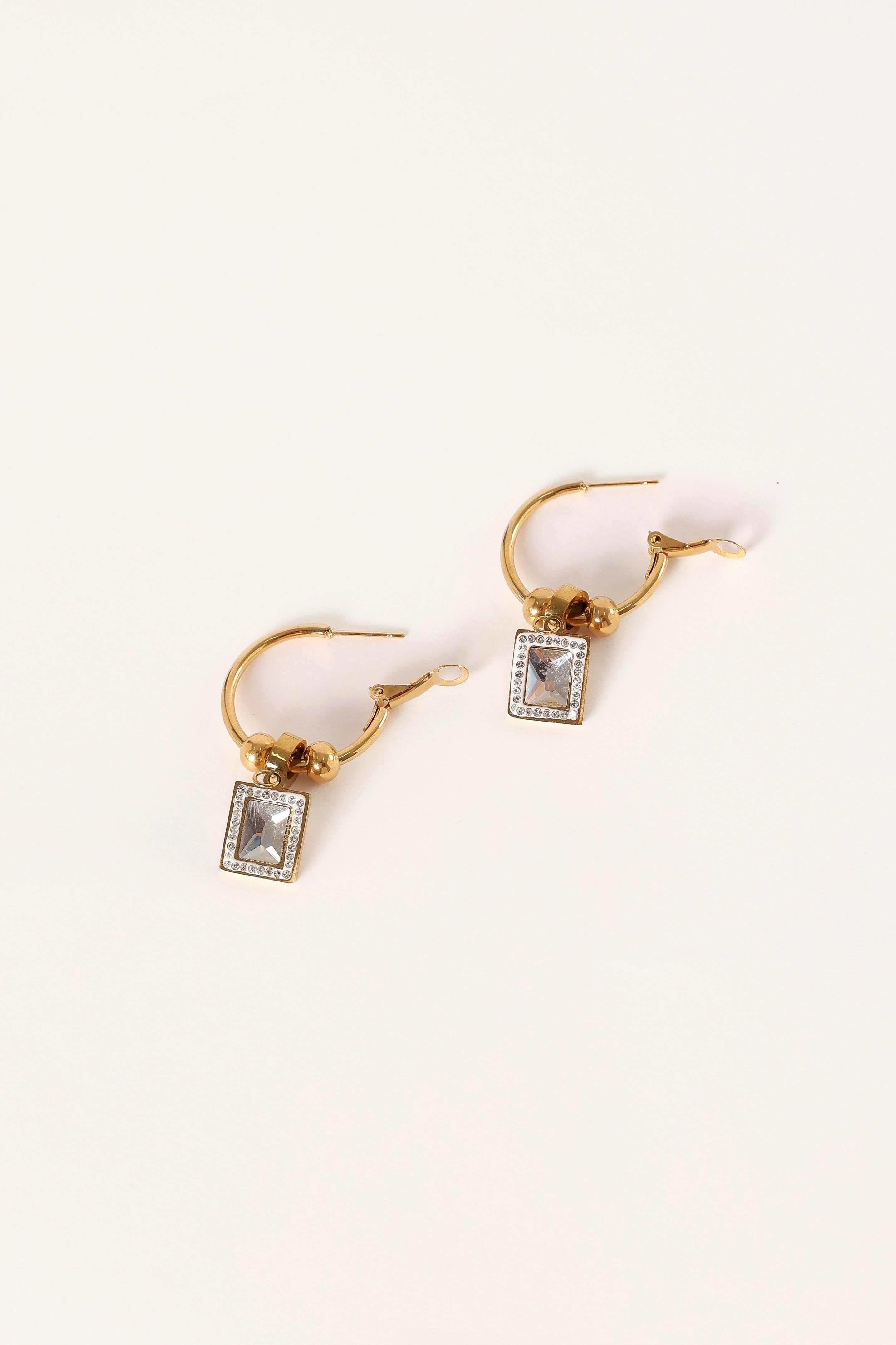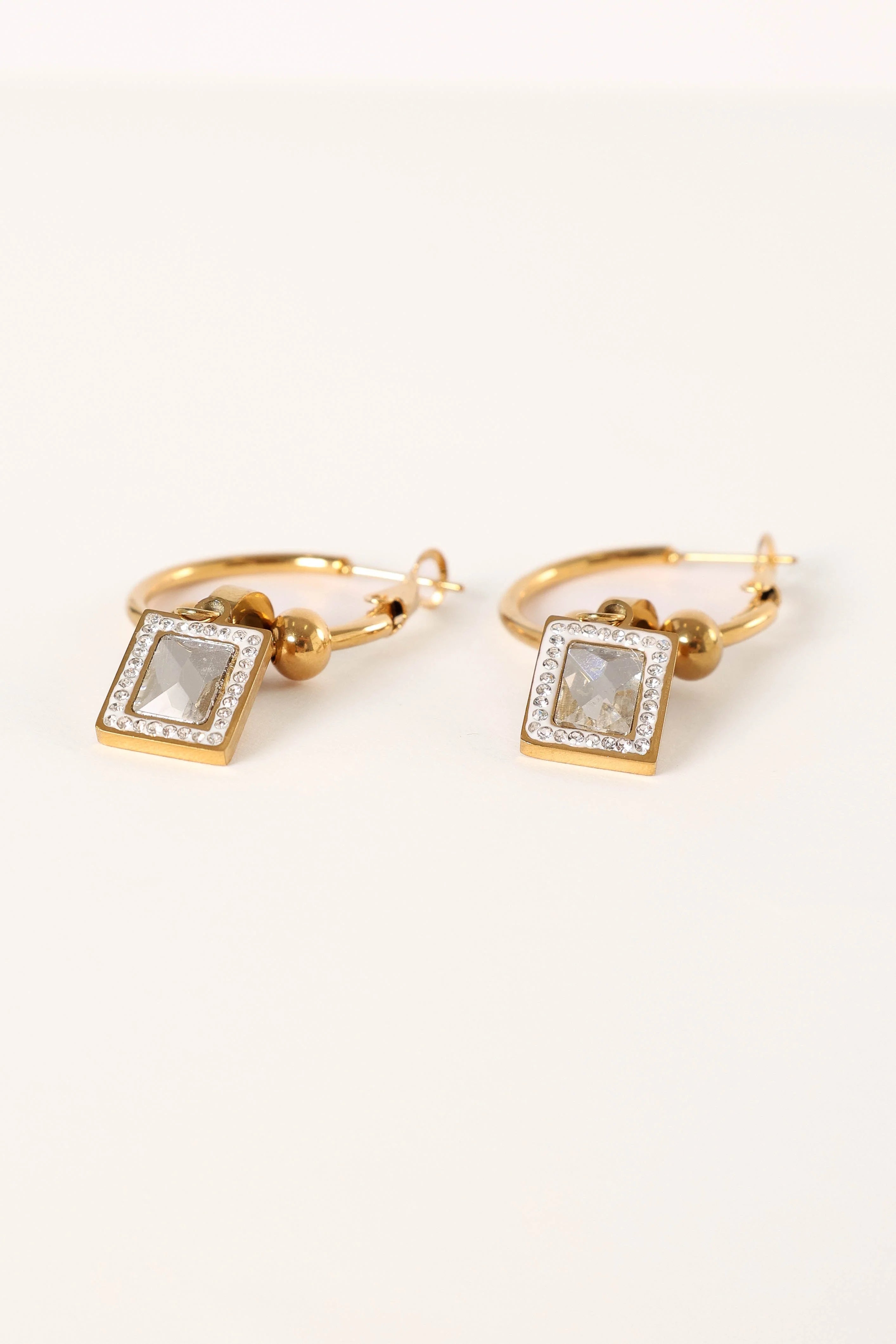 DETAILS These Audrey Charm Hoop Earrings are perfect for any fashionista looking to make a statement. Crafted in gleaming gold, these hoop earrings feature a drop square charm detail and secure with a snap closure.
