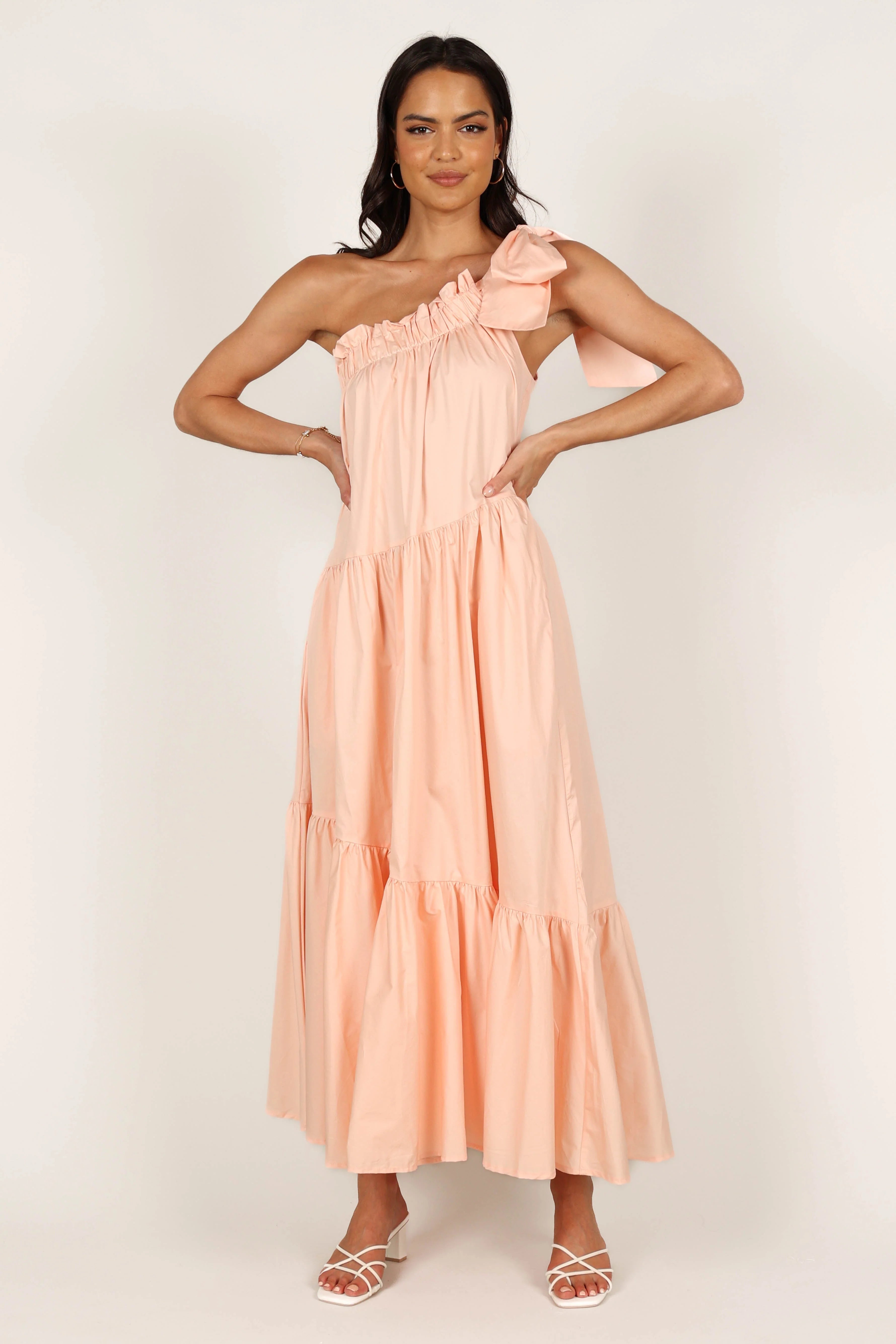 DETAILS Ready to turn heads? Make a statement with this eye-catching one shoulder dress! Featuring an asymmetrical neckline, shoulder tie detail and functional side pockets, you'll be able to keep your essentials close at hand while looking amazing. The maxi length and relaxed fit make this the perfect party piece for any special occasion.