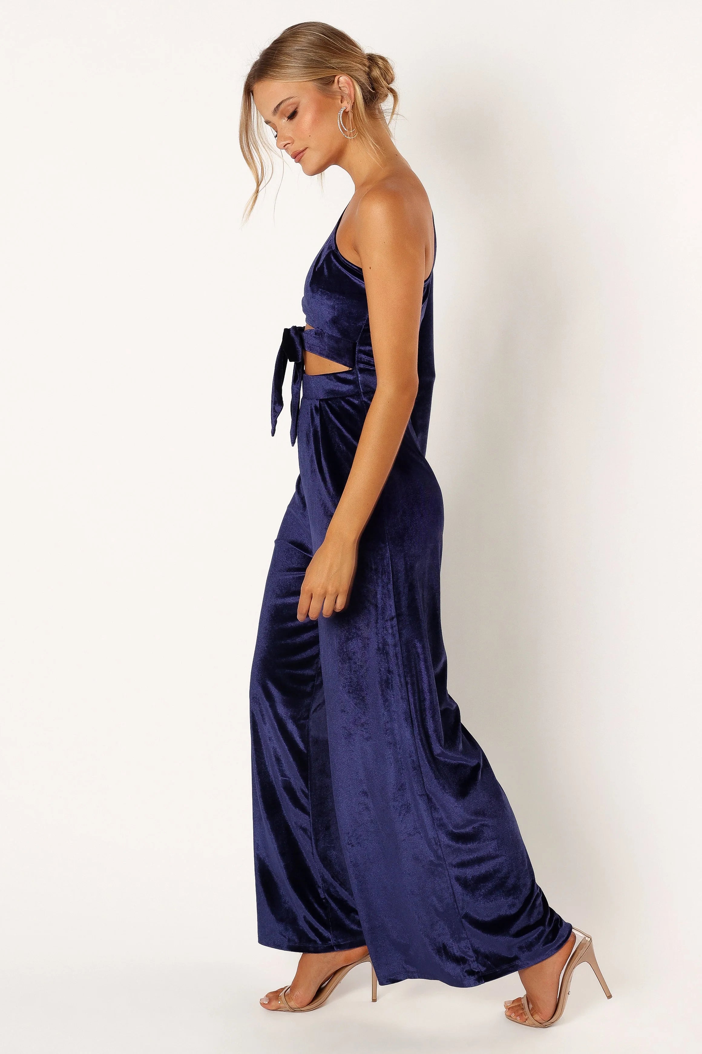 DETAILS Dazzle in the Avery Jumpsuit, a trendy one-shoulder ensemble in a charming sapphire hue. Its asymmetrical neckline, flared cuff, and wide-leg style make a fashion-forward statement. Delight in the soft velvet feel and the playful cut-out detail.