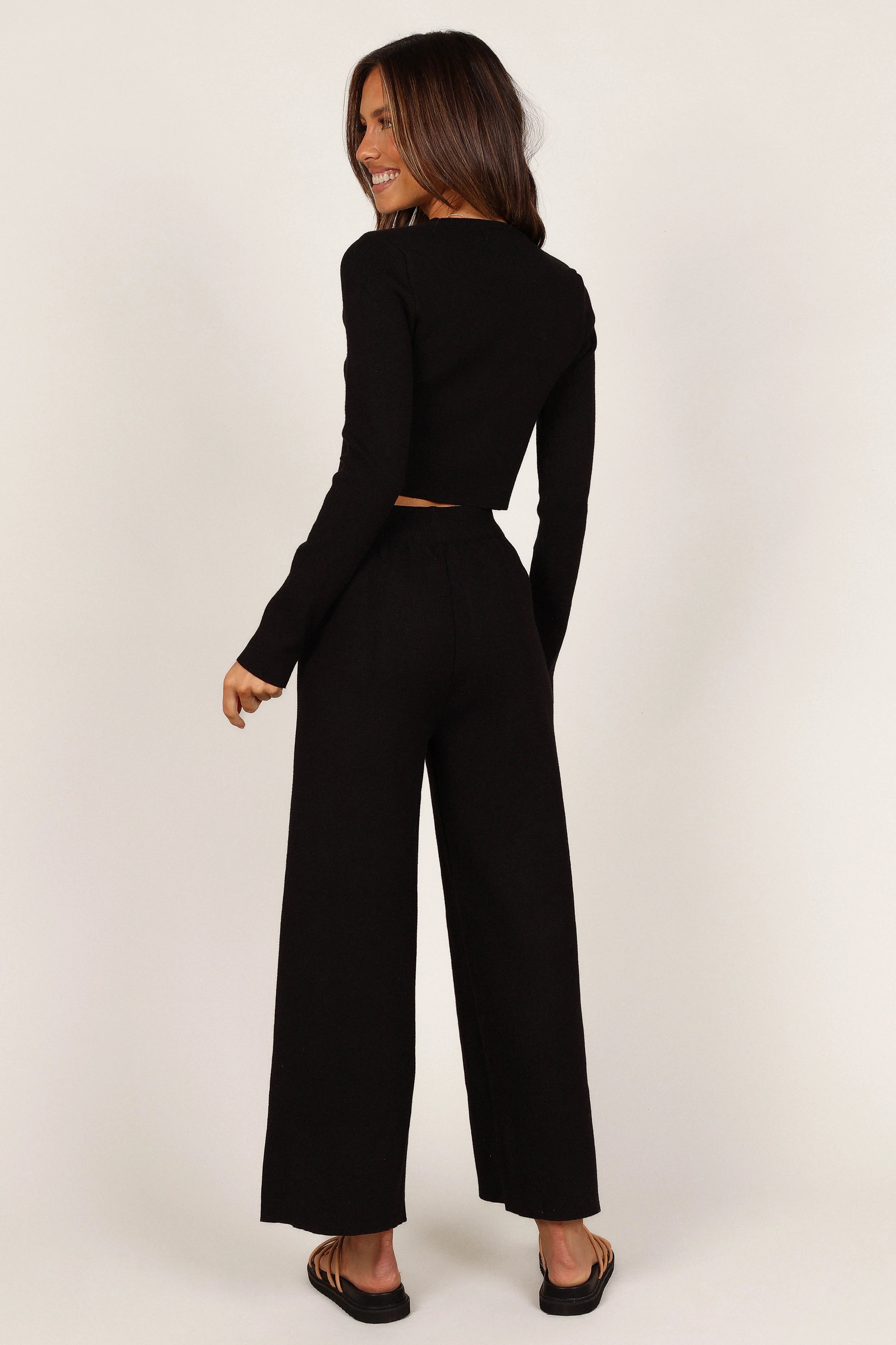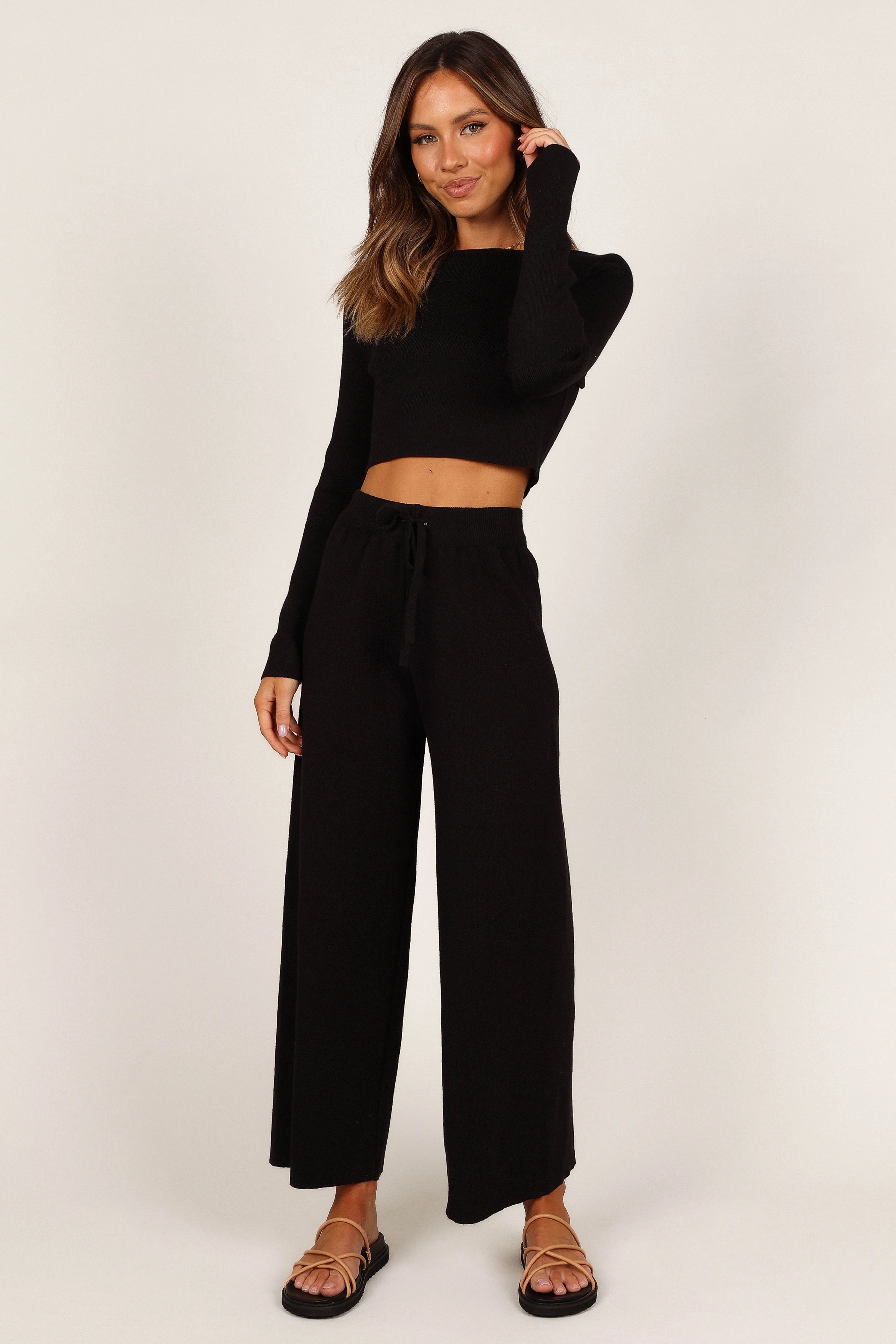 DETAILS This cozy top and pant set is a must-have for your weekend wardrobe! Crafted in a stretch ribbed fabric, the cropped length top features a round neckline and long sleeves while the high waisted pants feature an elasticised waistband with drawstring tie and wide leg style.