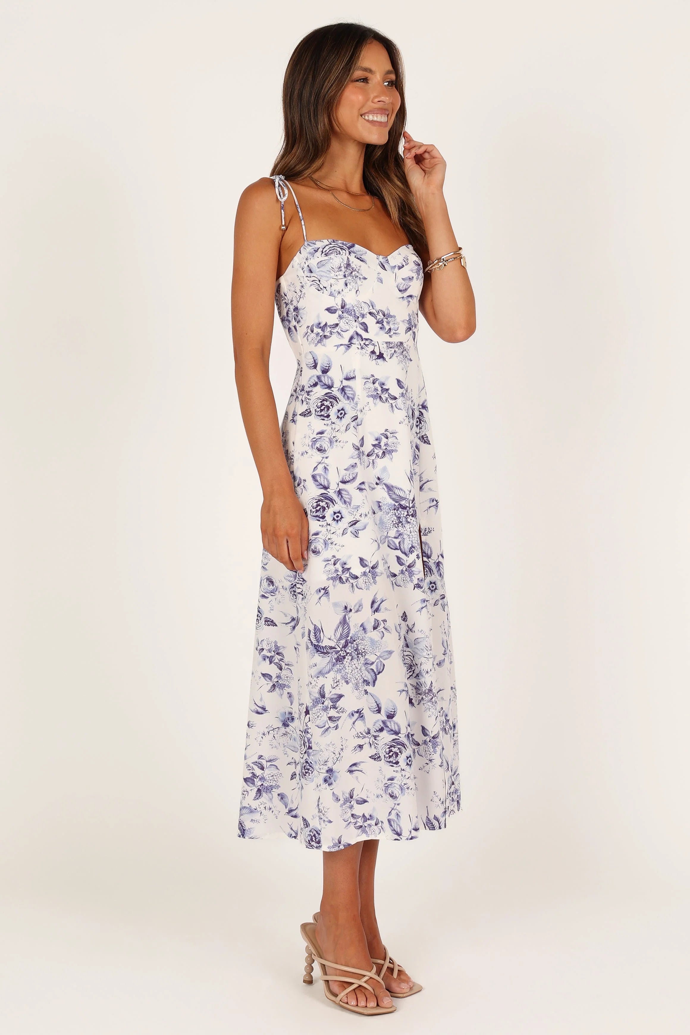 DETAILS This Midi Length Dress is the perfect party piece for spring! With its sweetheart neckline, thin tie close straps and pre-sewn padded bra cups, this dress will hug you in all the right places.