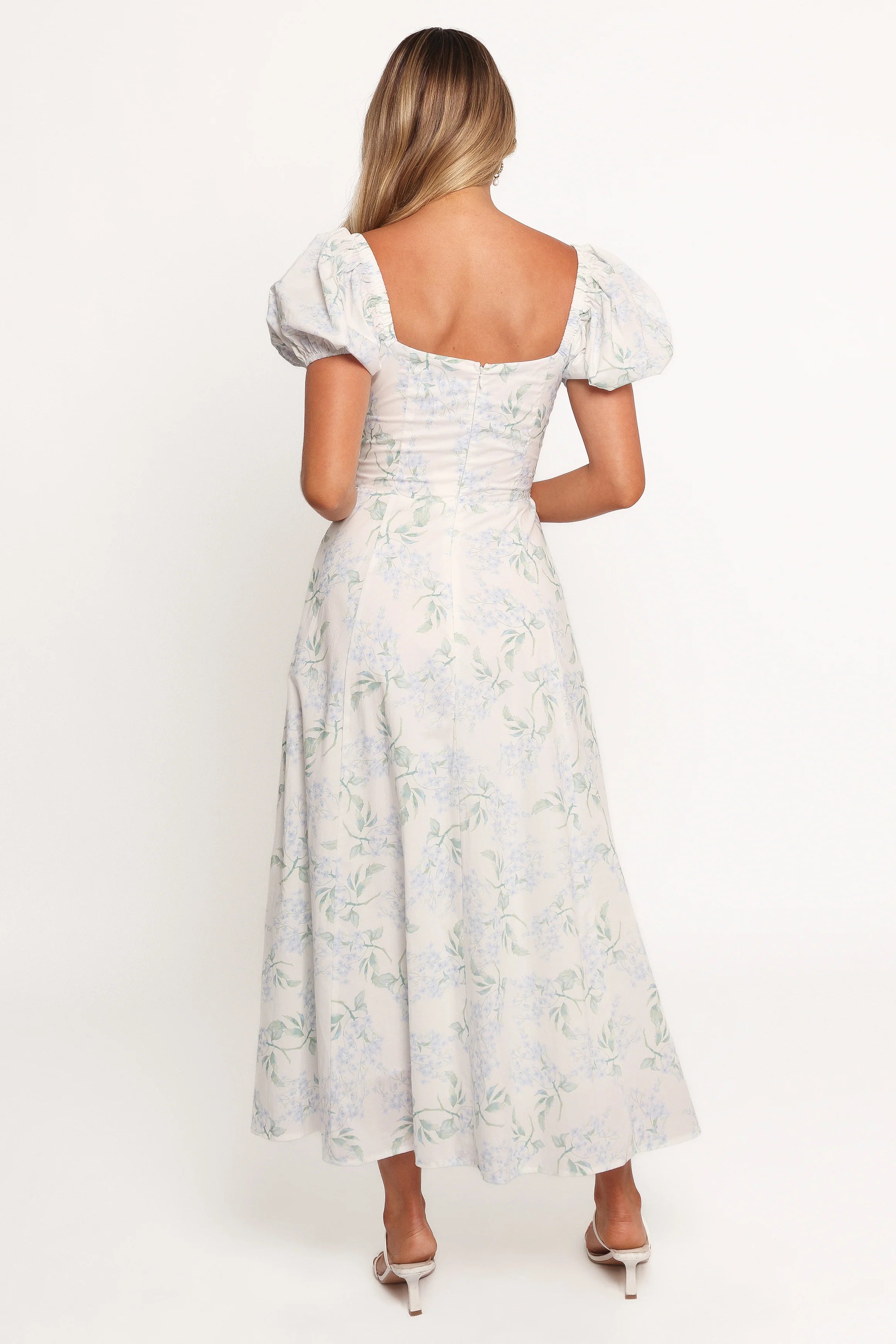DETAILS Featuring a flattering midi length and a sweetheart elasticized neckline, this dress accentuates your natural shape while offering a touch of whimsy with its short puff sleeves. The front cut-out detail at the bust adds a modern edge, perfectly balanced by the classic A-line silhouette that flows beautifully with every step you take.