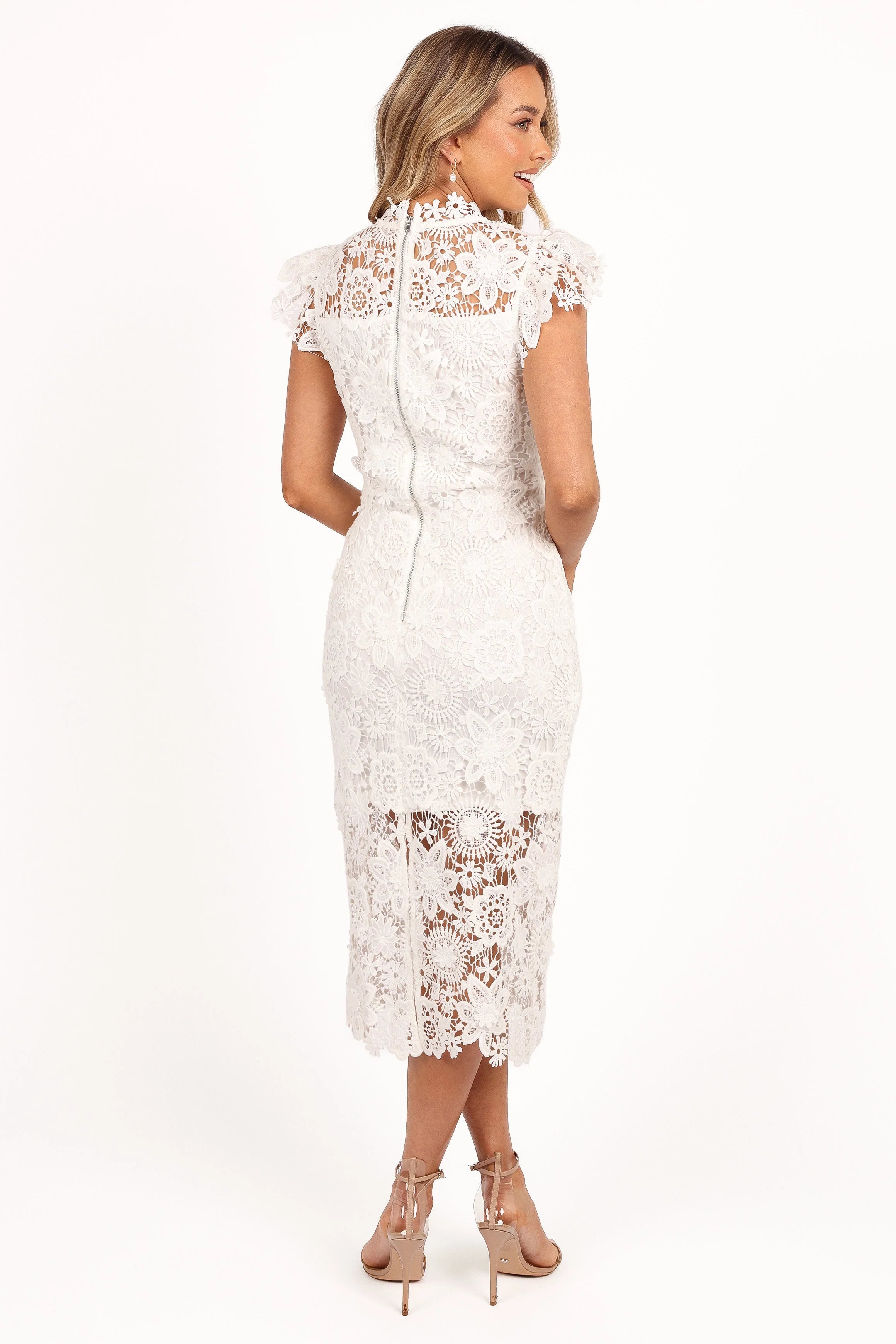 DETAILS Step into effortless elegance with our latest midi dress, a perfect blend of sophistication and modern style. Featuring a high round neckline and short sleeves that offer a timeless silhouette suitable for any occasion. The back zip ensures a seamless fit, while the back split detail adds just the right amount of movement.