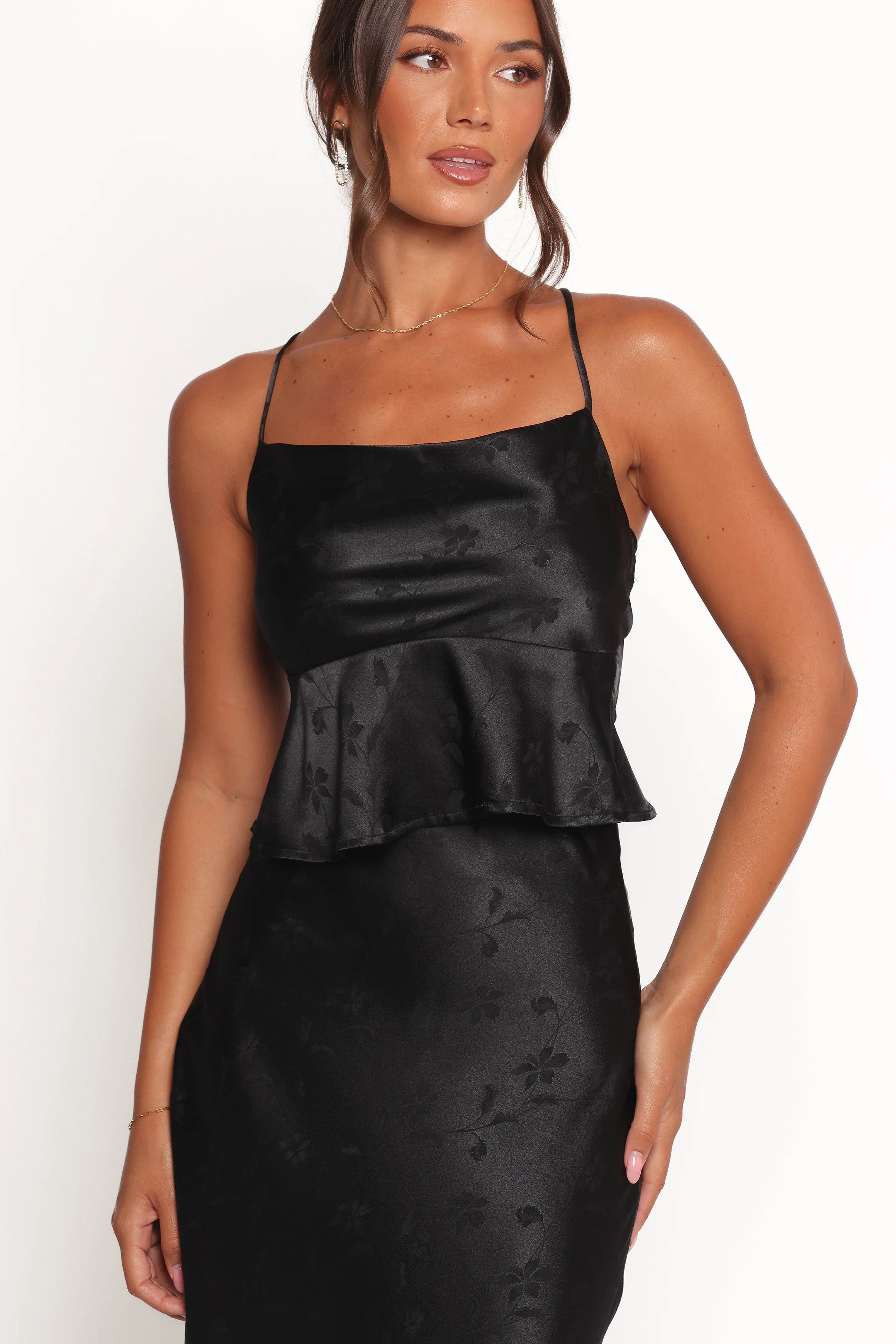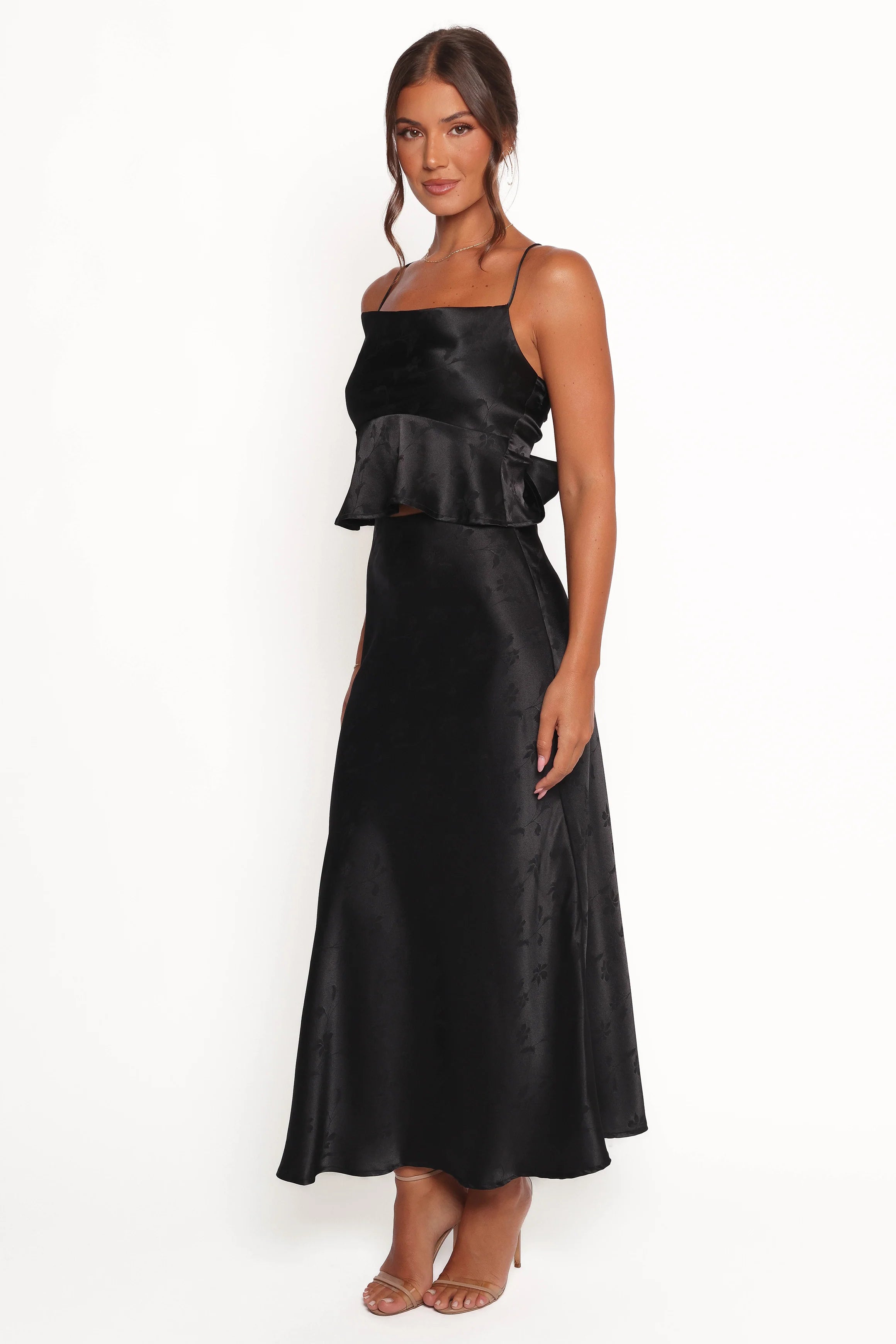 DETAILS The set features a chic, cropped cowl-neck top with adjustable thin straps, a back cross-over detail, and a peplum ruffle hemline. Tied together with a back-tie feature, it pairs perfectly with the high-waisted, midi-length A-line skirt.