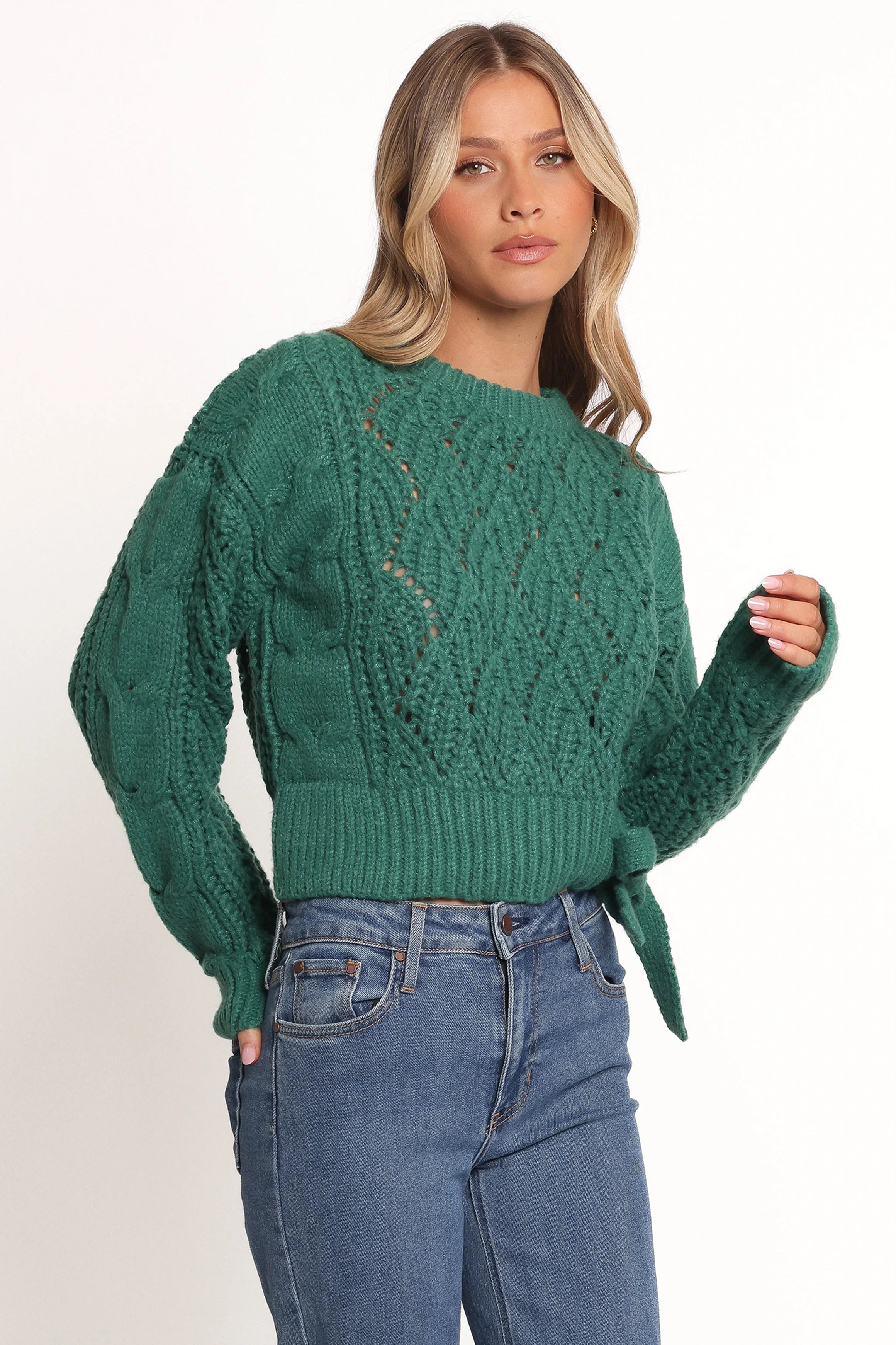 DETAILS Add an effortless edge to your wardrobe with the Birdie Tie Side Knit Sweater in Emerald. This piece combines style and versatility with its cropped length and patterned knit design, making it perfect for layering or showing off high-waisted jeans.
