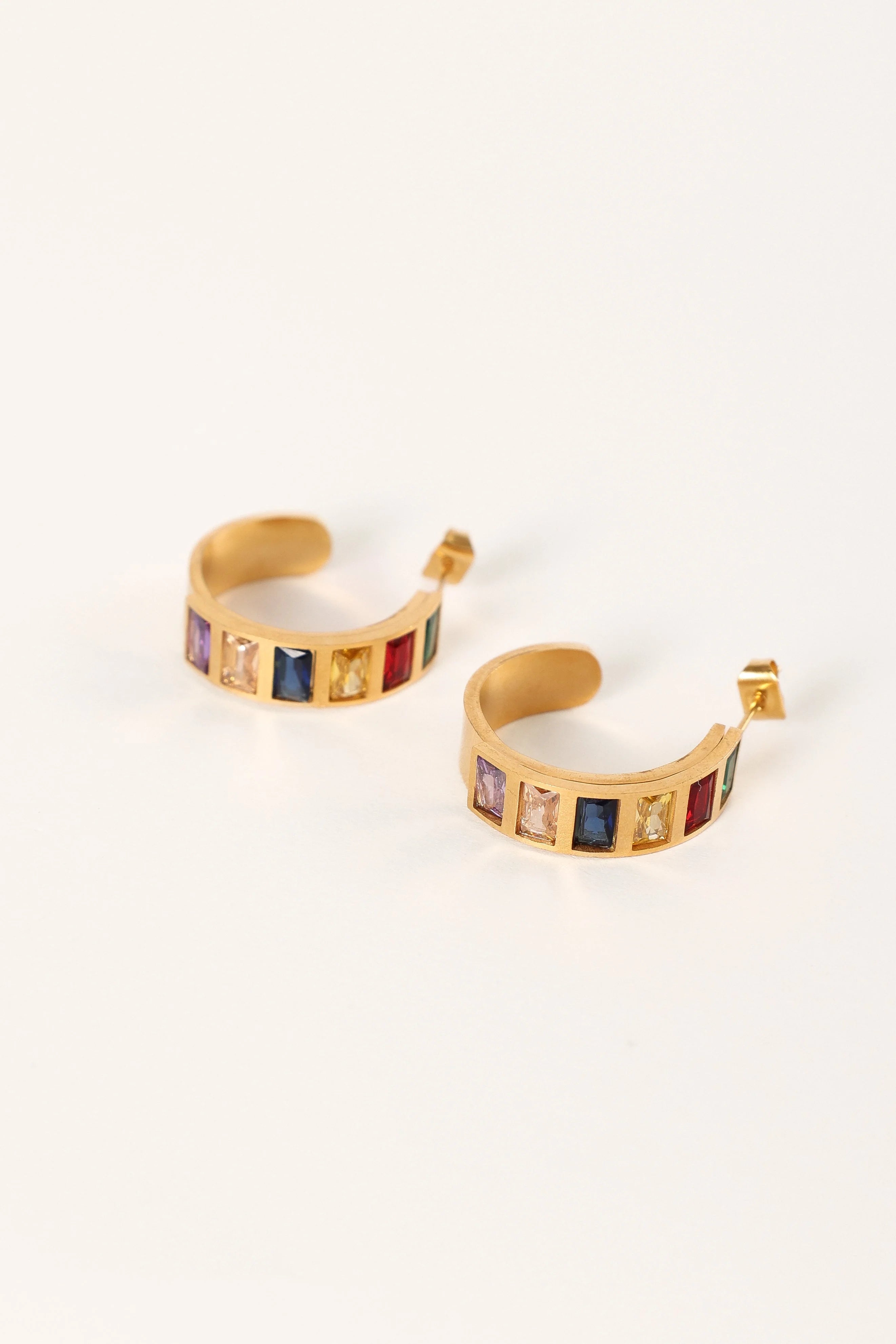 DETAILS Introducing the Blythe Earrings! Our playful, fashion-forward statement earrings come in a unique gold hoop design with multi-colour embellished detail, plus a snap closure for extra convenience.
