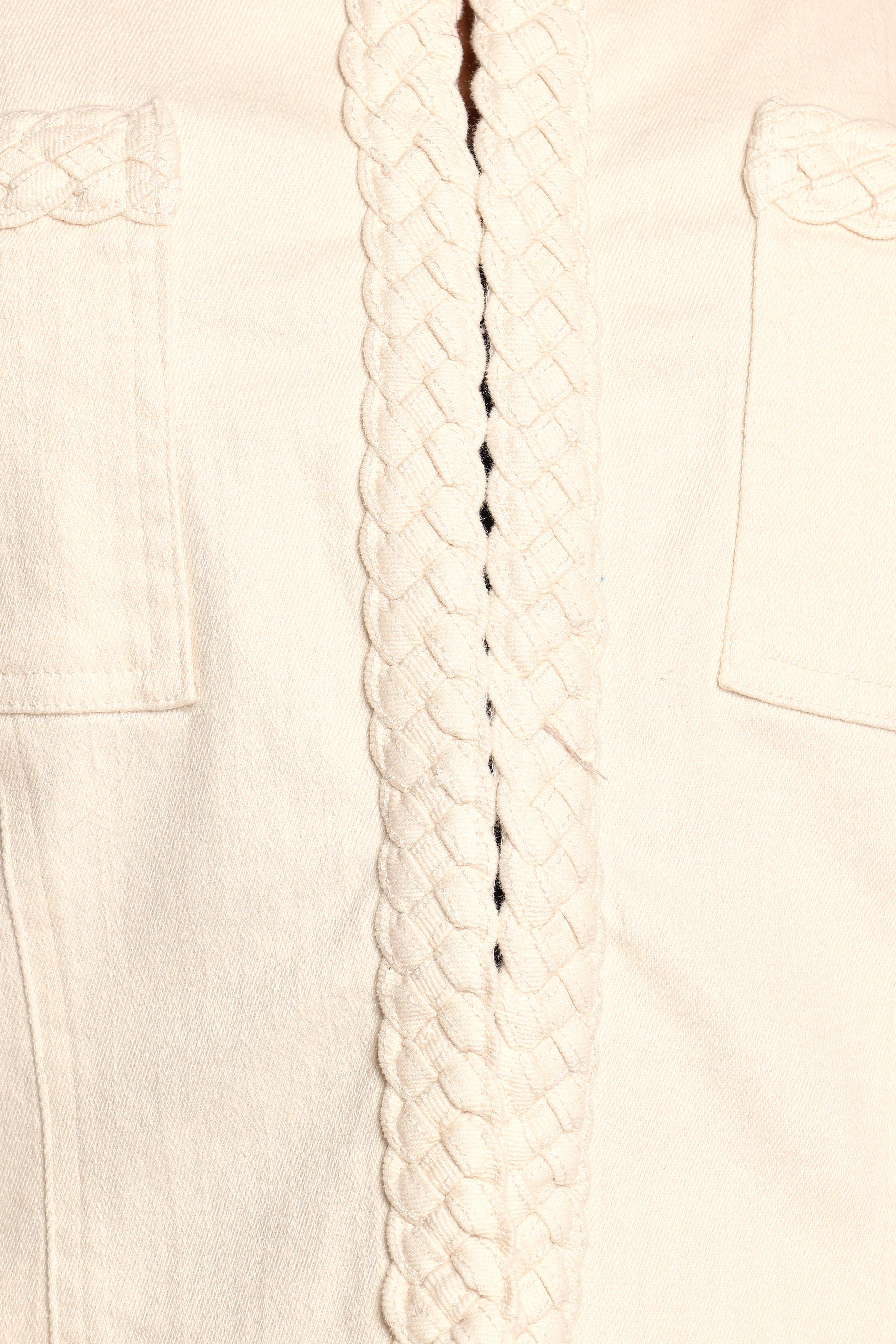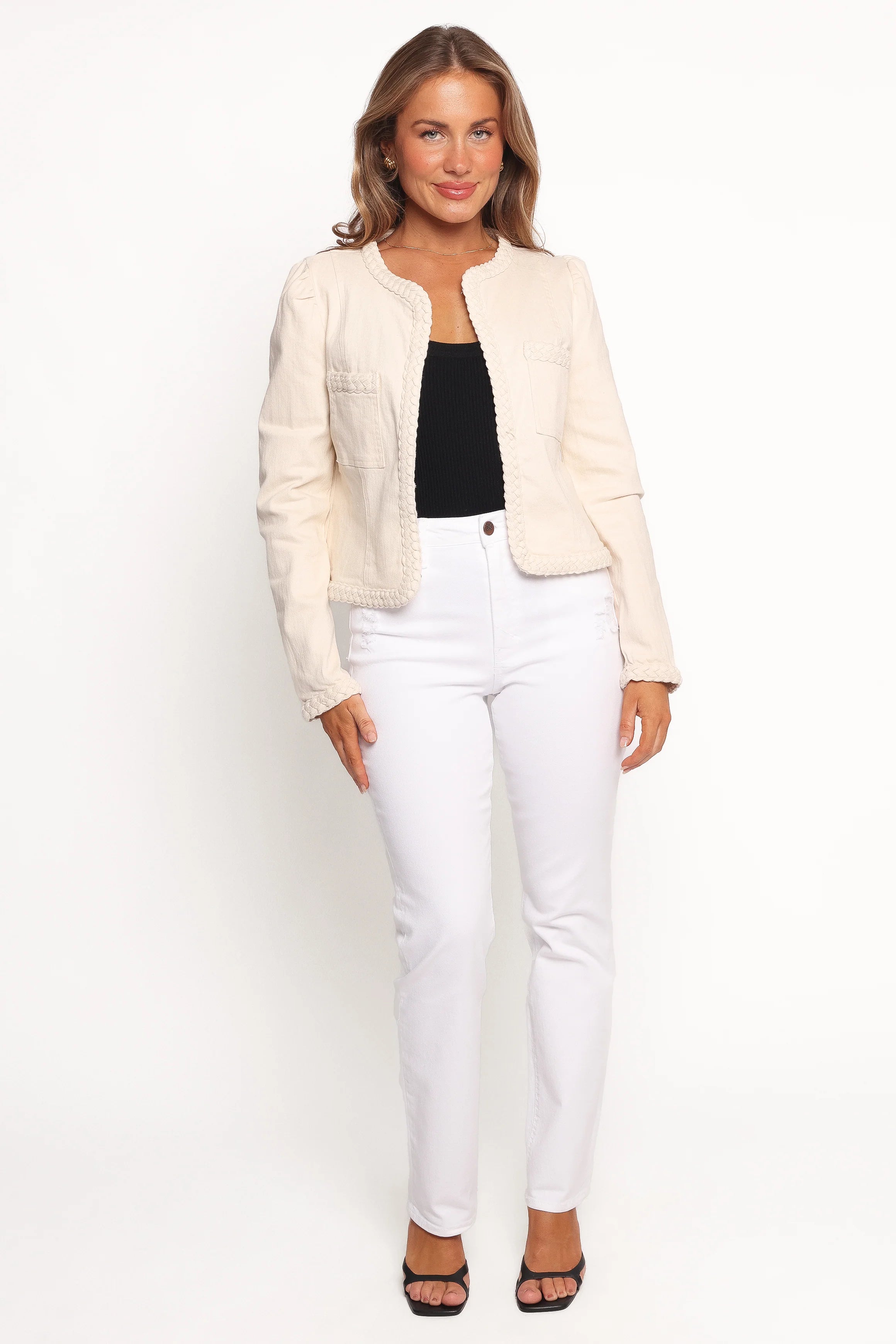 DETAILS Add a polished touch to your wardrobe with the Braided Trim Crop Jacket in Ecru. This chic piece effortlessly combines timeless sophistication with a modern edge. Featuring a stylish round neckline and long sleeves, it’s perfect for layering or wearing as a standout piece.