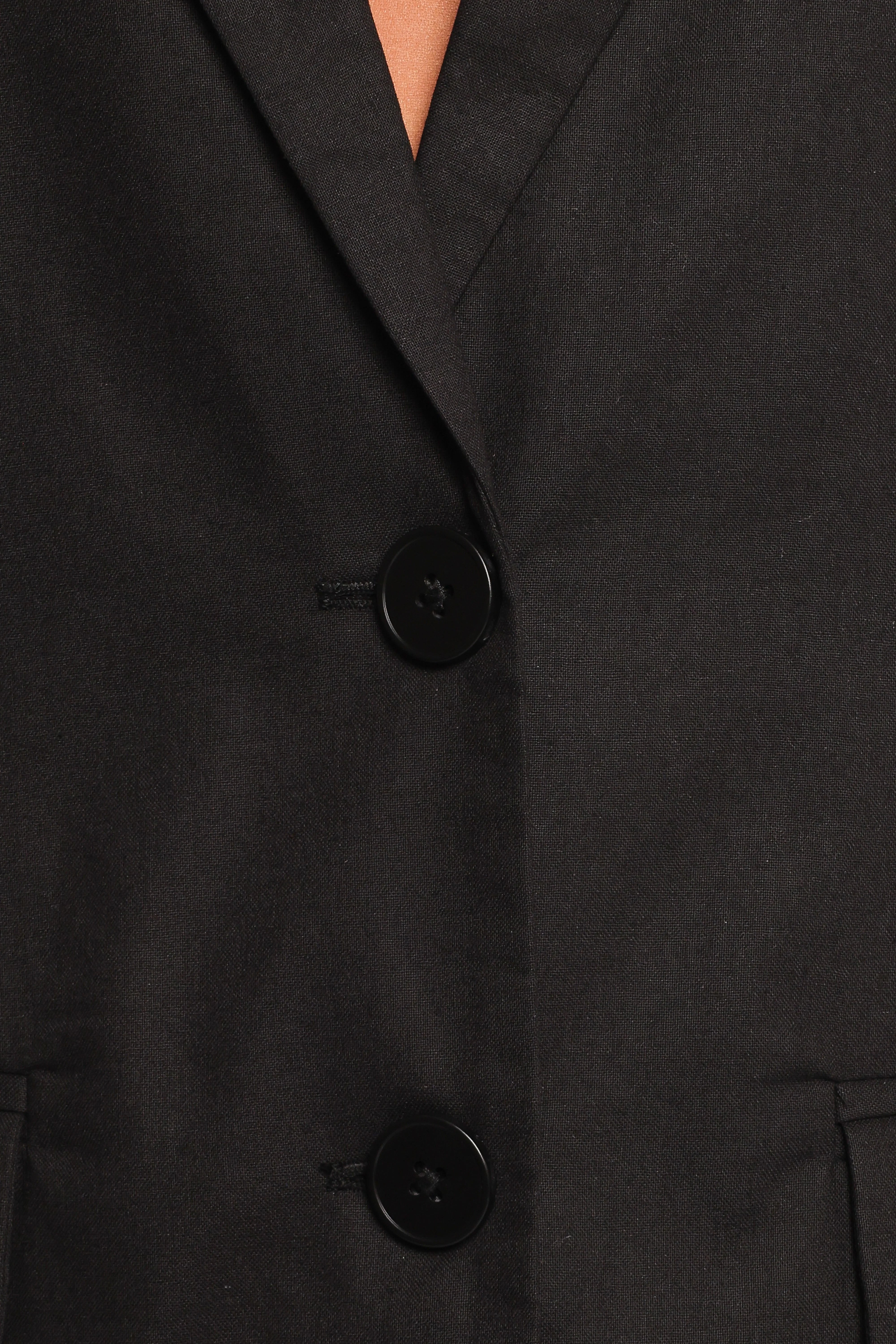DETAILS Effortlessly elevate your wardrobe with the Brielle Short Sleeve Blazer Top in sleek black. Featuring a chic collared neckline, cap sleeves, and a functional button-down design, it's perfect for layering or wearing solo. With non-functional pockets adding a tailored touch, it's all about modern sophistication made easy.