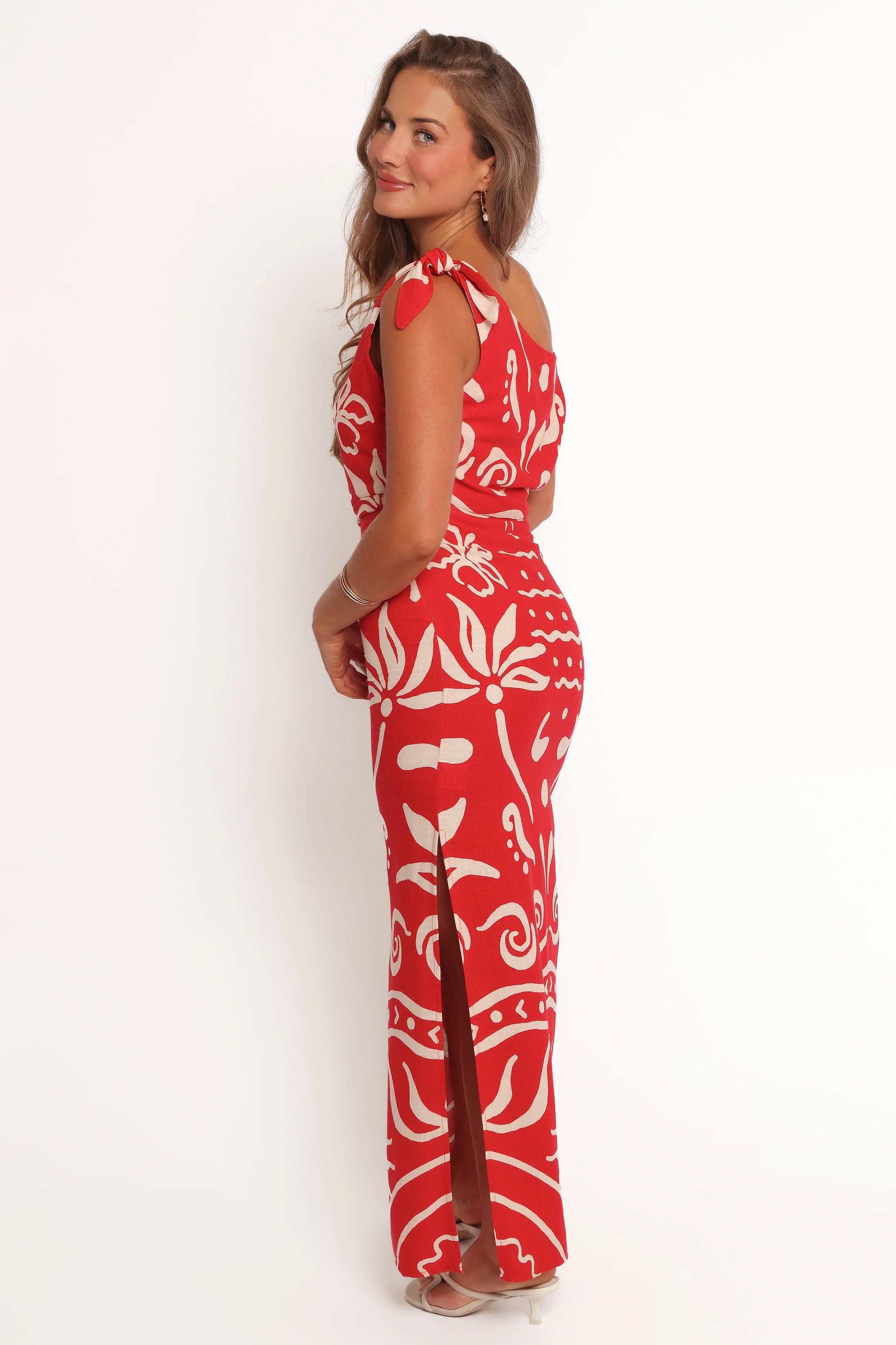 DETAILS With its off-the-shoulder neckline and adjustable tie straps, this piece merges effortless elegance with customizable comfort. The abstract print is a celebration of bold, modern style, while the side split hem detail adds just the right amount of movement and drama.