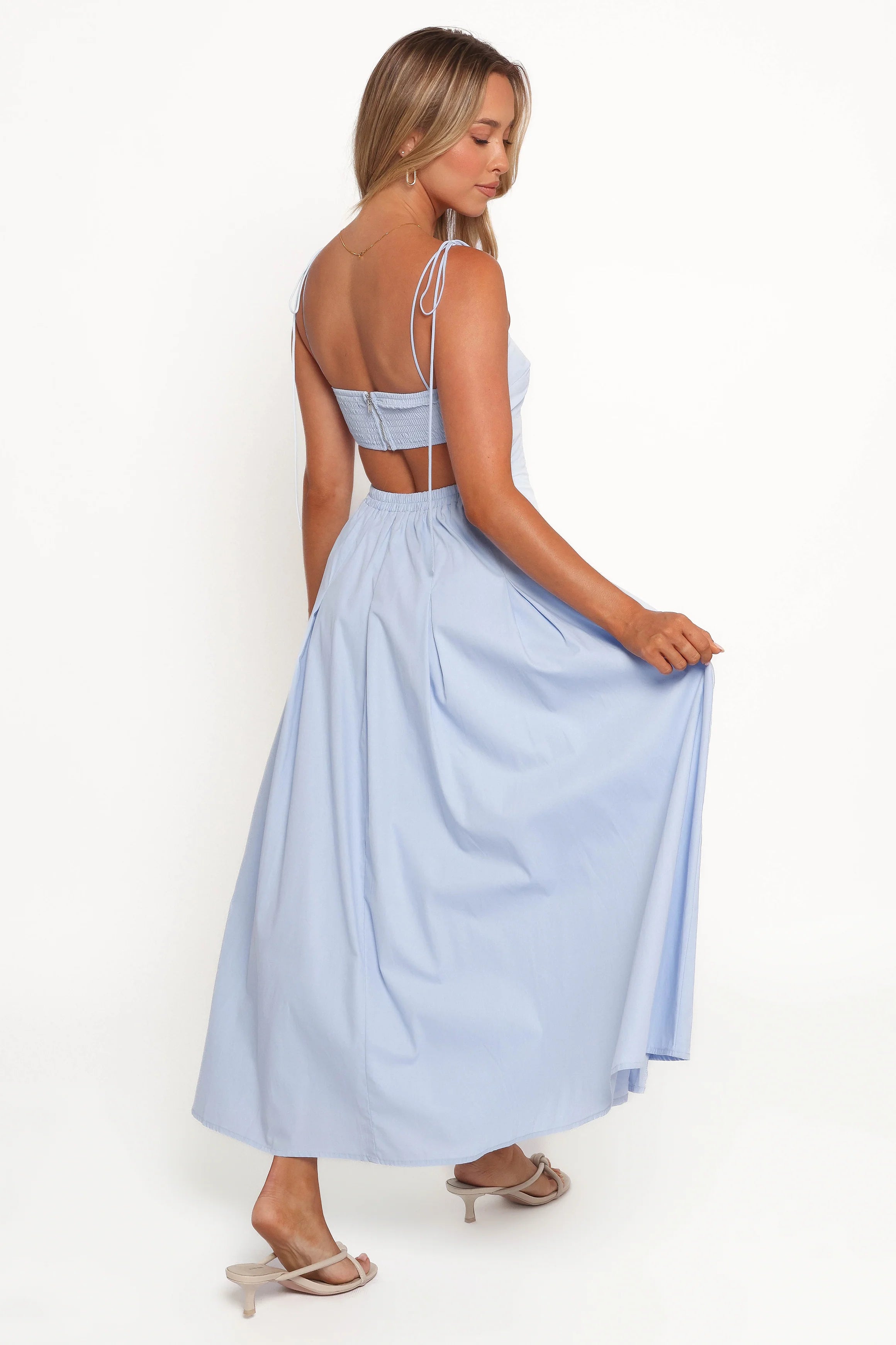 DETAILS Step into effortless elegance with the Briony Midi Dress in Blue - a perfect mix of playful charm and timeless design. This midi-length dress features a flattering square neckline paired with delicate tie-close straps, letting you adjust the fit to your liking.