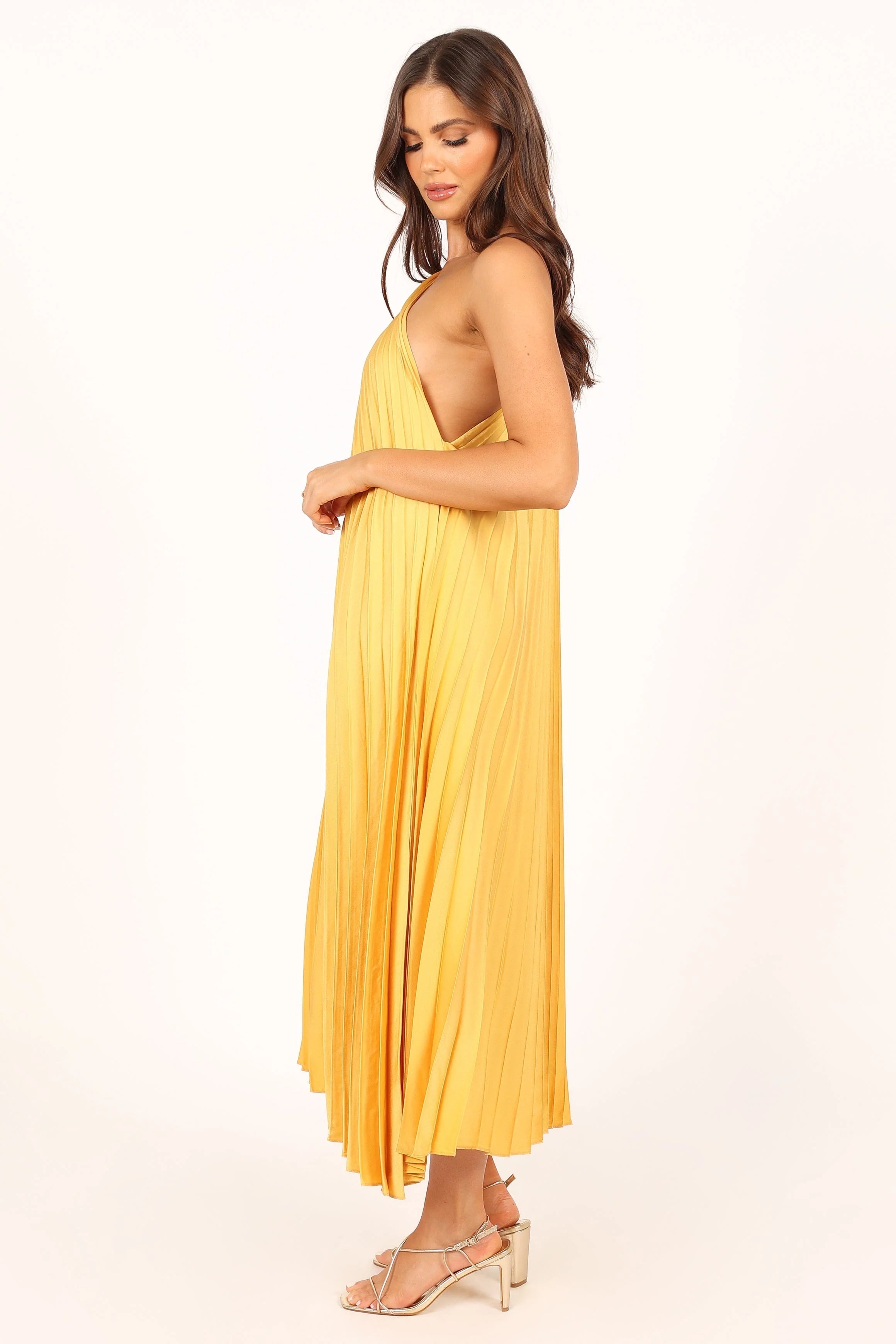 DETAILS Make a statement in our gorgeous Cali One Shoulder Midi Dress! With its drawstring tie detail and fine pleat feature, this soft feel fabric offers a relaxed fit that is lined for added comfort. Perfect for any occasion, you'll be sure to stand out in this eye-catching golden yellow piece!