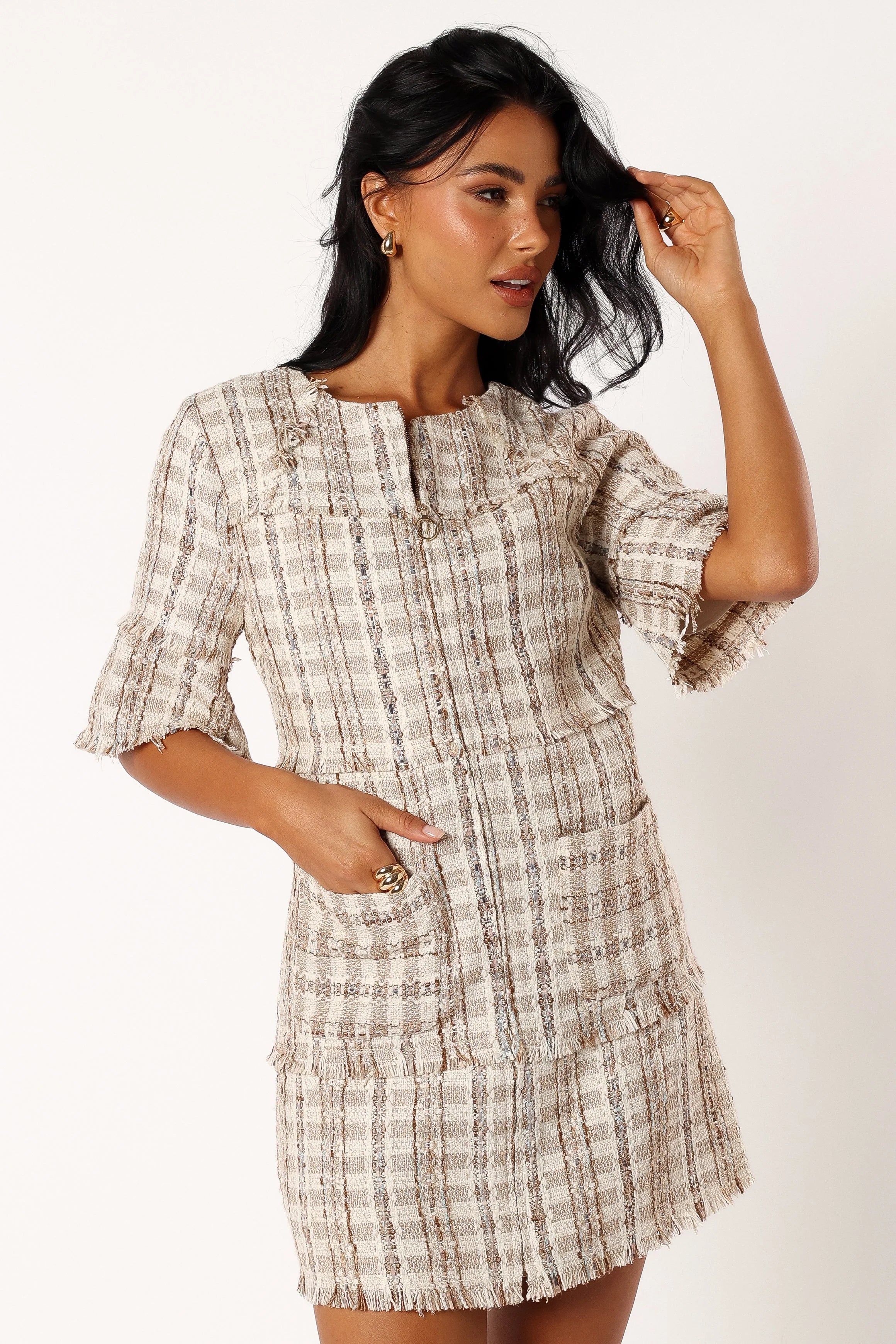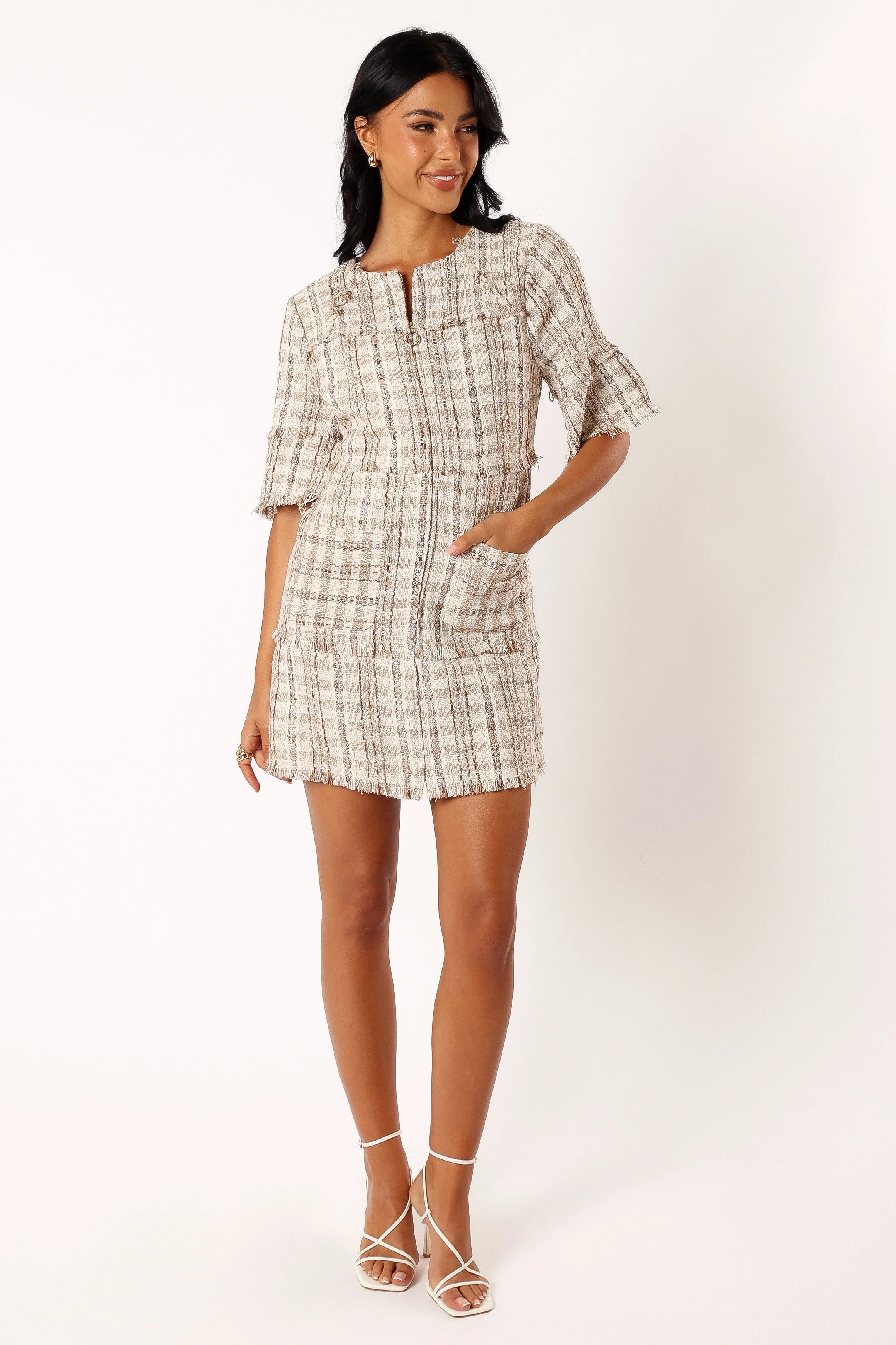 DETAILS Give your wardrobe an instant update with the casual yet stylish mini Dress! This above knee length dress features a round neckline and short sleeves, along with a functional zip down front and two functional front pockets. The fray hem gives this look an edgy touch that will make you stand out from the crowd.