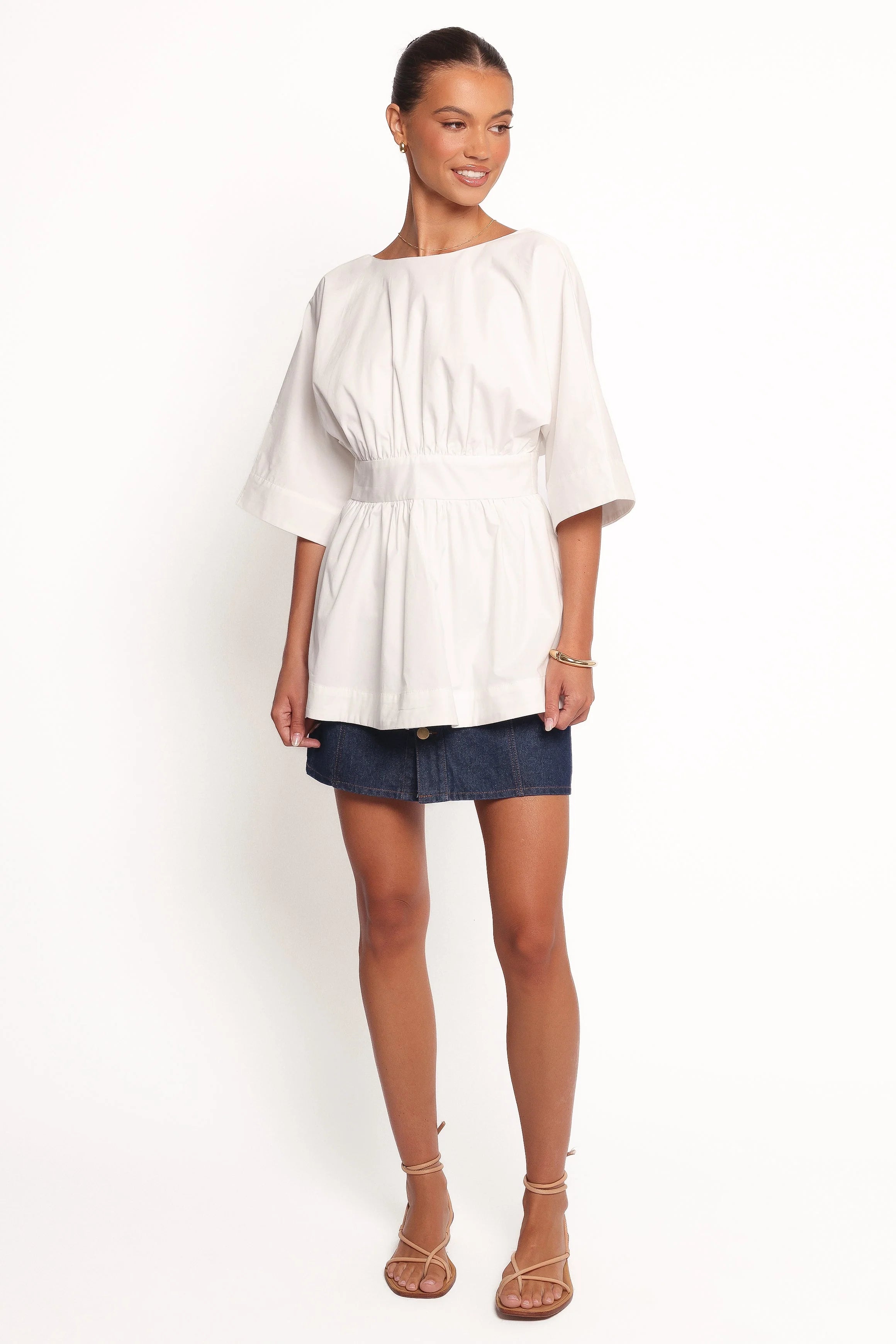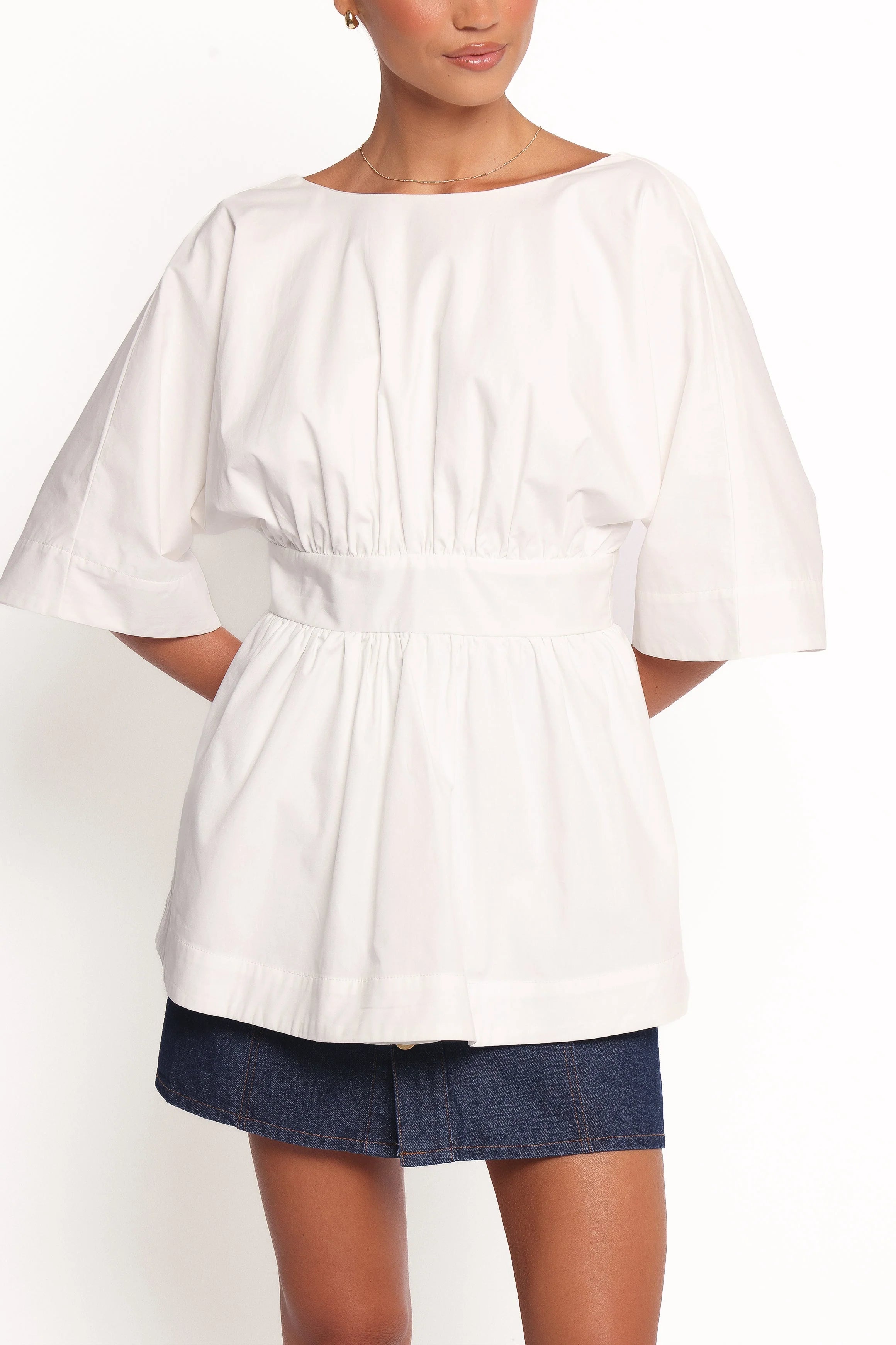 DETAILS Elevate your look with the Camila Open Back Top in white. Featuring a chic boat neckline and short sleeves, this top is all about the details. The open-back design with a functional tie adds a modern twist, ensuring you stand out effortlessly. Perfect for pairing with high-waisted jeans or skirts!