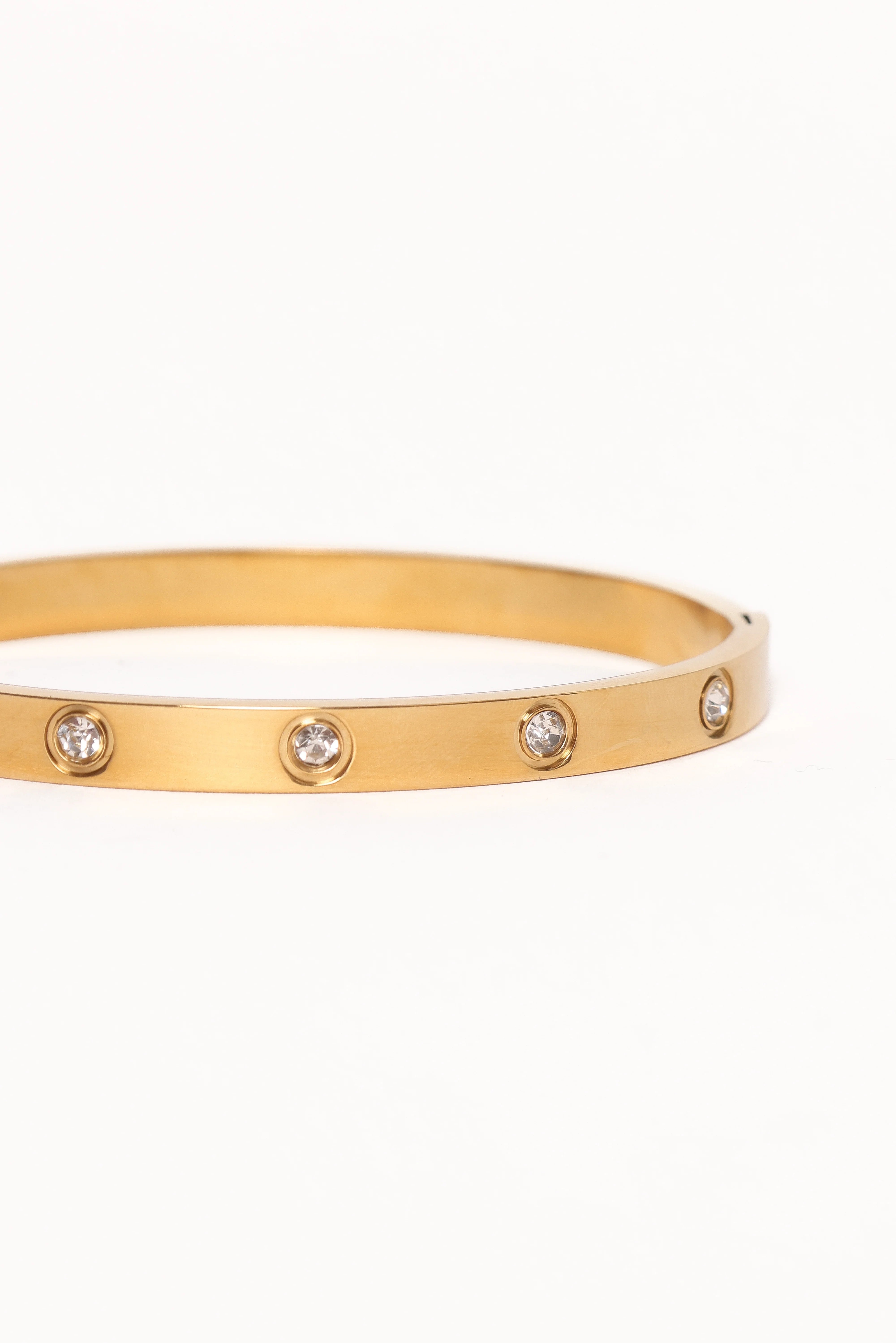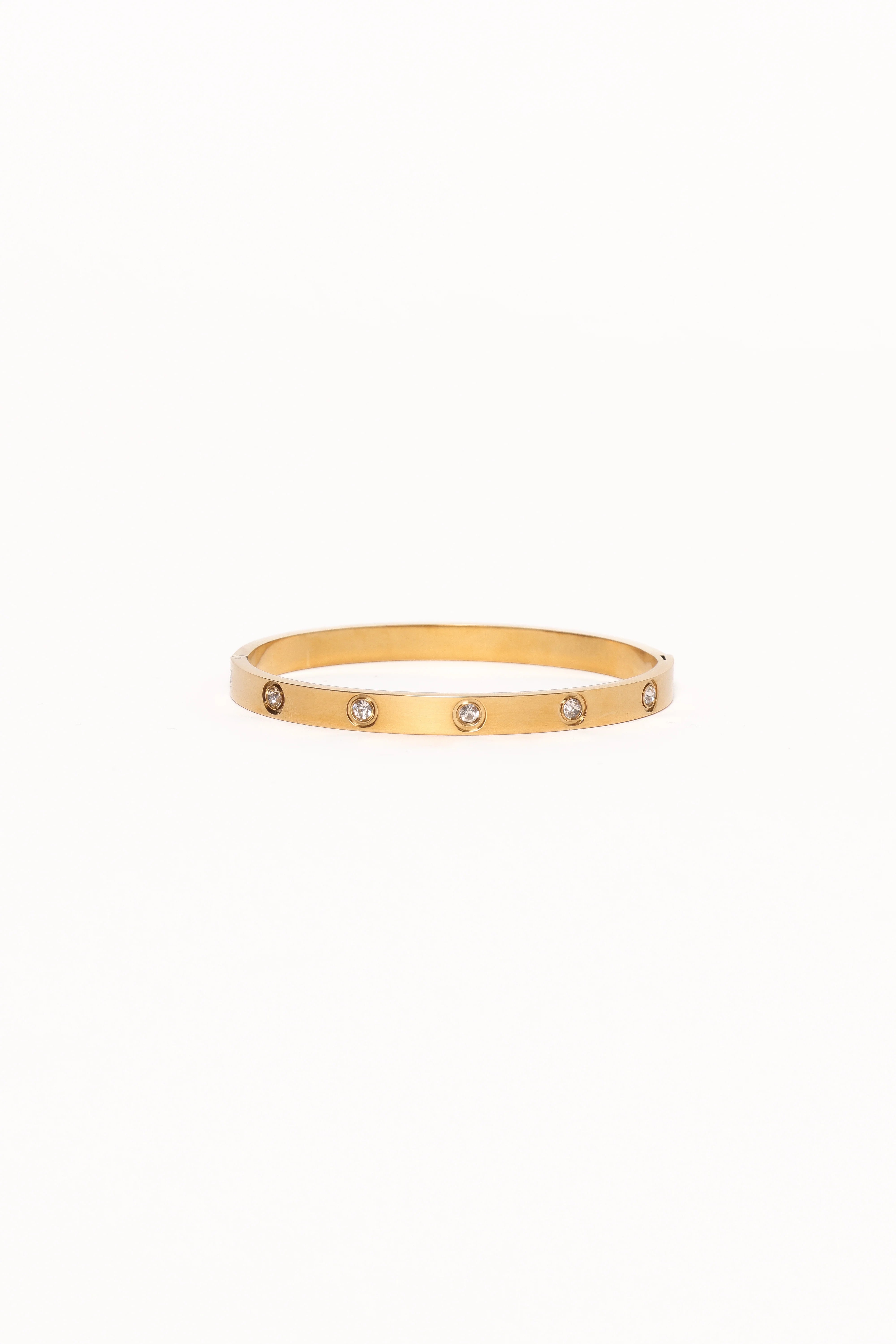 DETAILS Add a touch of timeless elegance to your outfit with the Camilla Bracelet in Gold. Featuring a sleek gold-tone design adorned with dazzling rhinestone embellishments, this bracelet is all about effortless sophistication.