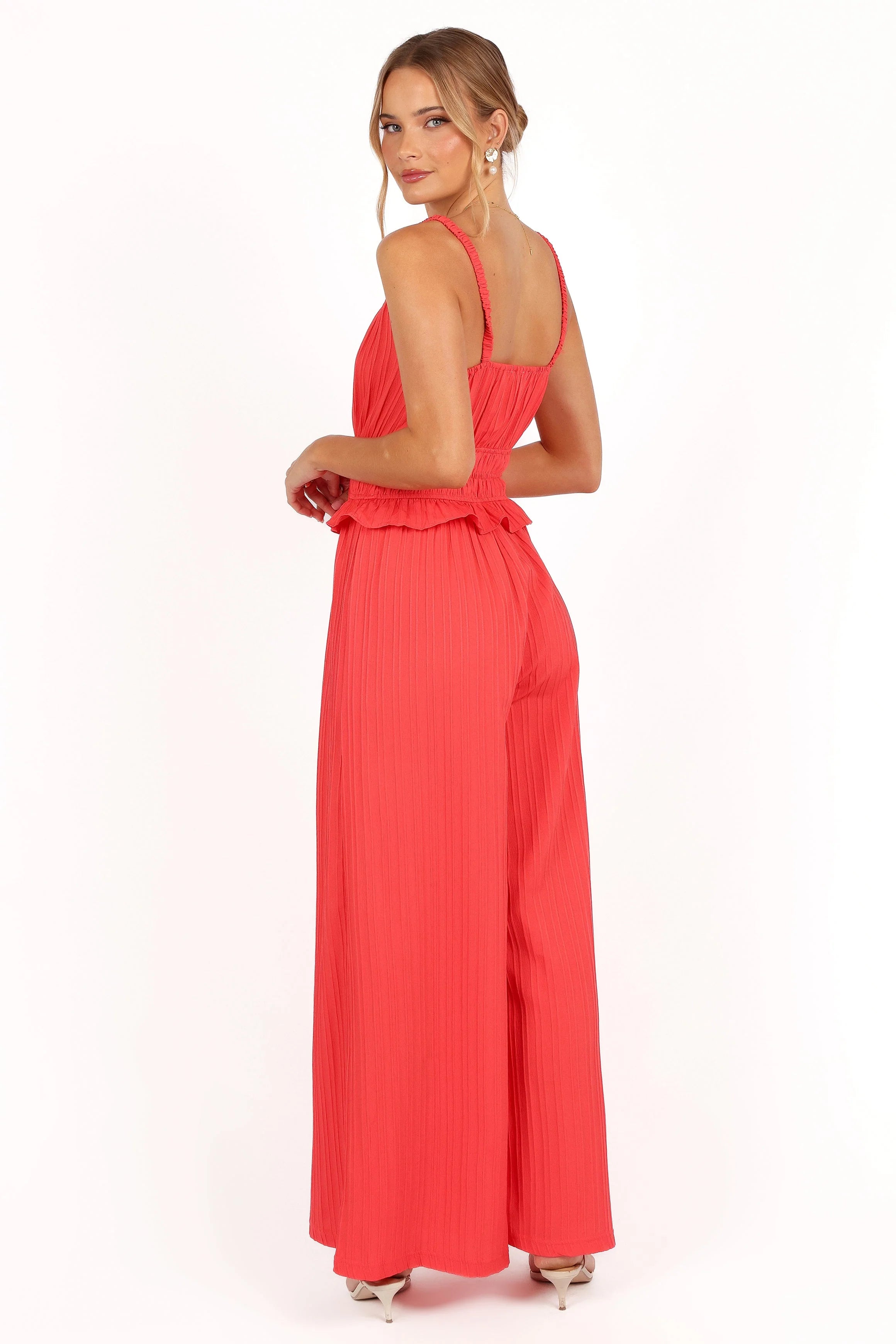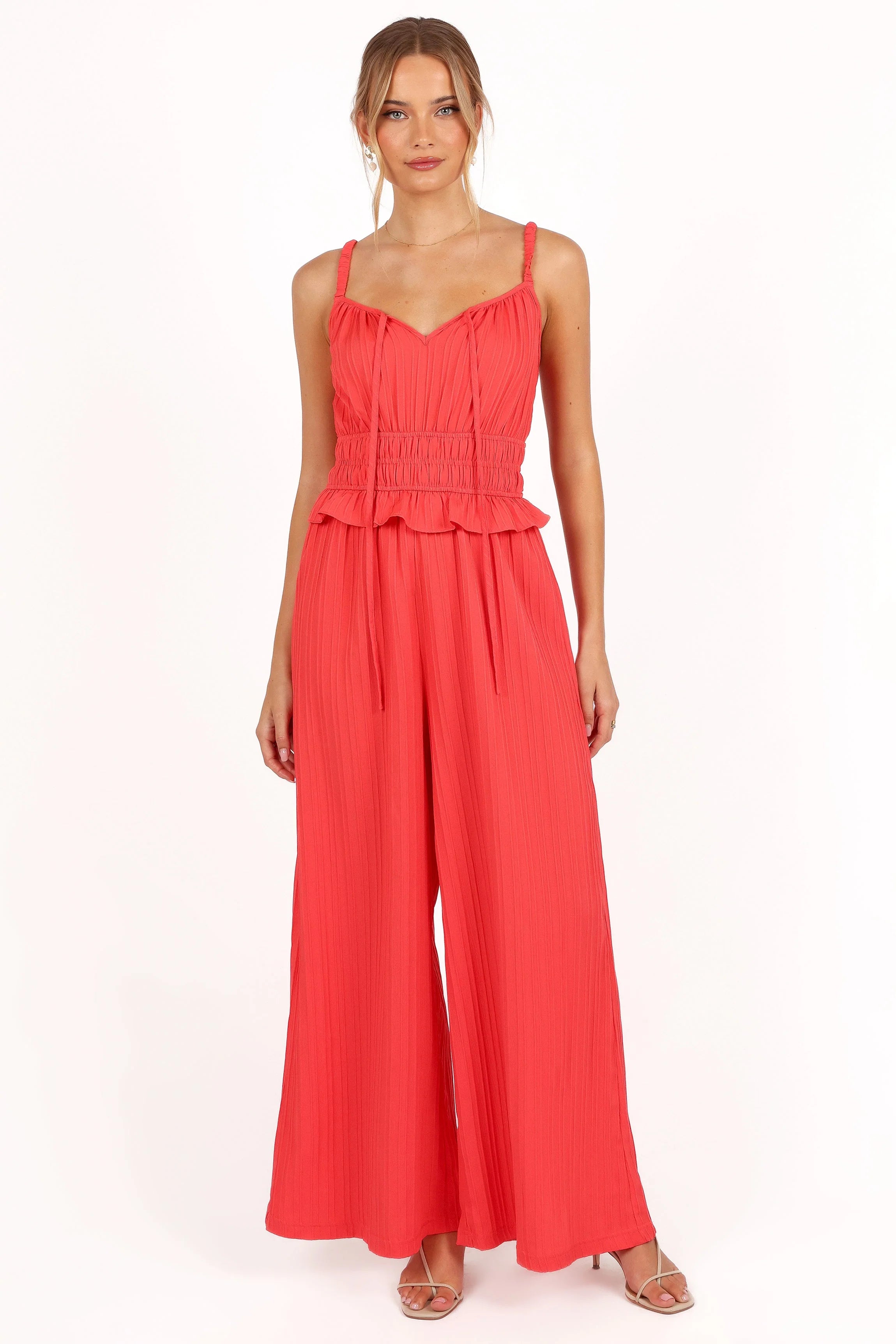 | DETAILS Ready to turn heads and steal the spotlight? Slip into our stunning wide-leg jumpsuit and get ready to make a statement wherever you go. It features elasticised shoulder straps and shirred waistband to ensure both style and comfort.