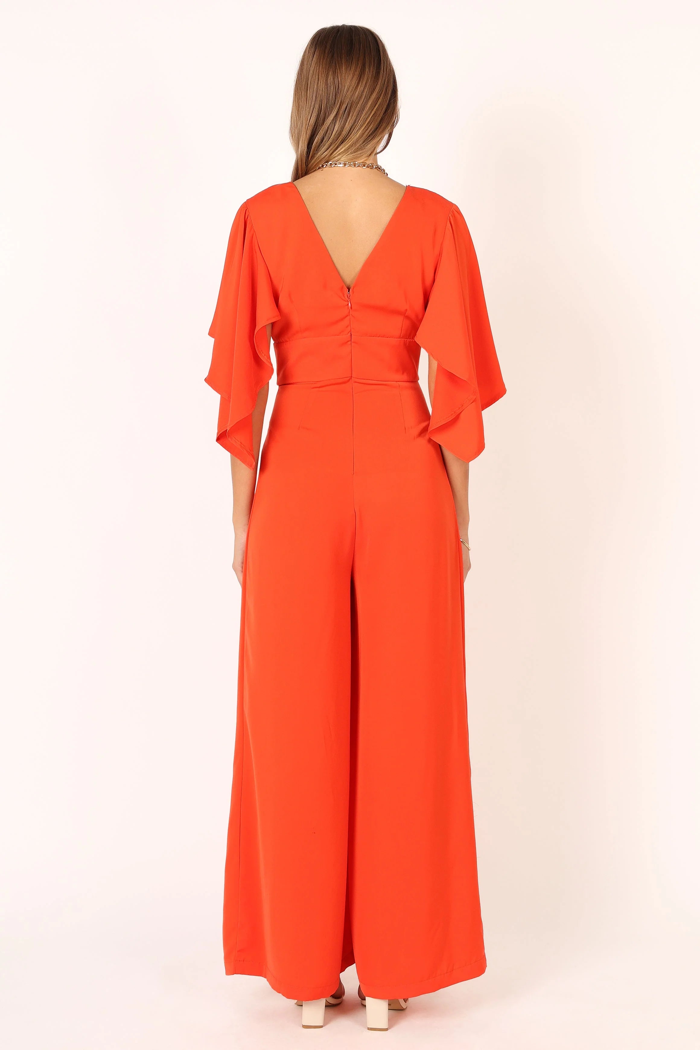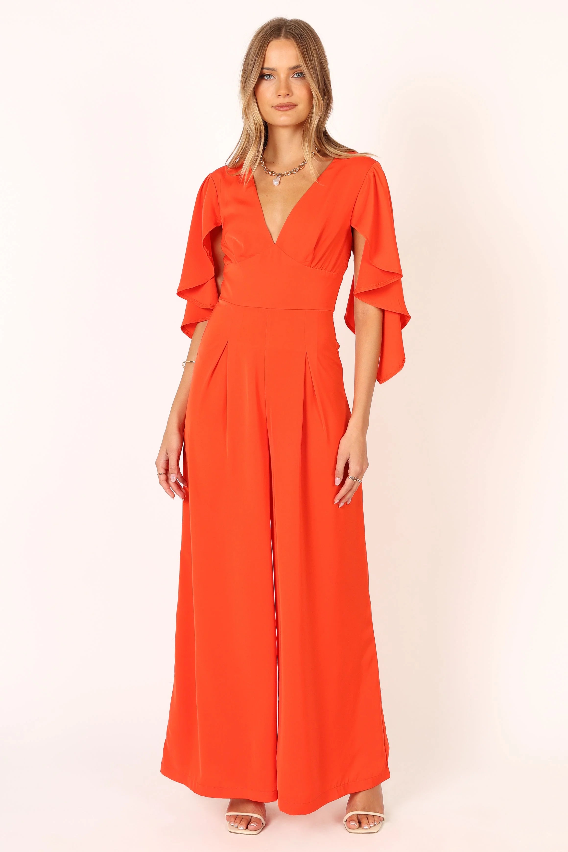 DETAILS Be the talk of the party in this stunning red jumpsuit! This full length jumpsuit features a V neckline, mid-length cape sleeves, and an invisible back zip with hook and eye clasp. Its wide leg pant creates a relaxed yet sophisticated look - perfect for your special occasion.