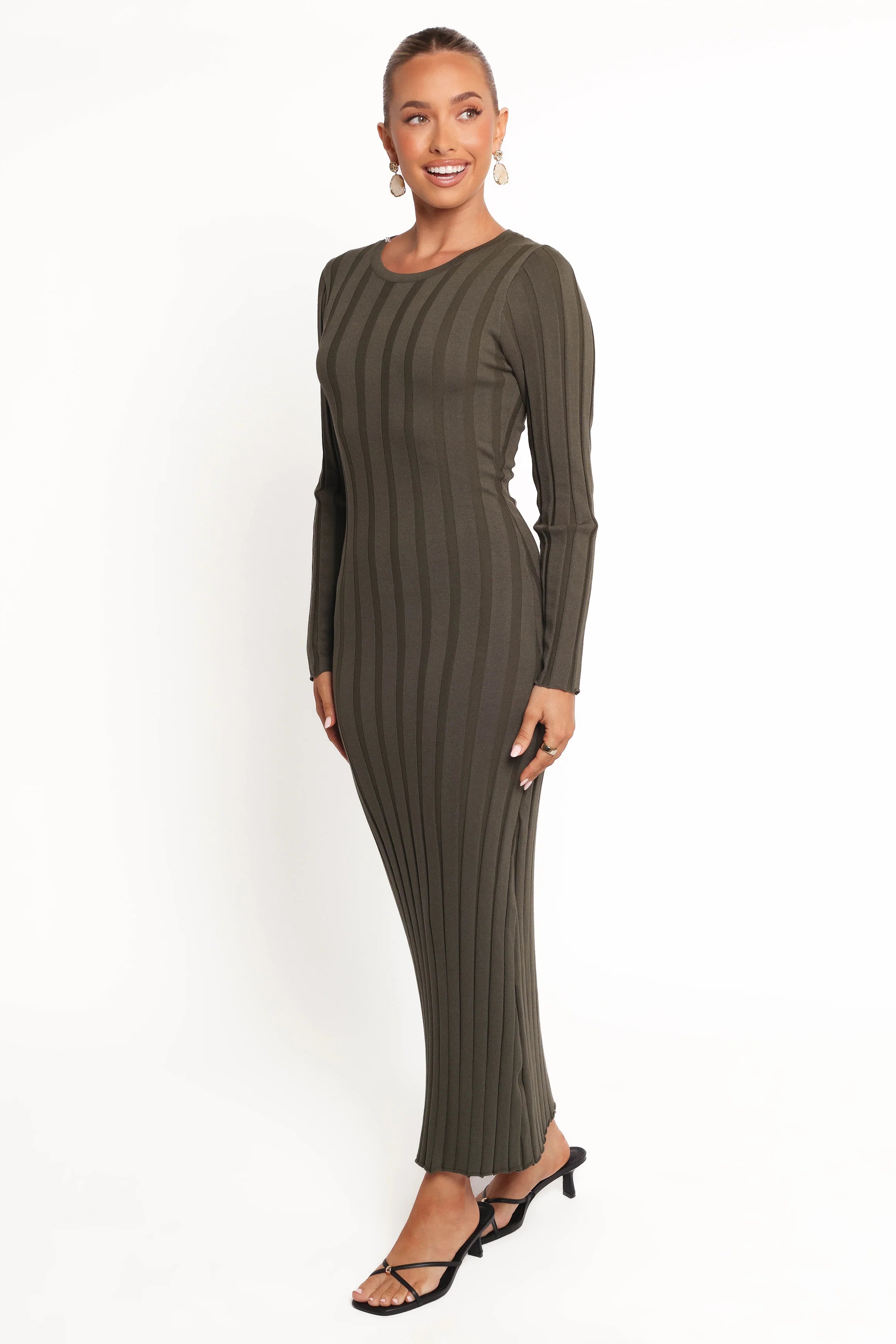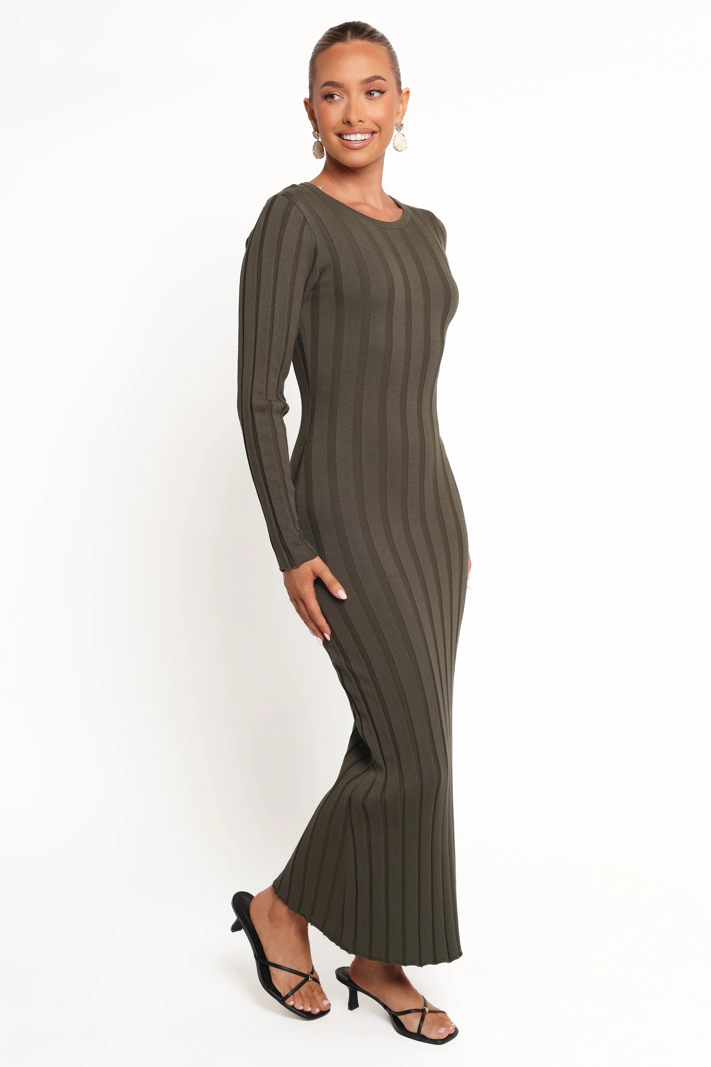 DETAILS Step into effortless elegance with the Carlson Maxi Dress in Olive. Designed with a chic bodycon fit, this dress highlights your silhouette while providing all-day comfort thanks to the stretch ribbed knit fabric.