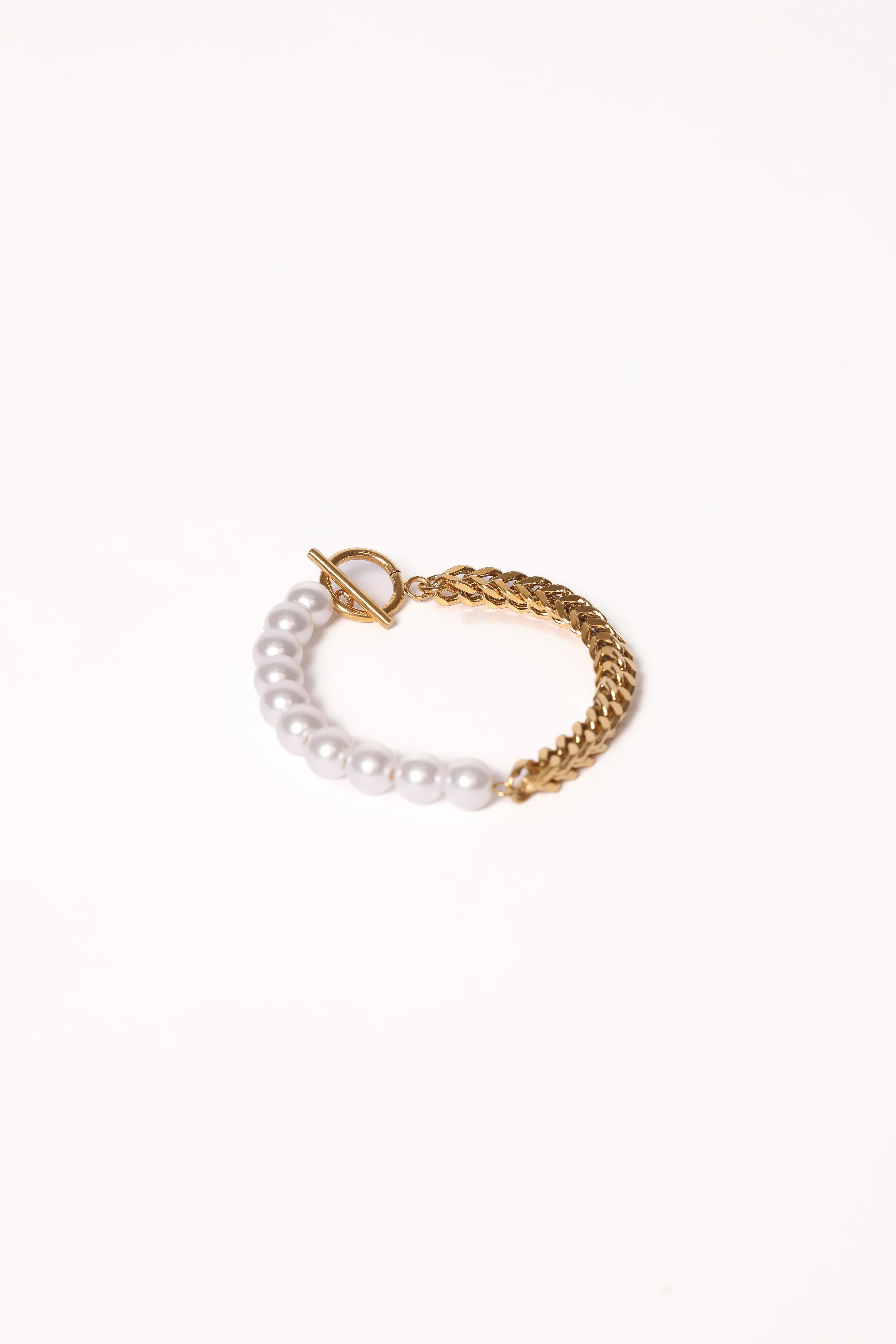 DETAILS Elevate your accessory game with the Cascais Bracelet in Gold/Pearl, a statement piece that exudes effortless sophistication. Featuring a thick link design paired with luminous faux pearls and chic gold hardware, it’s the perfect blend of bold and timeless.