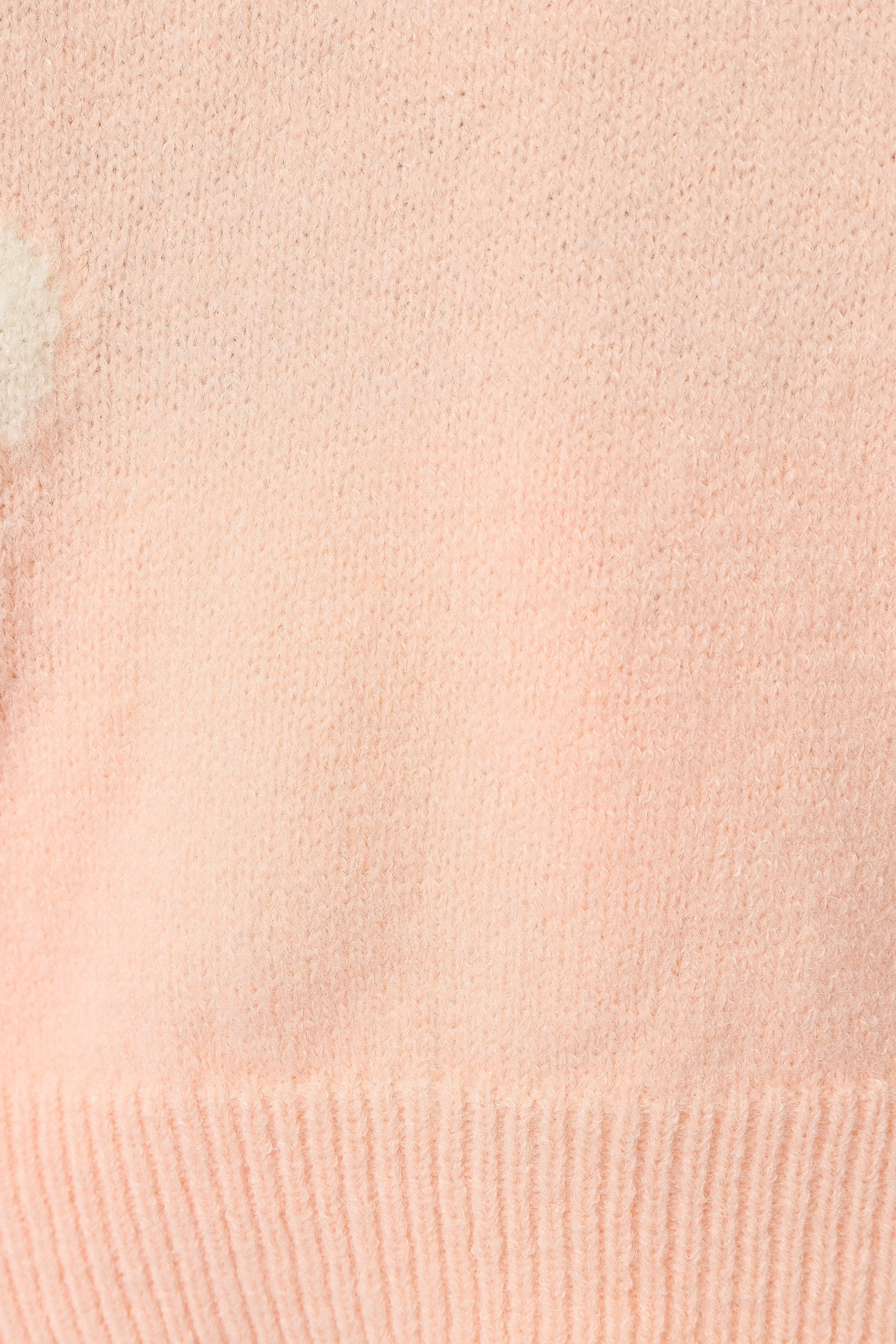 DETAILS Thoughtfully crafted with a cozy round crewneck neckline, this sweater is not just a garment but a warm hug on a brisk day. Its distinctive white flower design blooms across a soft pink canvas, offering a sweet touch of whimsy to your wardrobe.