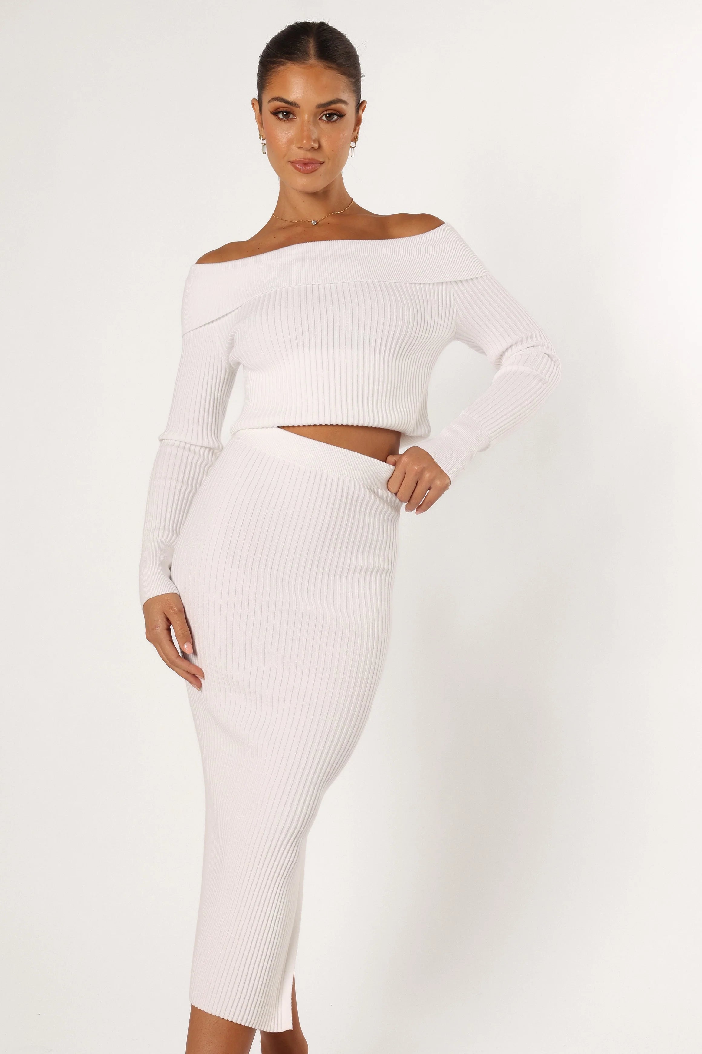 DETAILS The Charlotte Knitted Set in white is a must-have for any fashion-forward individual. This top and skirt set features an off the shoulder style neckline, providing a flattering and trendy look. The midi length knit skirt is perfect for any occasion, from casual to formal settings.