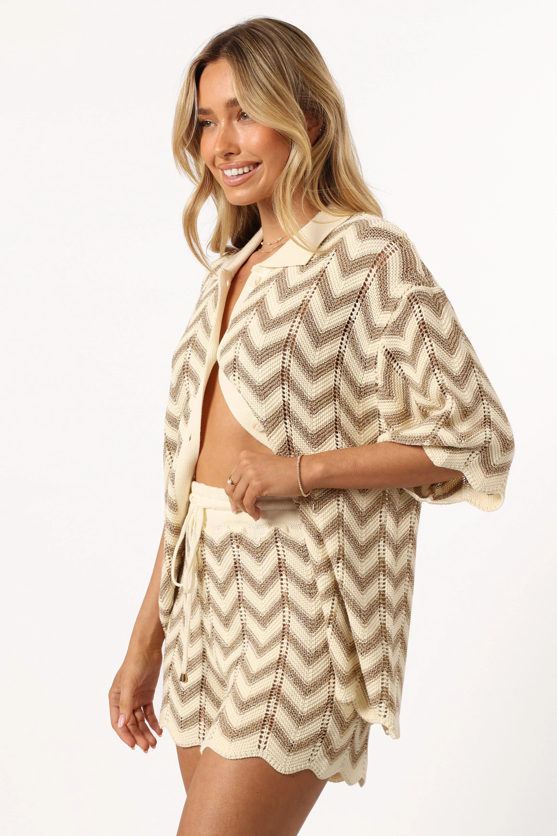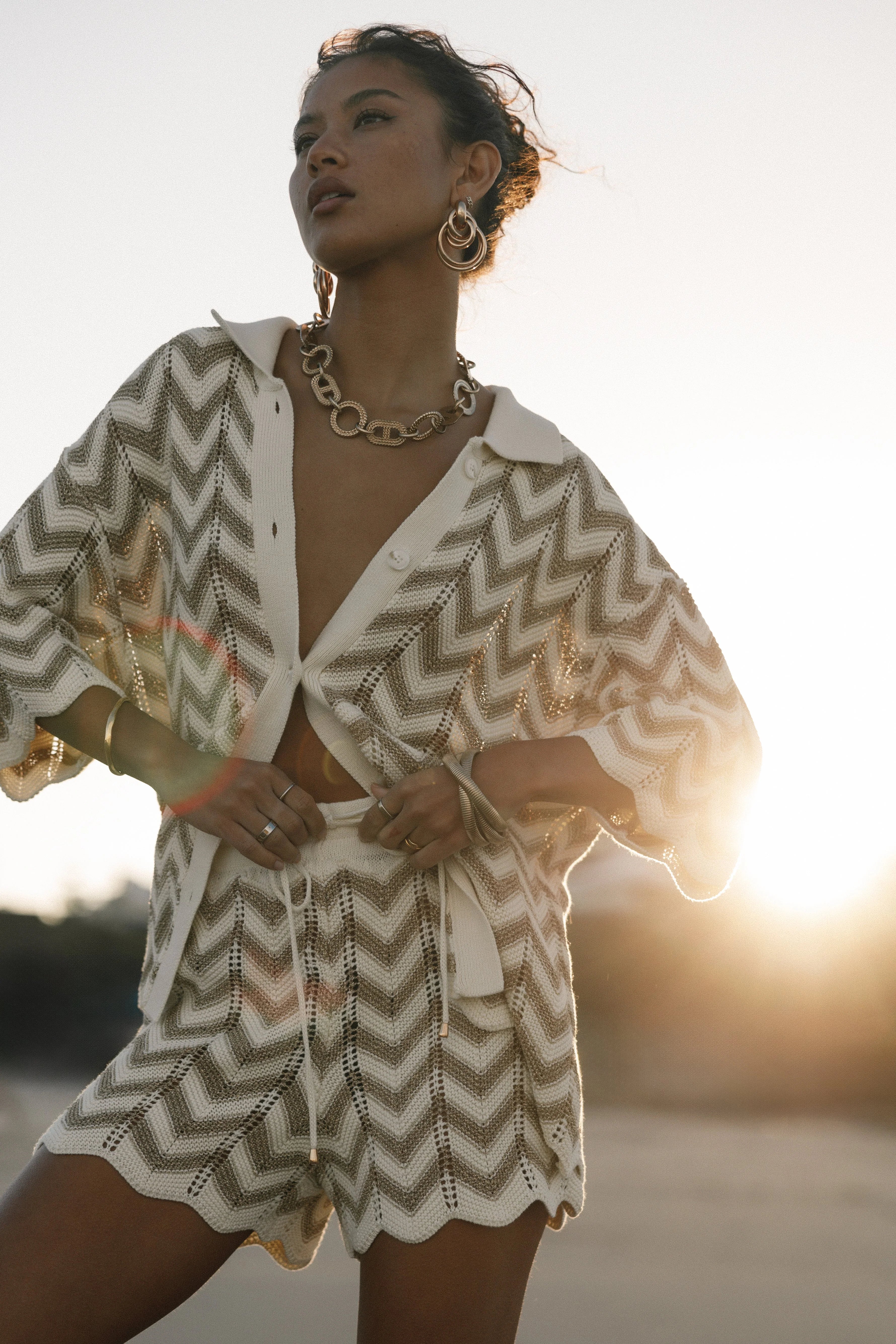 DETAILS Dare to be effortlessly chic with our 'Cherie Knit Shirt' in sand white. Its button-down design, V-neckline, and short sleeves make it a stylish must-have for your wardrobe. With a sleek spread collar and a trendy stripe pattern, this shirt serves up some serious fashion vibes.