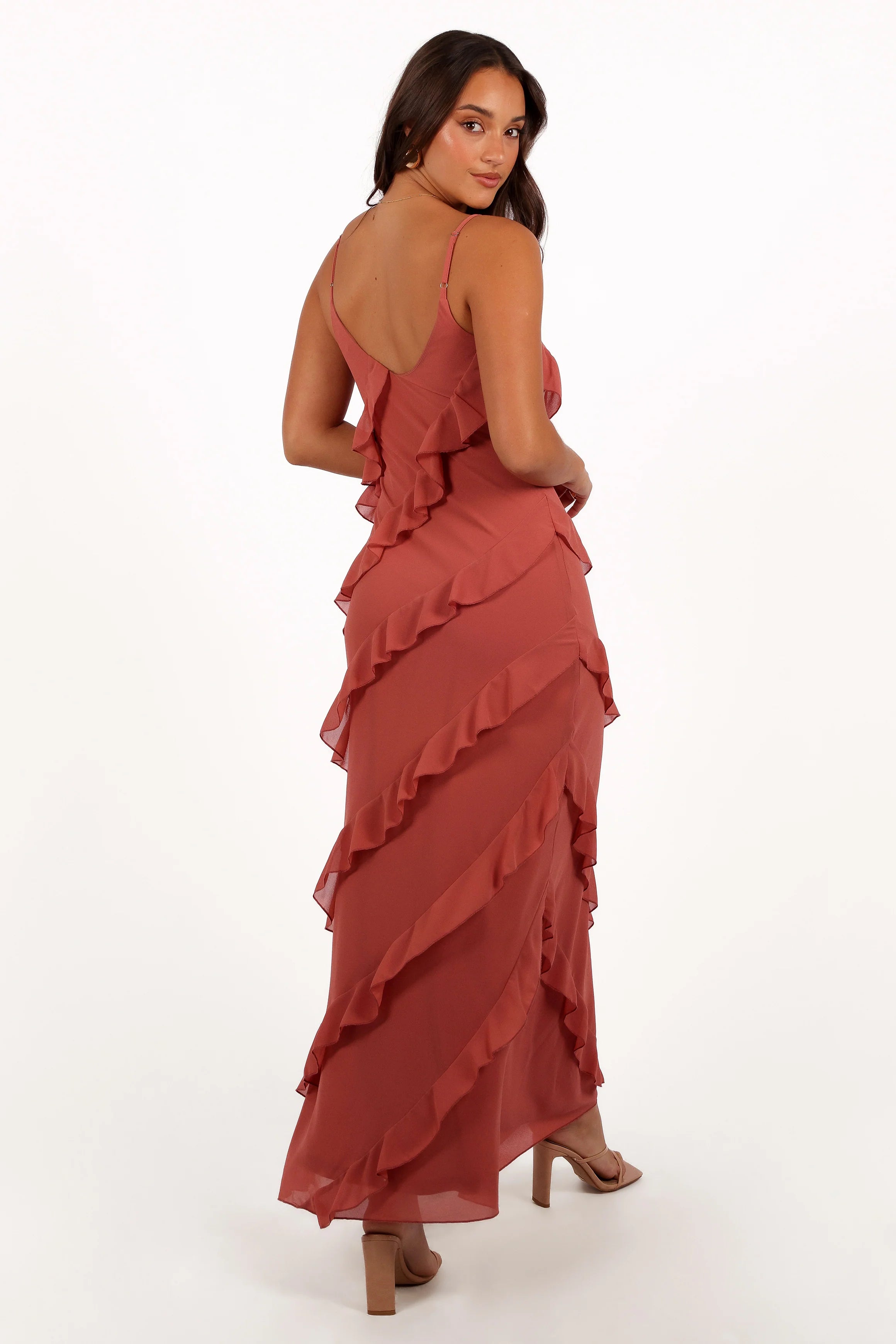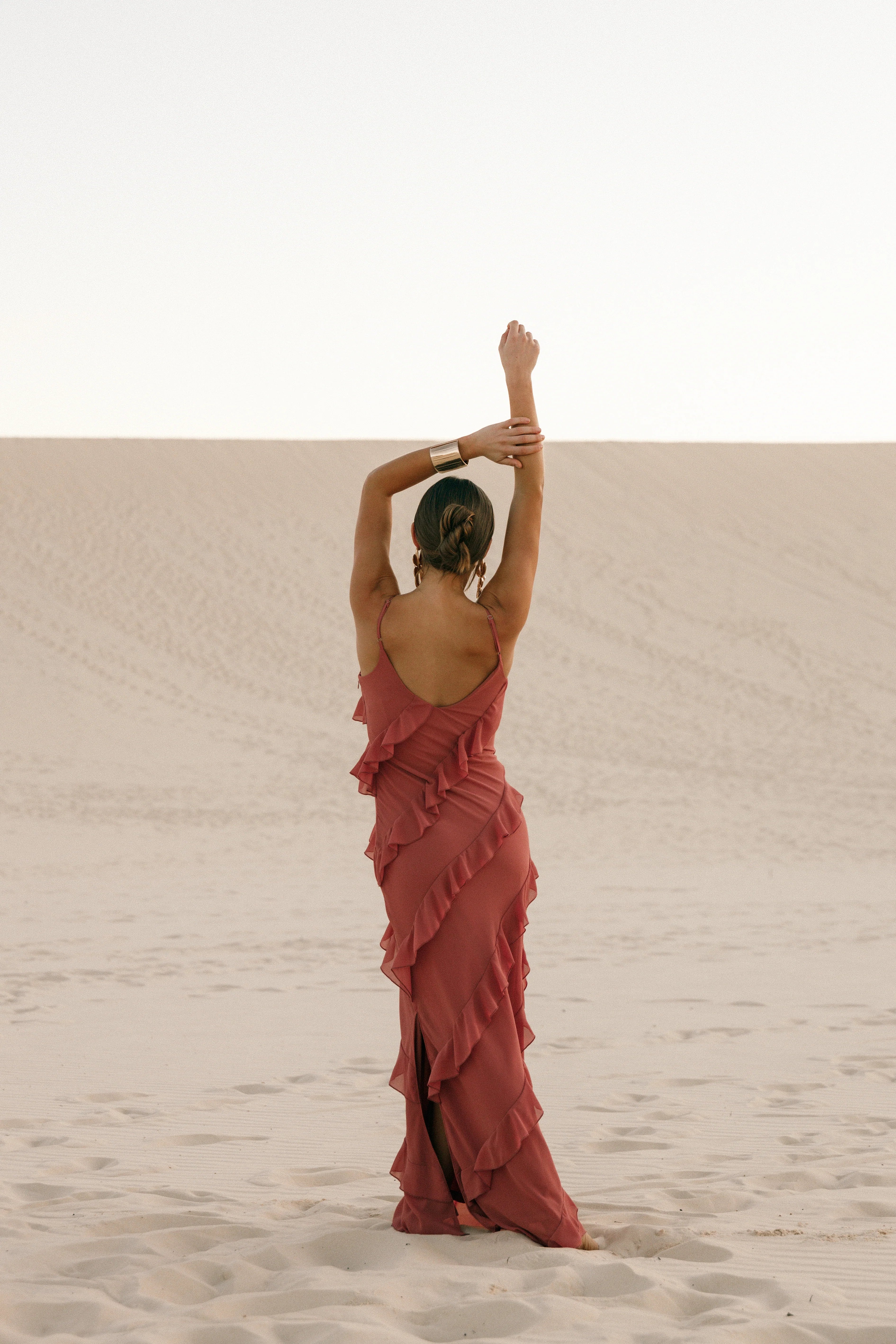 DETAILS Are you ready to dress up for your next event? Look no further than our Ciao dress! This maxi length dress features a flattering v neckline, thin adjustable straps and an invisible side zip. The back of the dress is enhanced with a beautiful v detail. It also includes a ruffle feature which will make you stand out from the crowd.