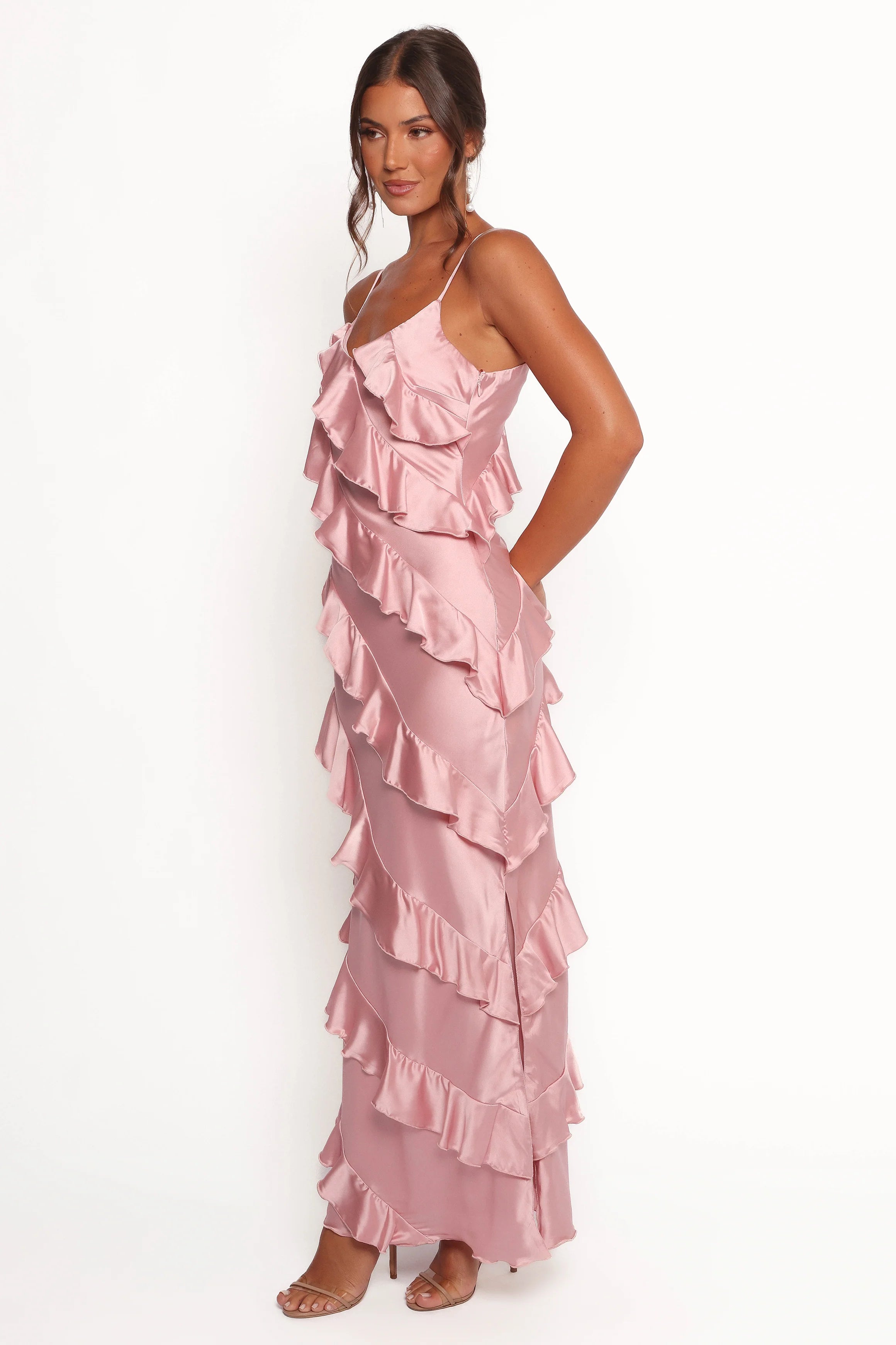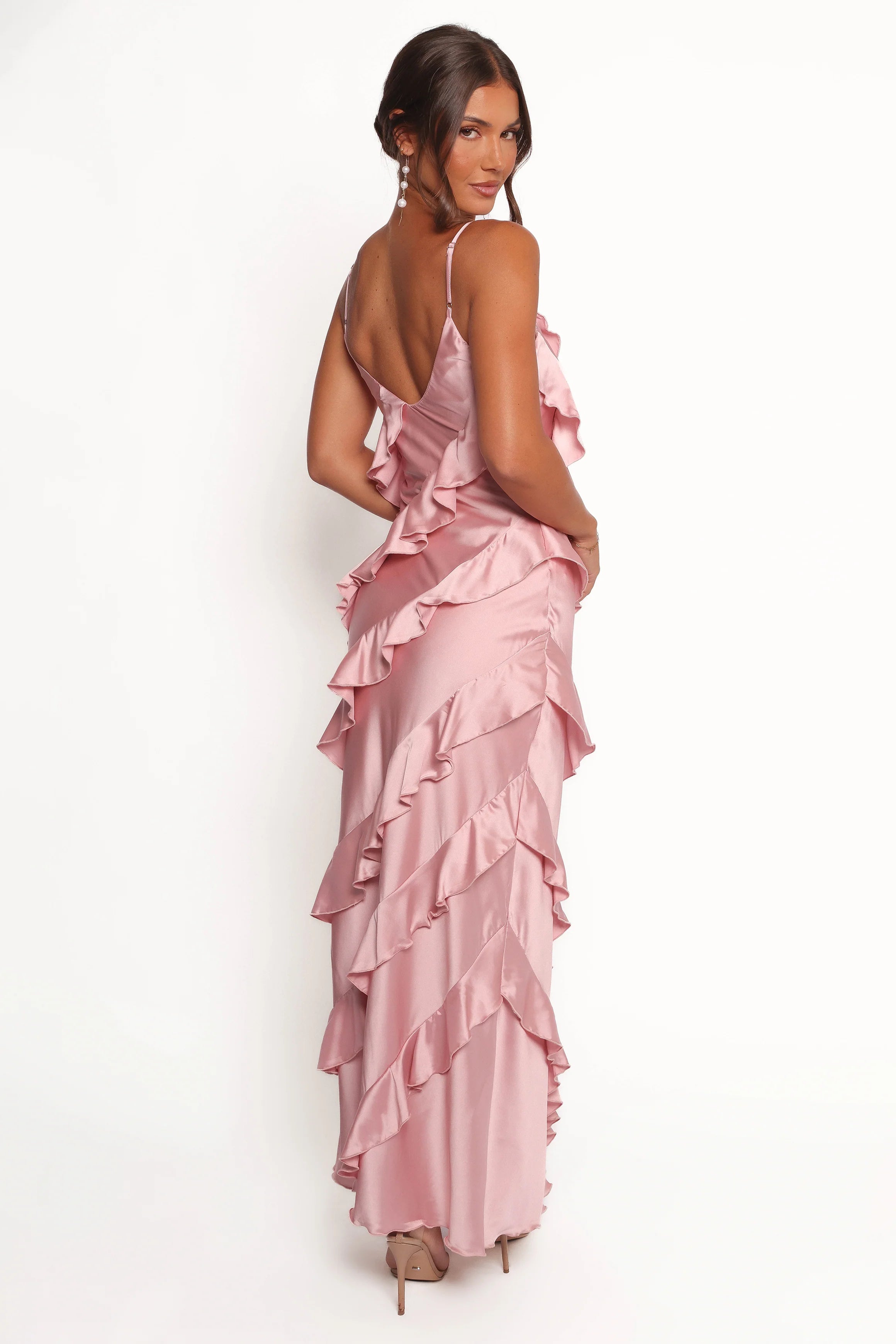 DETAILS Step into the spotlight with the Ciao Ruffles Maxi Dress in Pink. This eye-catching piece combines elegance and playfulness, making it the perfect addition to any wardrobe. The maxi length and v neckline create a silhouette that's both sophisticated and effortlessly chic, while the thin adjustable straps and invisible side zip ensure a tailored fit that flatters your figure.