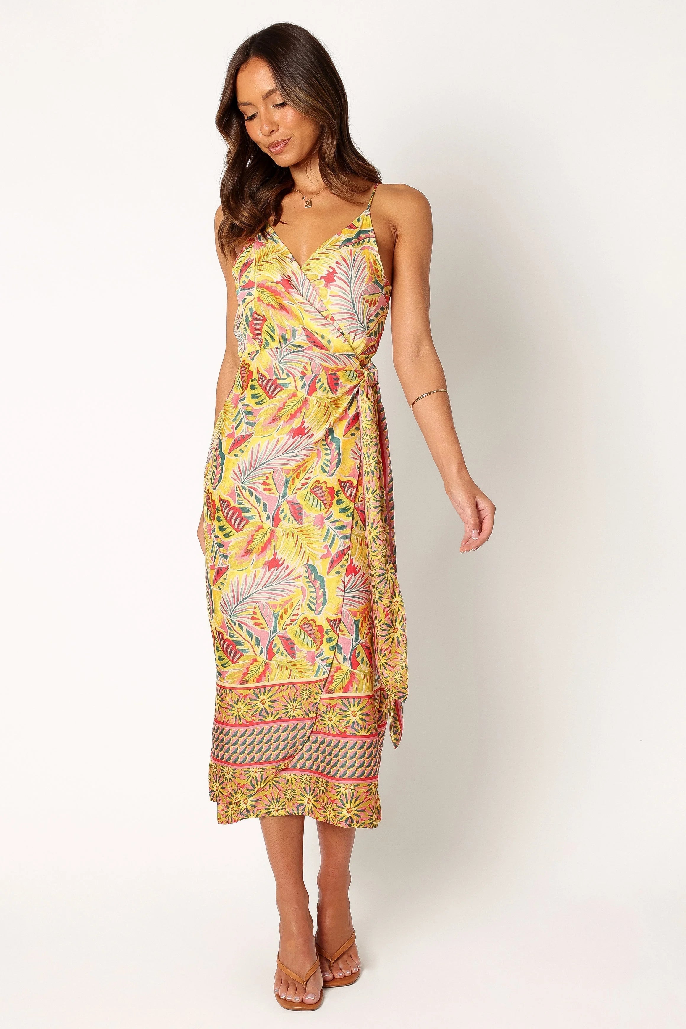 DETAILS Our beautiful Clement Wrap Midi Dress makes a great addition to any summer wardrobe. The comfortable thin adjustable straps allow you to adjust the fit of this dress just the way you like it, and the attached waist tie closure adds extra security.