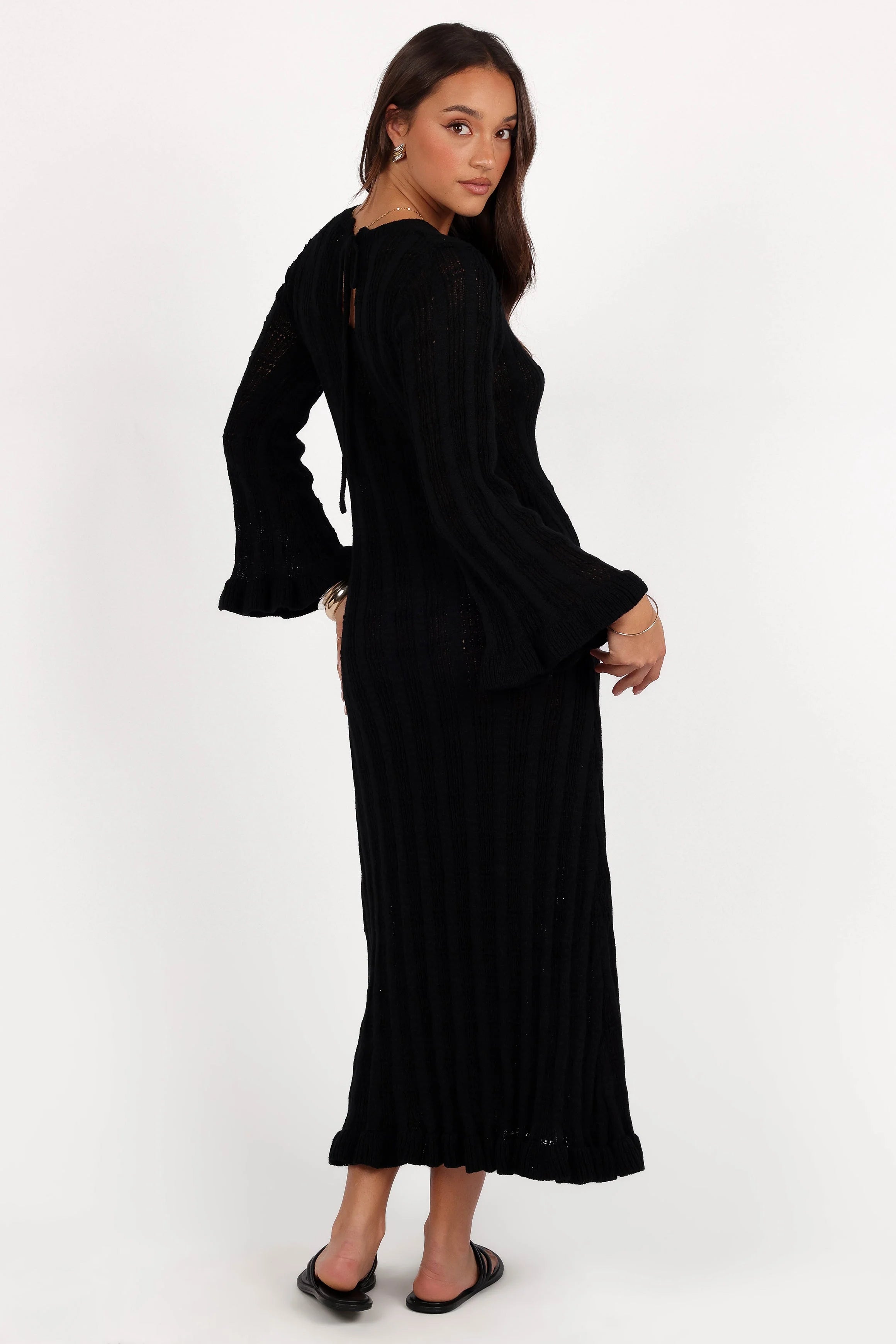 DETAILS Look sophisticated and feel fabulous in this maxi length knit dress. The round neckline and long frill sleeves give it a fun classic look. Crafted from stretch ribbed knit, this dress features a A-line skirt design for a flattering fit.